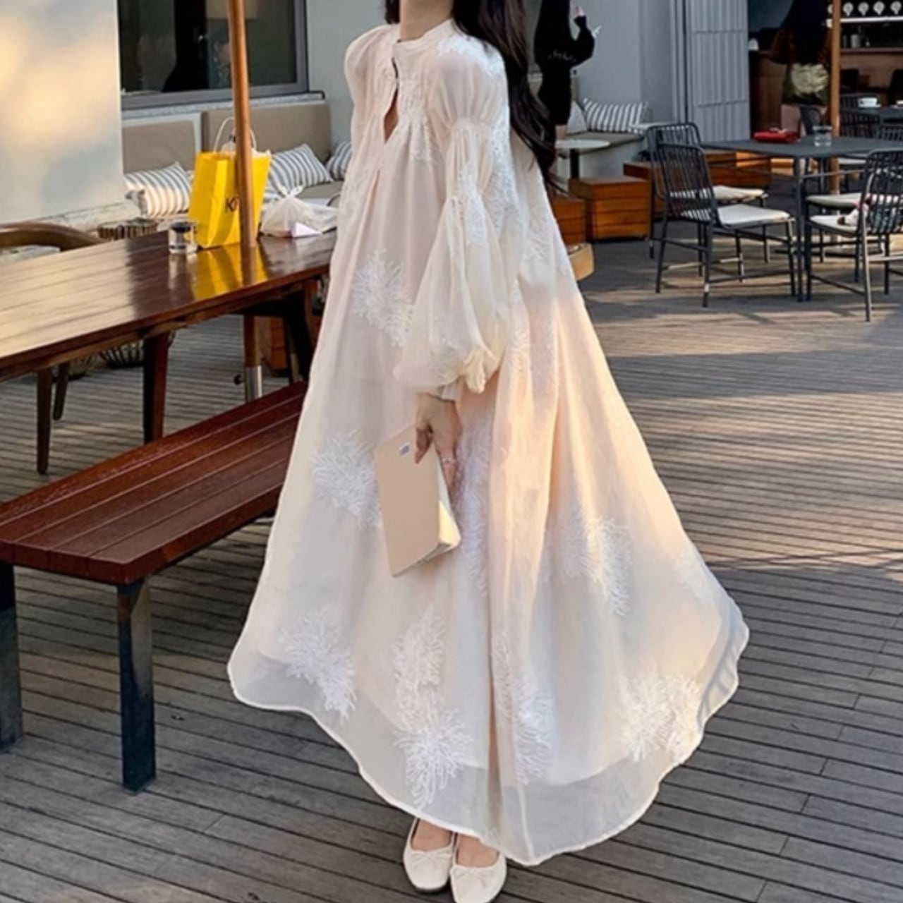 ゆったりめシルエットで大柄ながらも繊細で上品なフラワー刺繍が目を惹く、フレンチテイストのワンピース。
