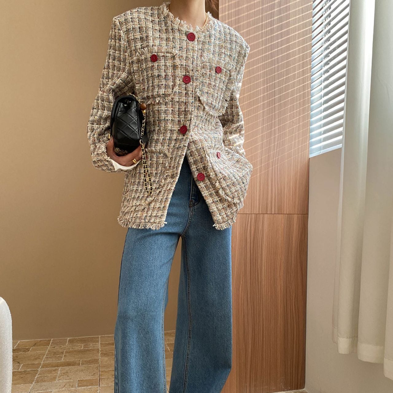 目を惹くレッドボタンとベーシックカラーのツイードのコントラストが誰でもこなれ感と、都会的なお洒落上級者に。