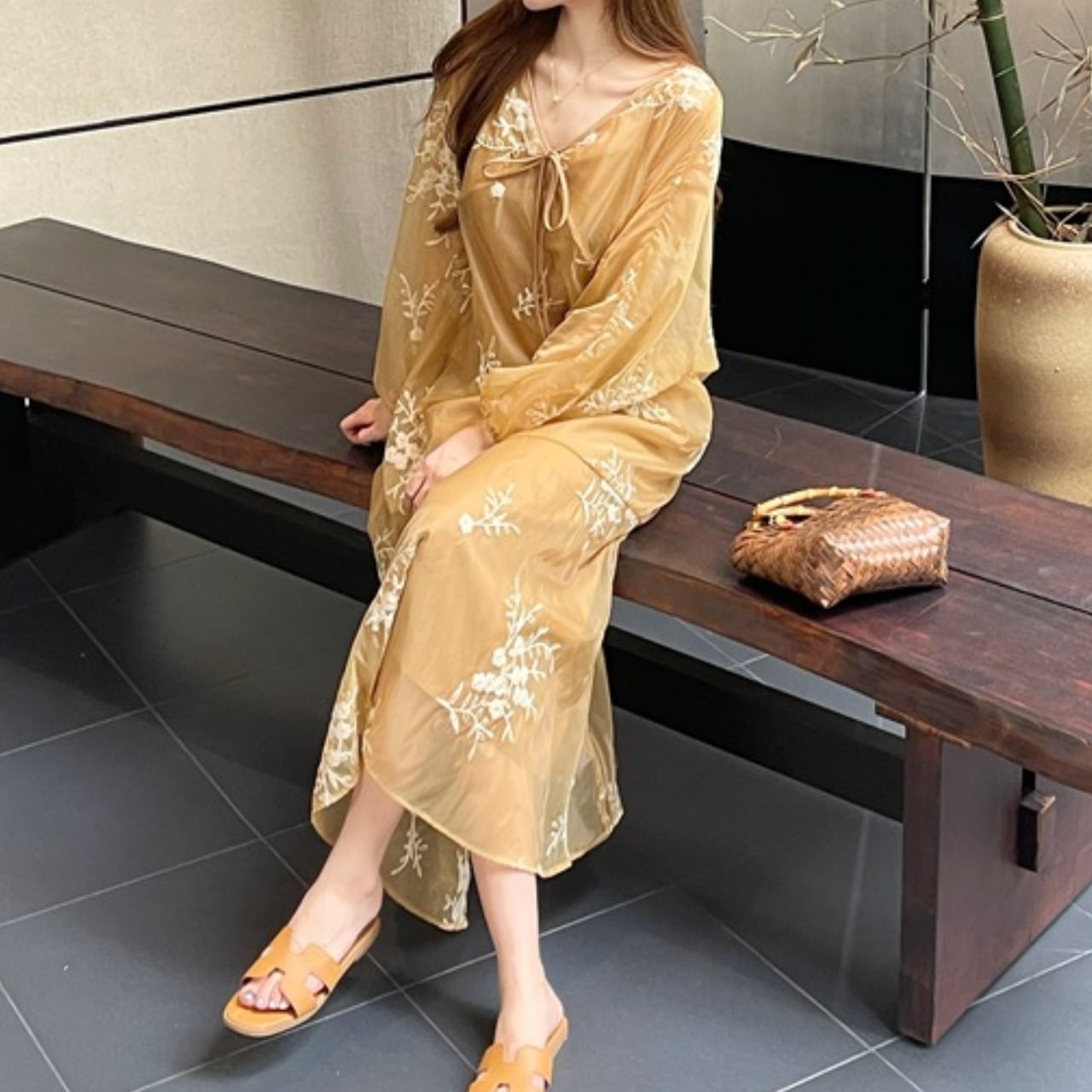 フラワー刺繍が目を引くVネックデザインのオーガンジーワンピース。