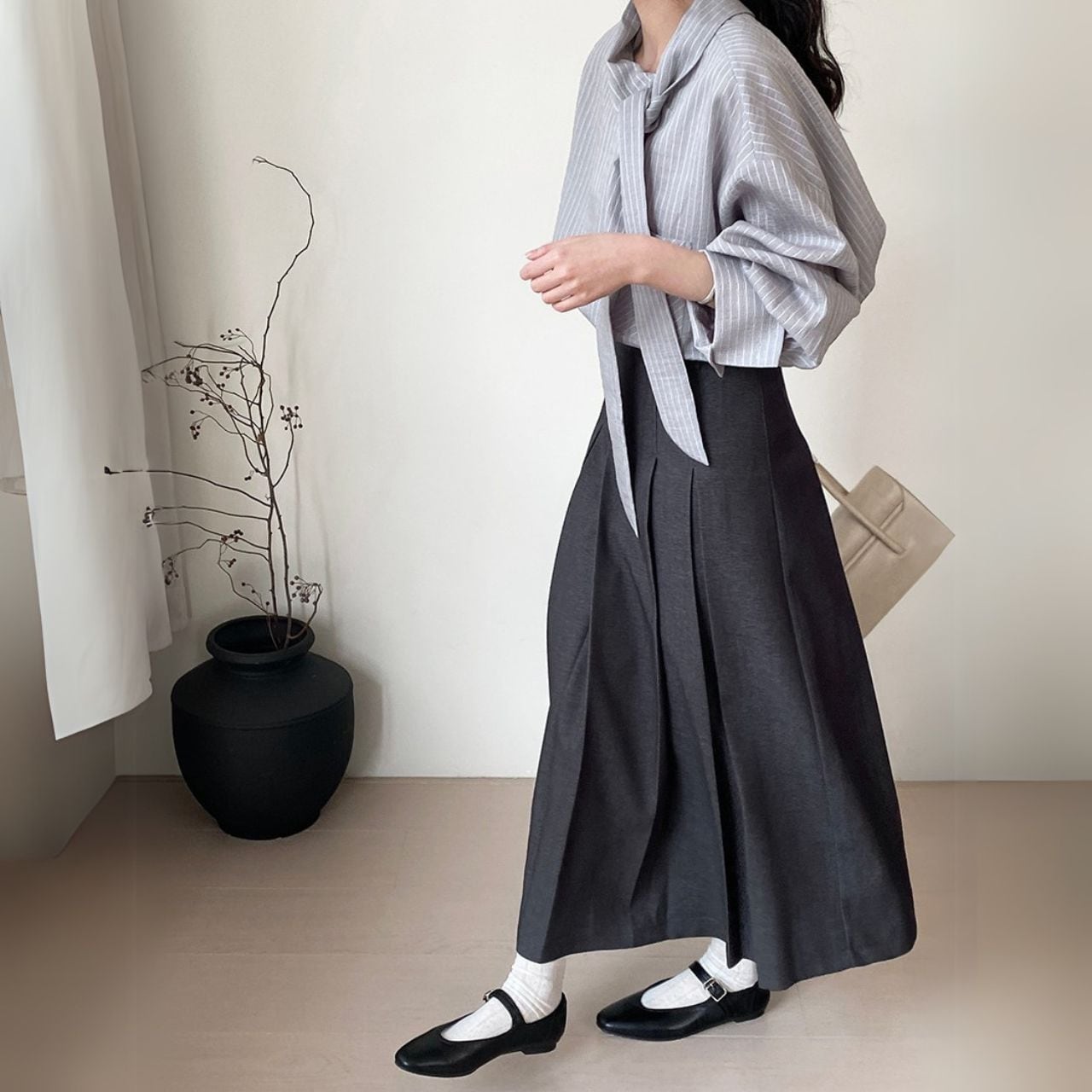 幅広デザインされたプリーツ仕立てが魅力で、上品さを感じさせる一着です。