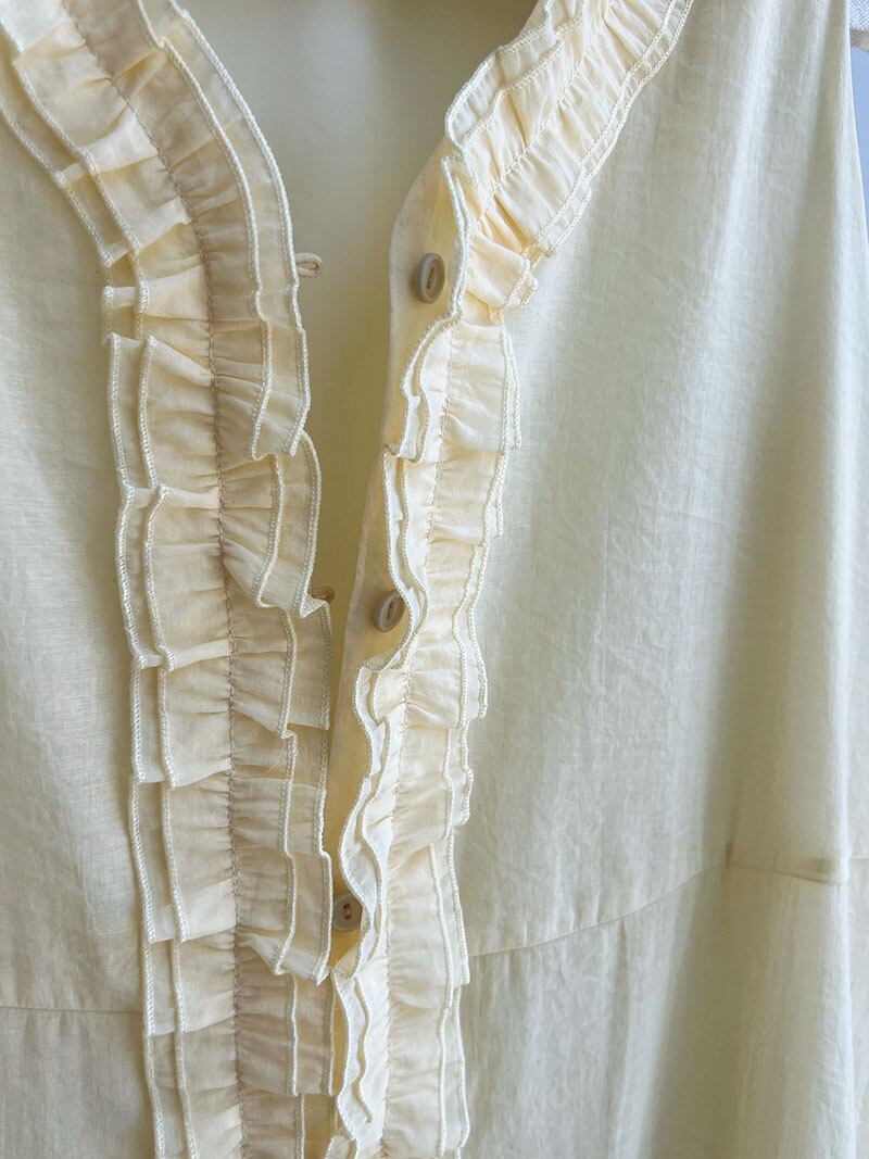 エレガントなフリル使いと、女性らしいシルエットを演出するギャザーが特徴。