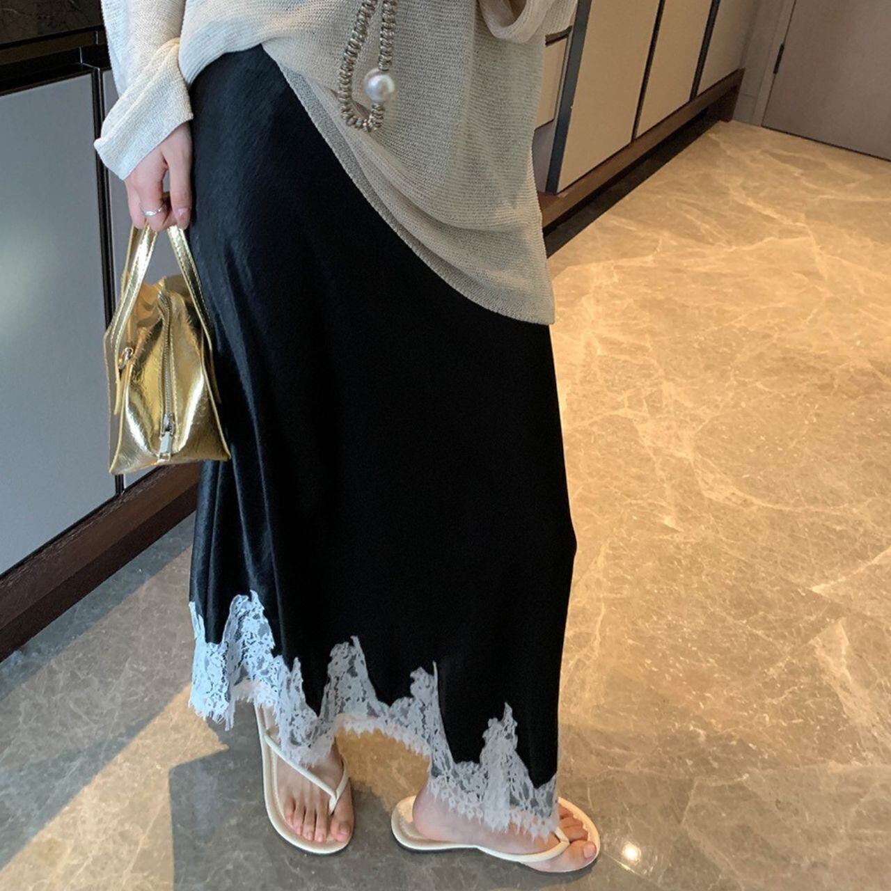 裾レースデザインがレディな雰囲気のサテンフレアスカート。