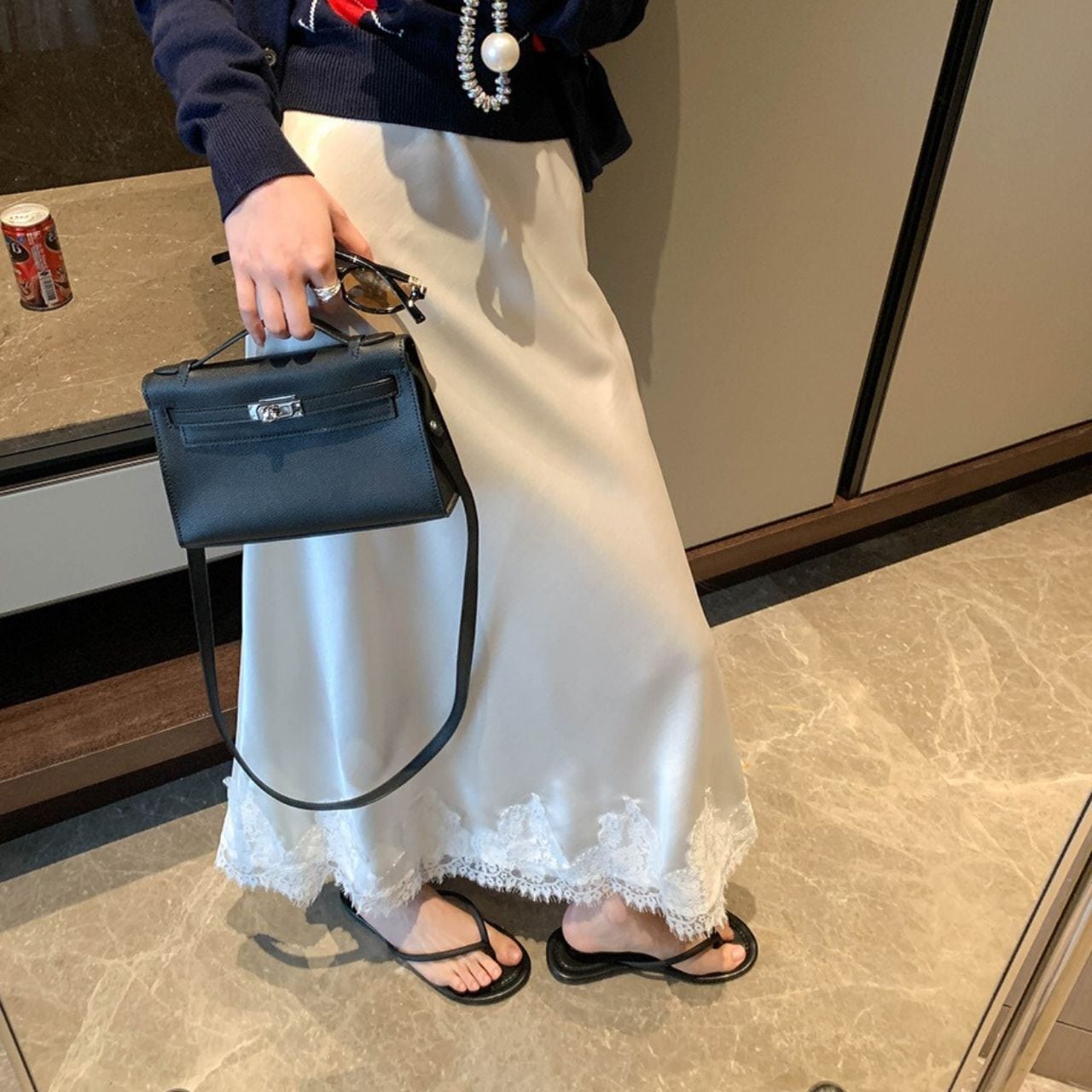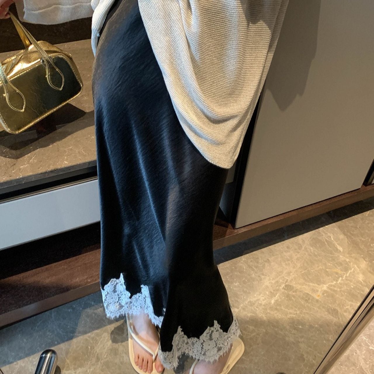 サテン素材の上品な光沢感と、裾に施されたレースが女性らしさを引き立てます。