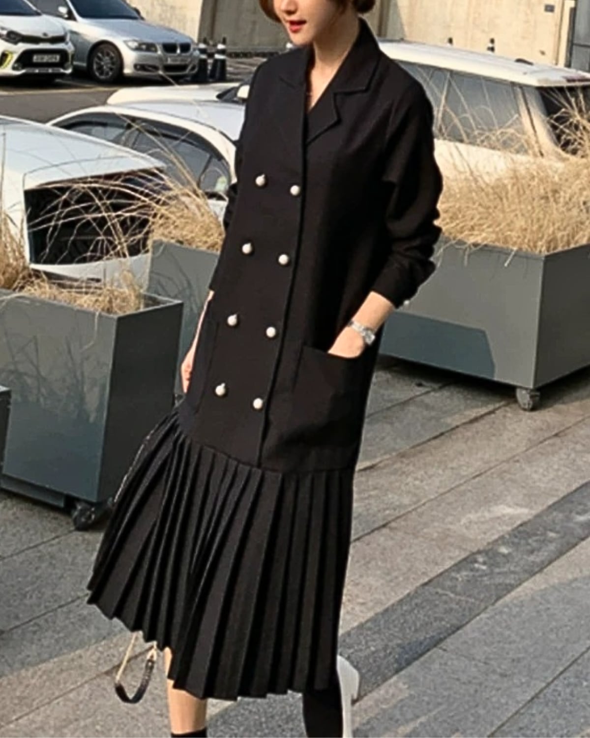 洗練されたダブルボタンのデザインとVネックが魅力のプリーツワンピース。