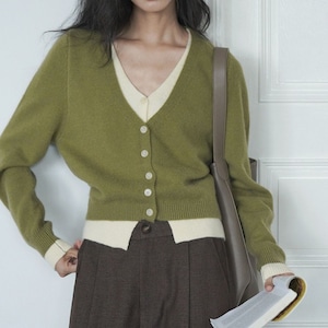 Vネックデザインで顔周りをスッキリ見せ、パンツにもスカートにも合わせやすいので様々なシーンで大活躍するアイテムです。