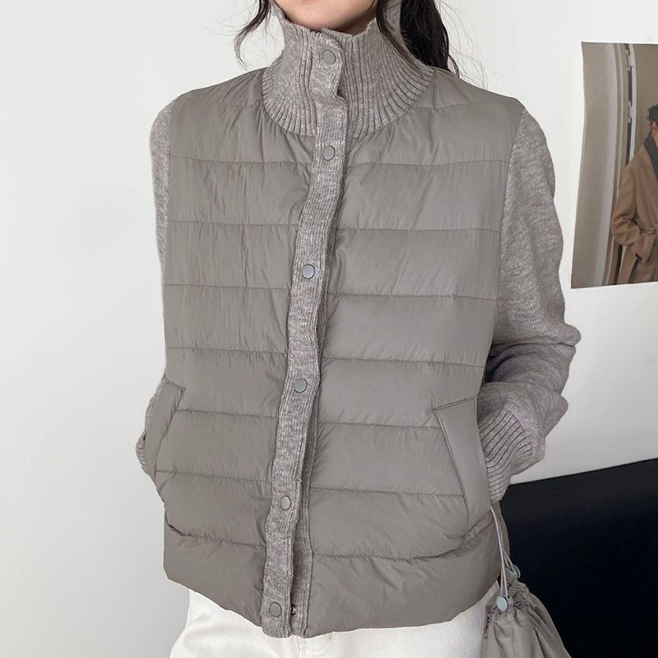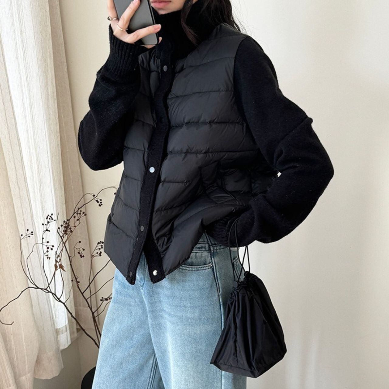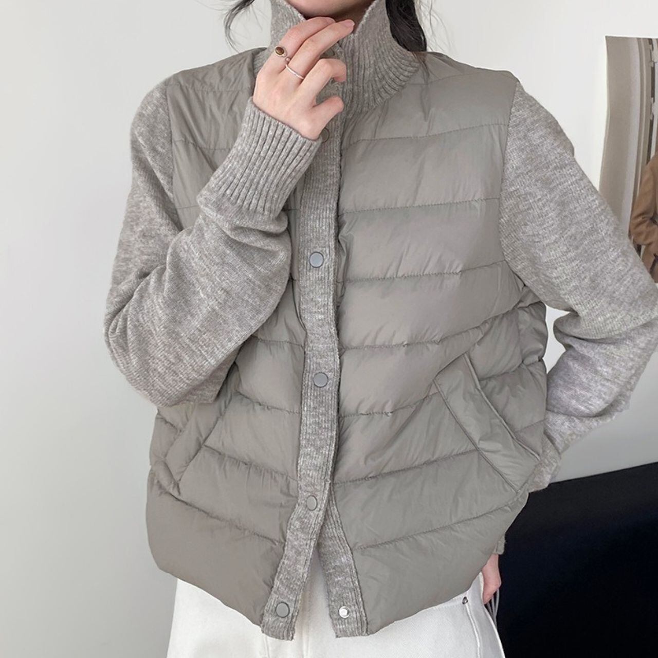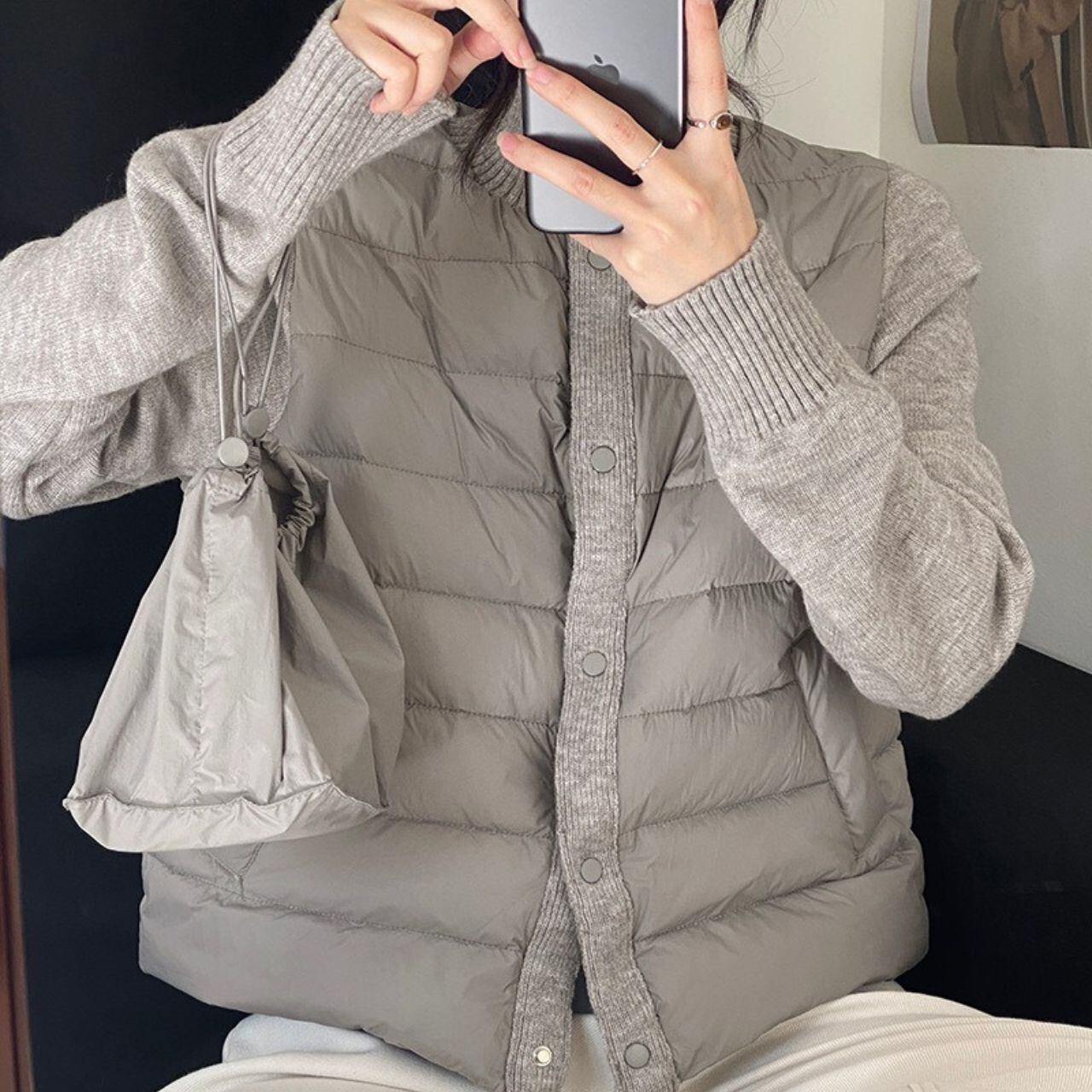 ダウンとニットのコンビネーションが魅力で、温かさだけでなく、スタイルも引き立てます。秋冬のコーディネートにぴったりなアイテムで、カジュアルからドレッシーなシーンまで幅広く活躍します。