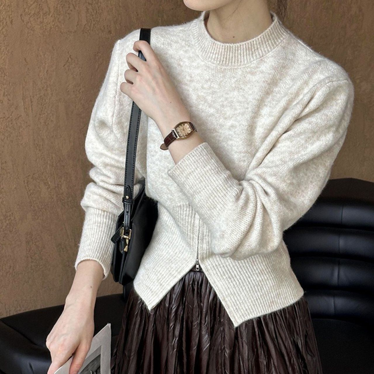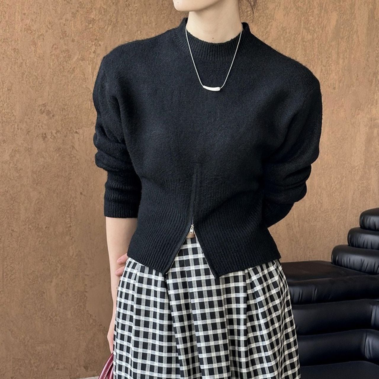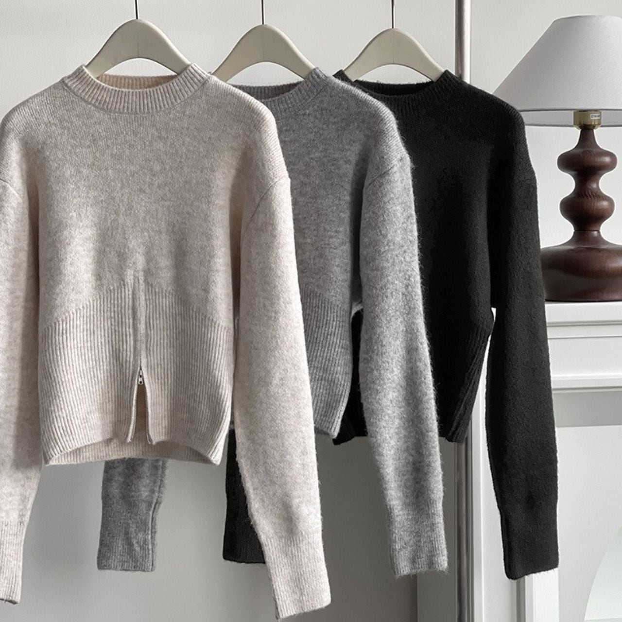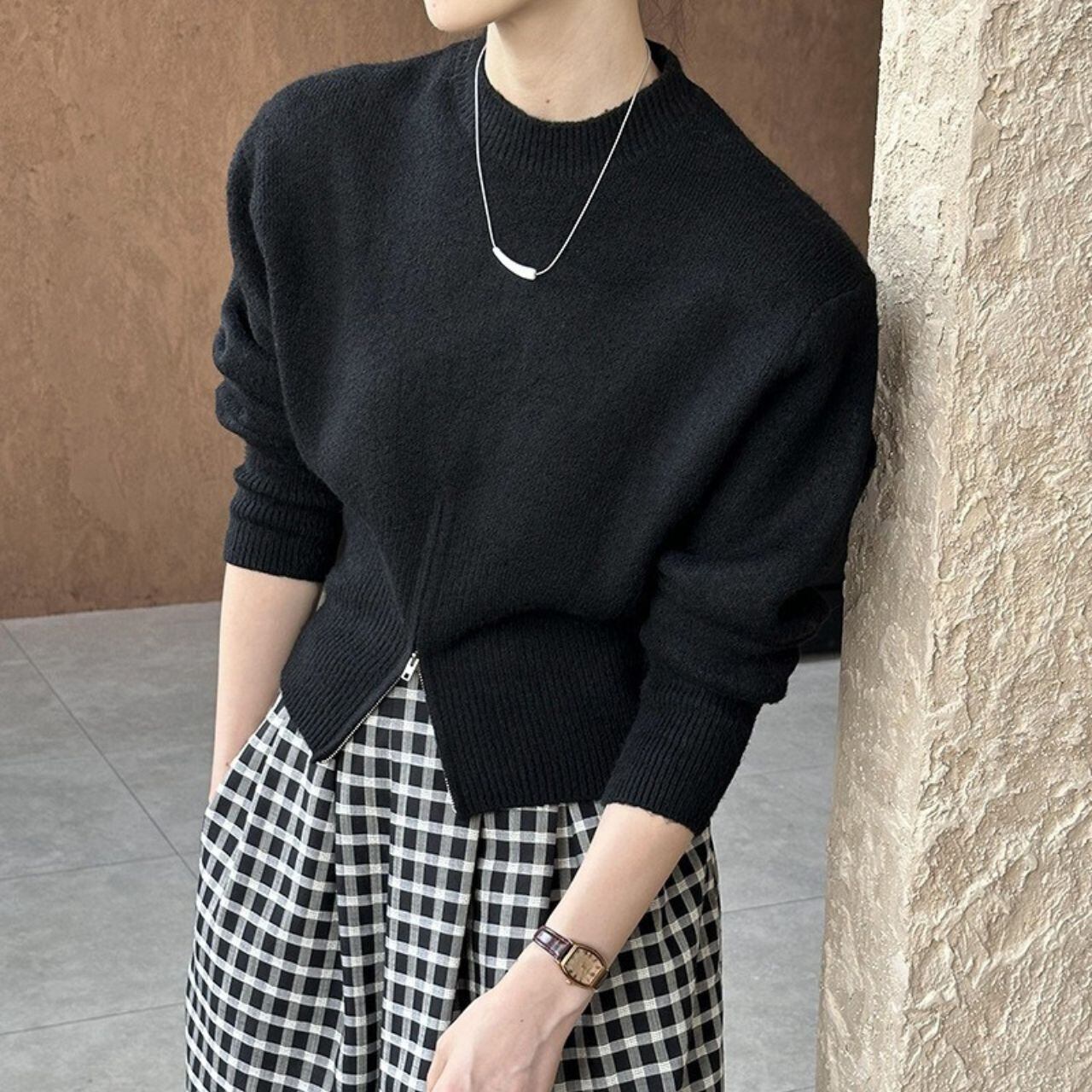 シンプルながらも個性光る裾ファスナーデザインのニットトップス。