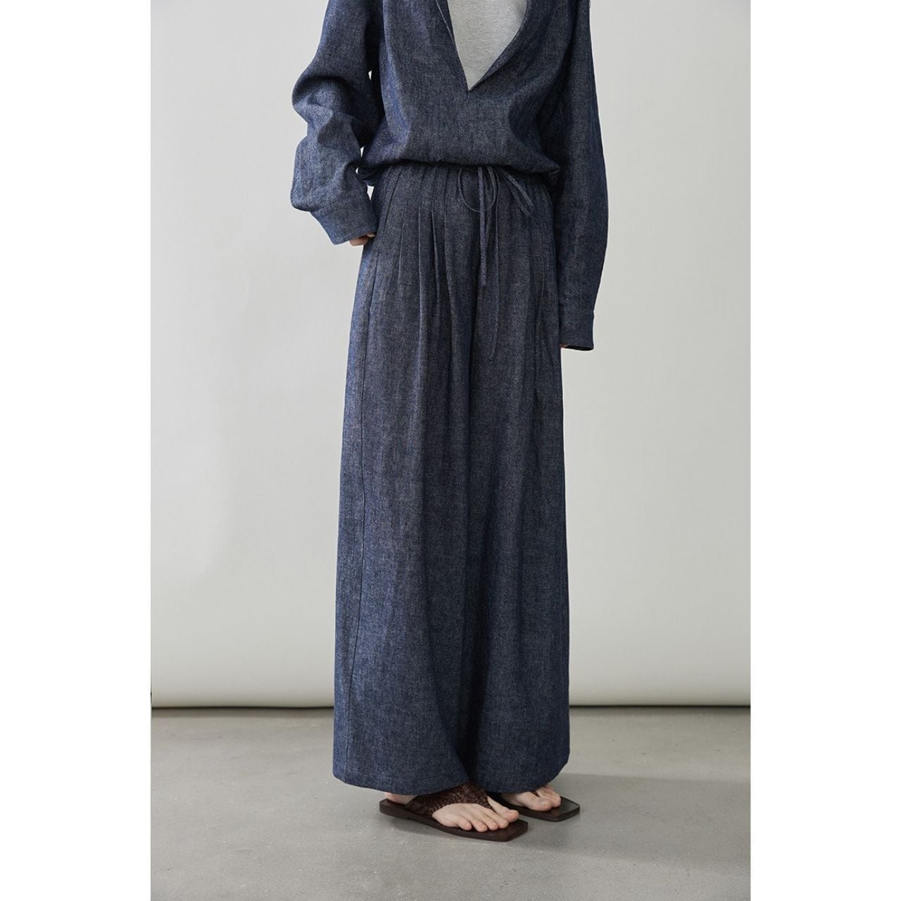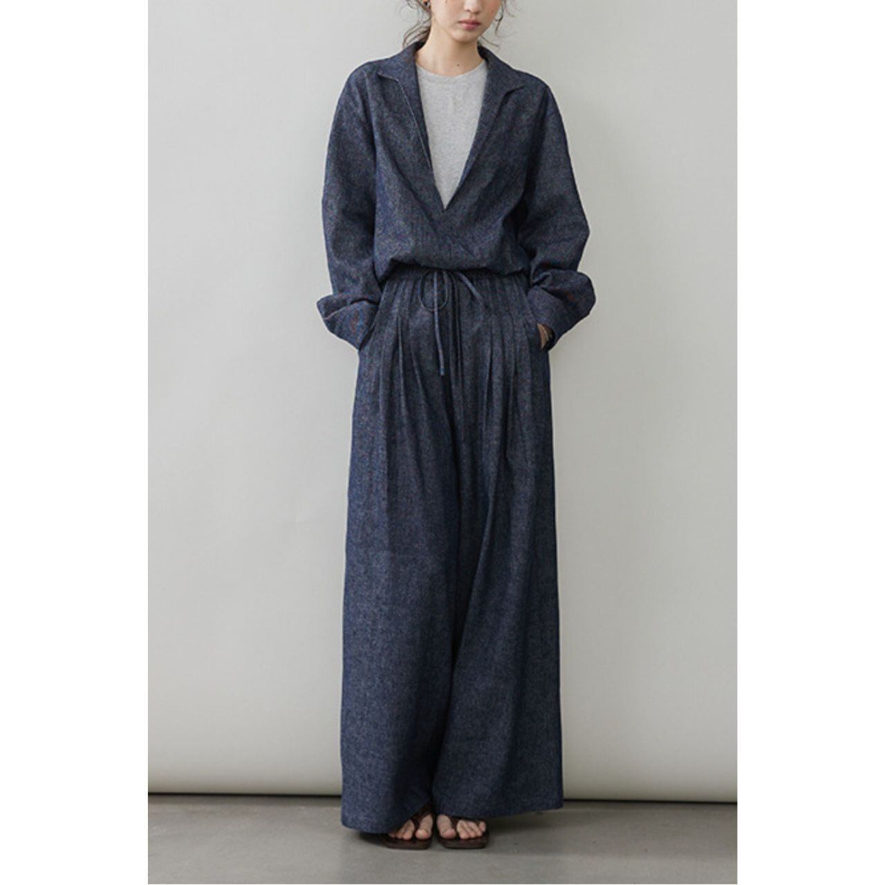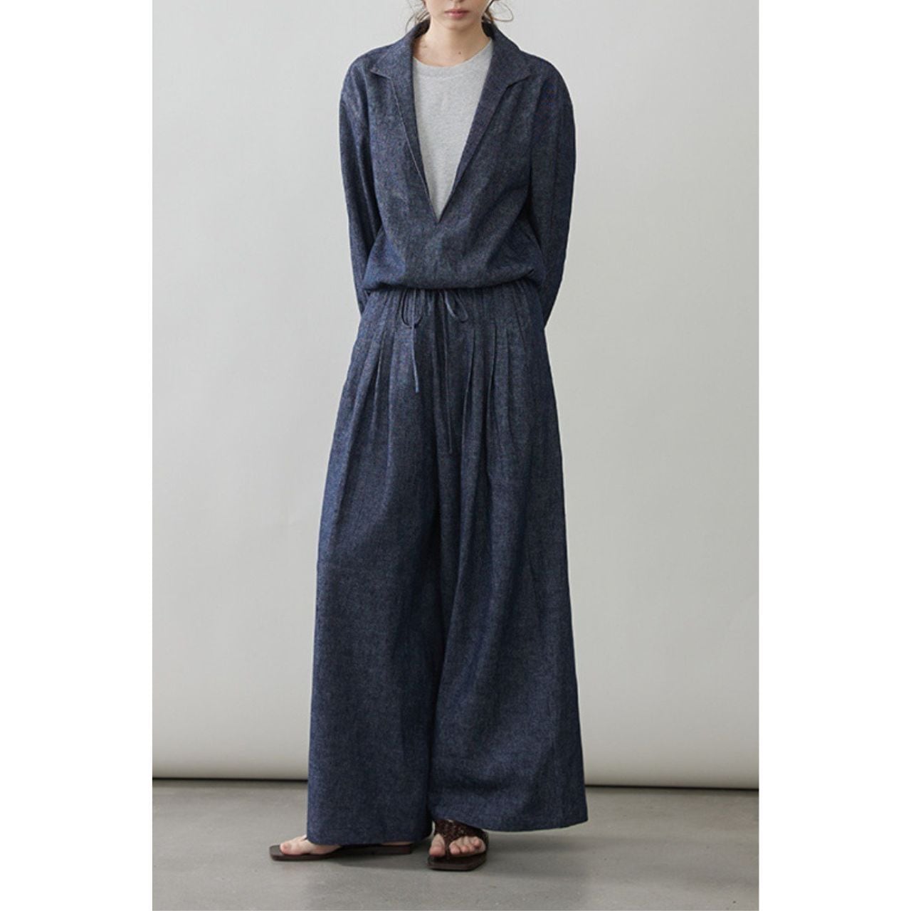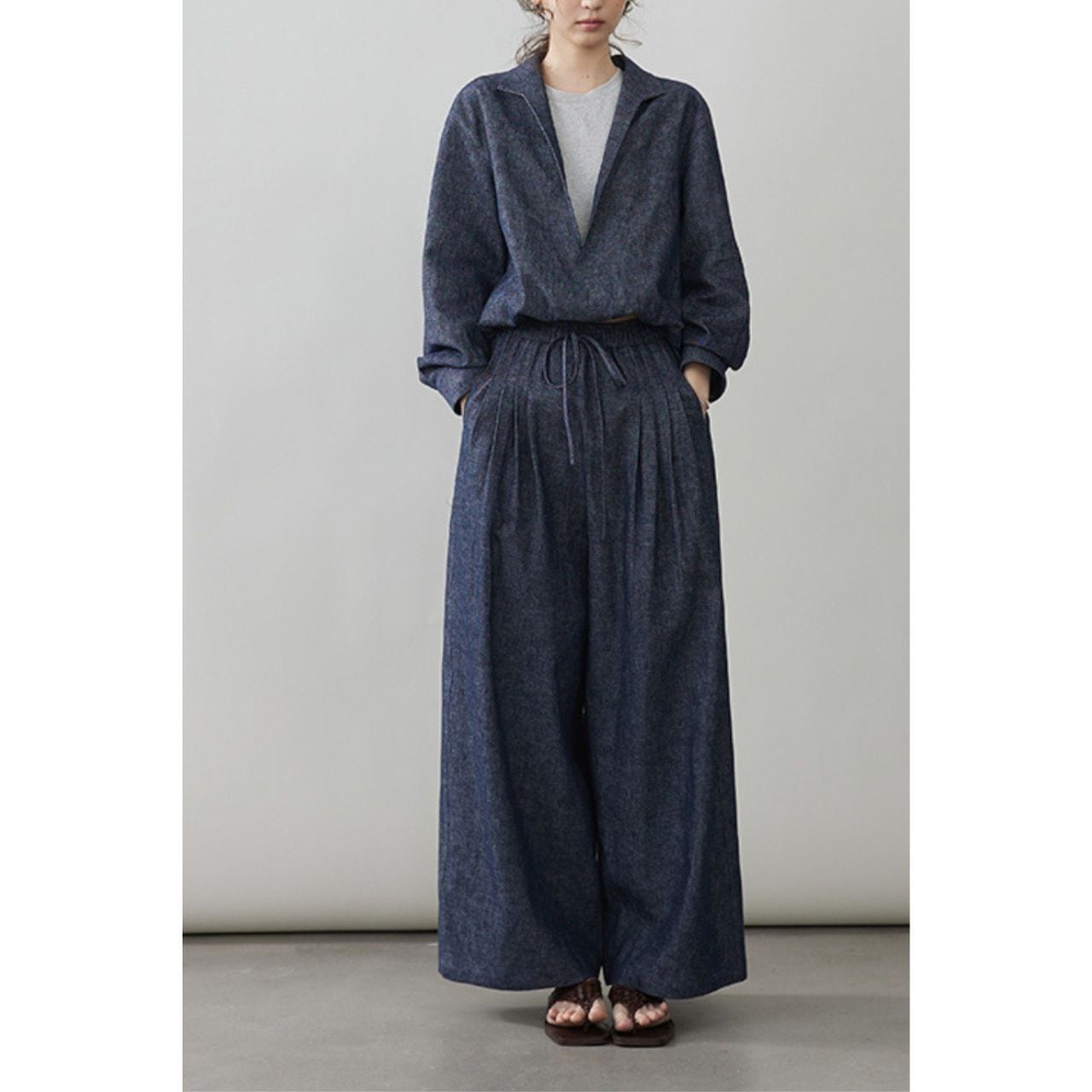 パンツはラインを拾わないワイドシルエットで着心地よく仕上げています。