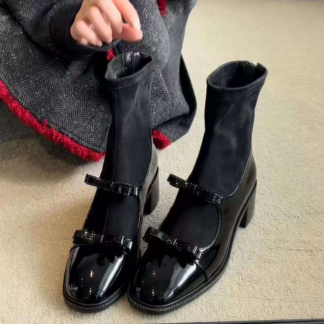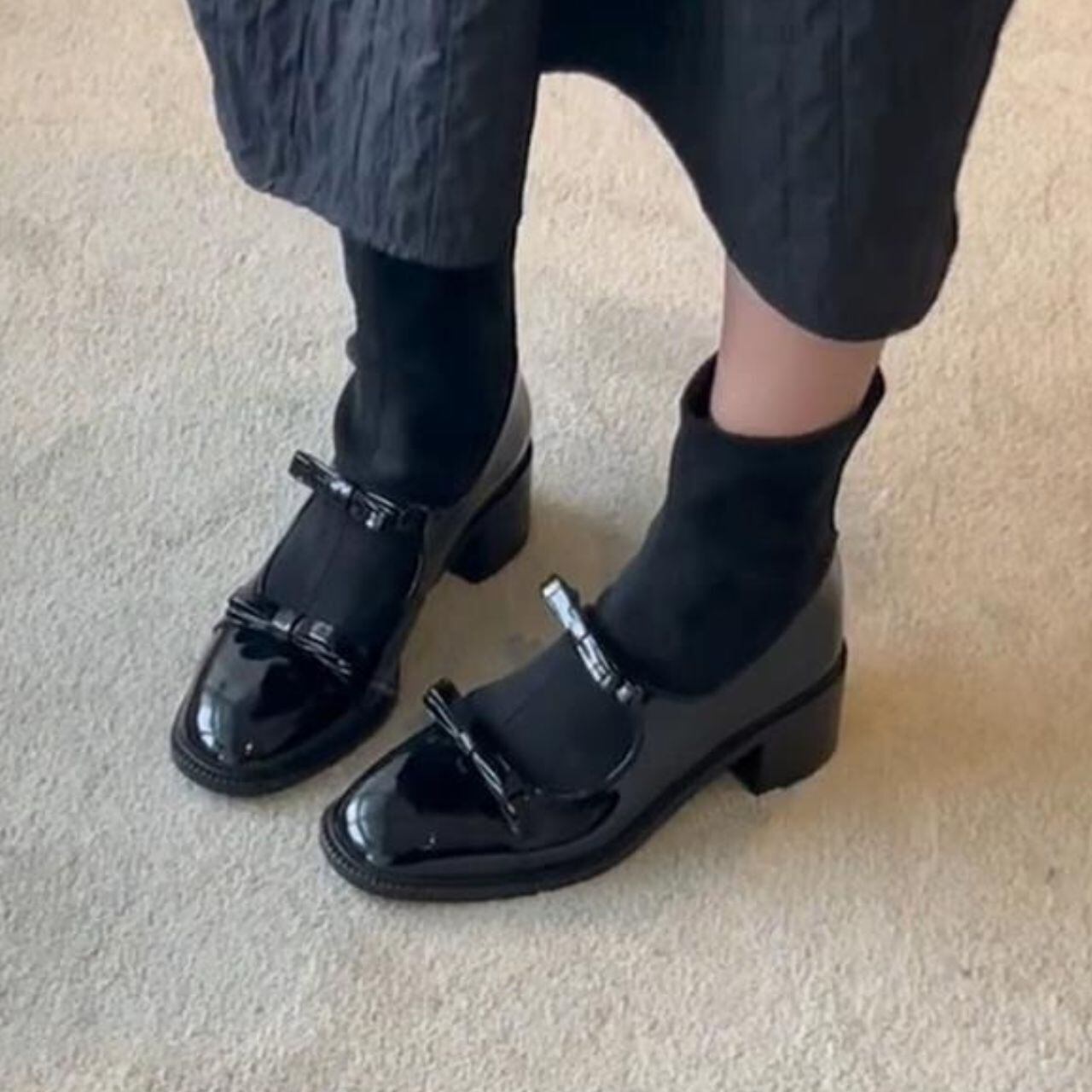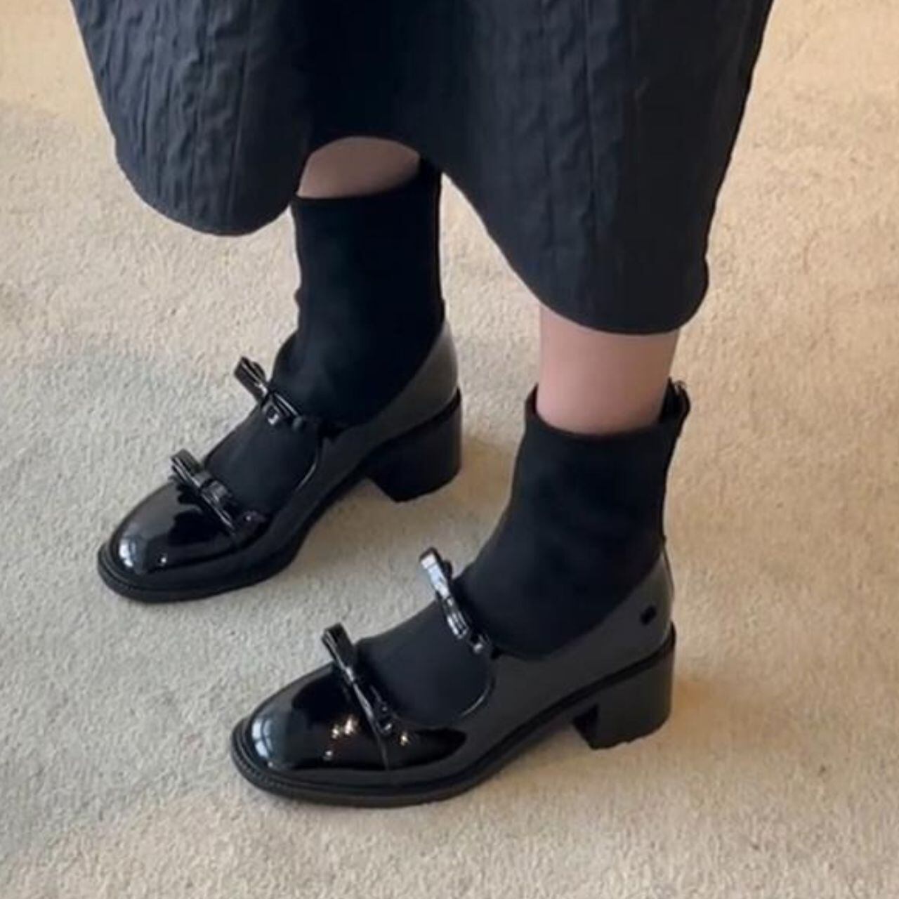 ダブルリボンのデザインが可愛らしさを引き立て、チャンキーヒールが安定感のある歩行をサポートします。