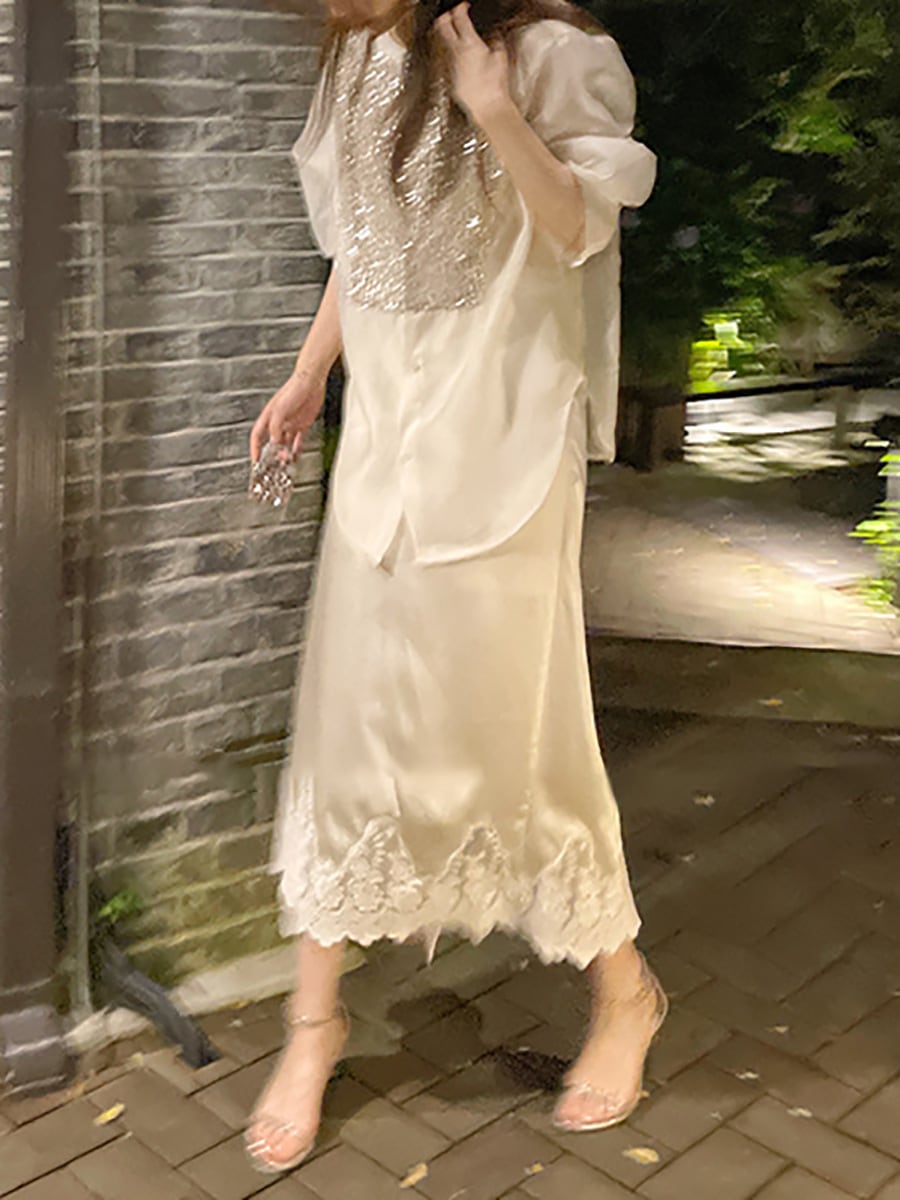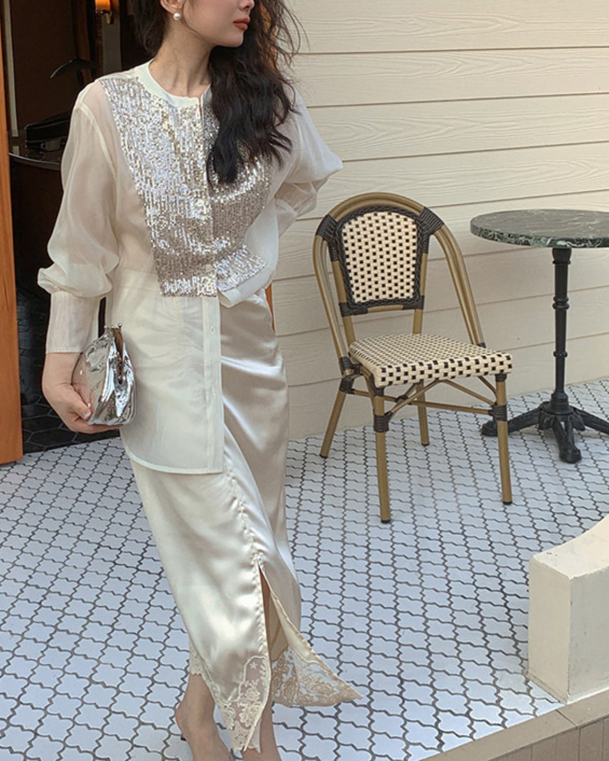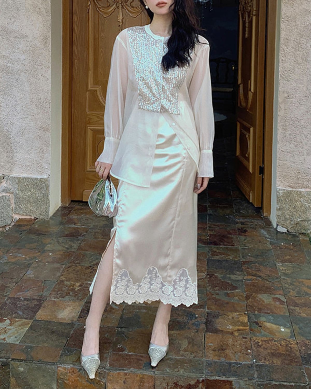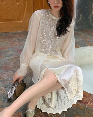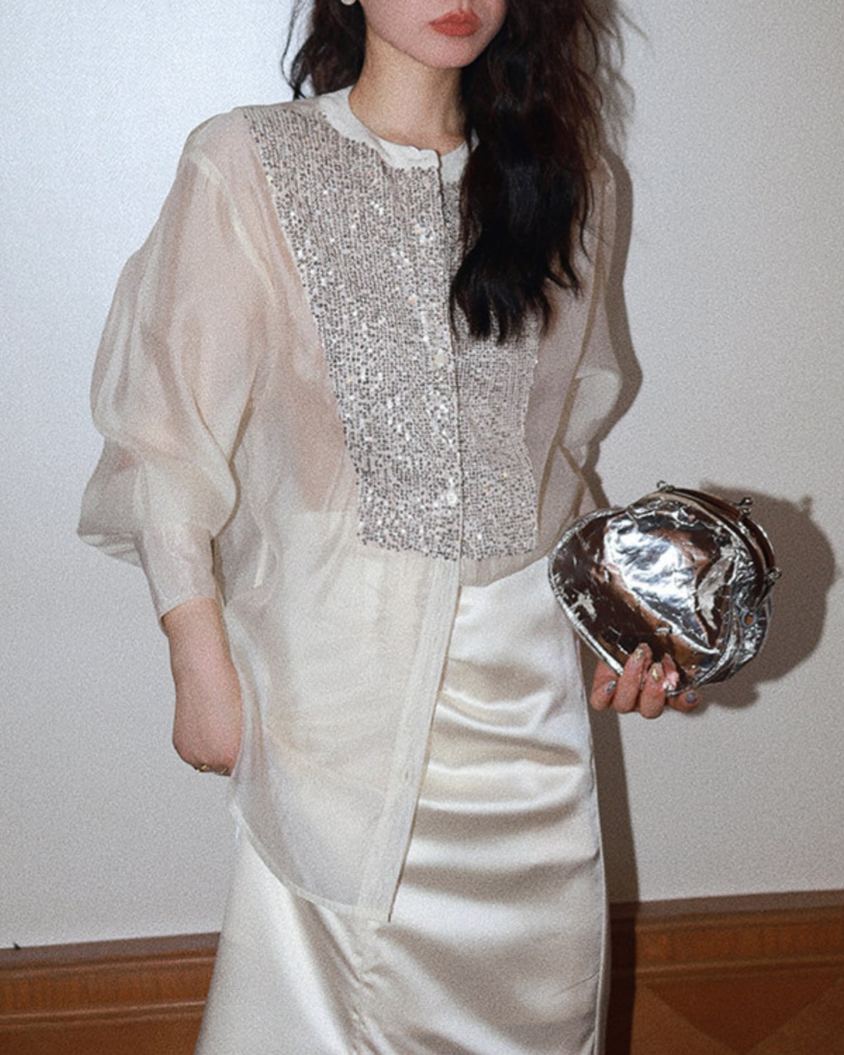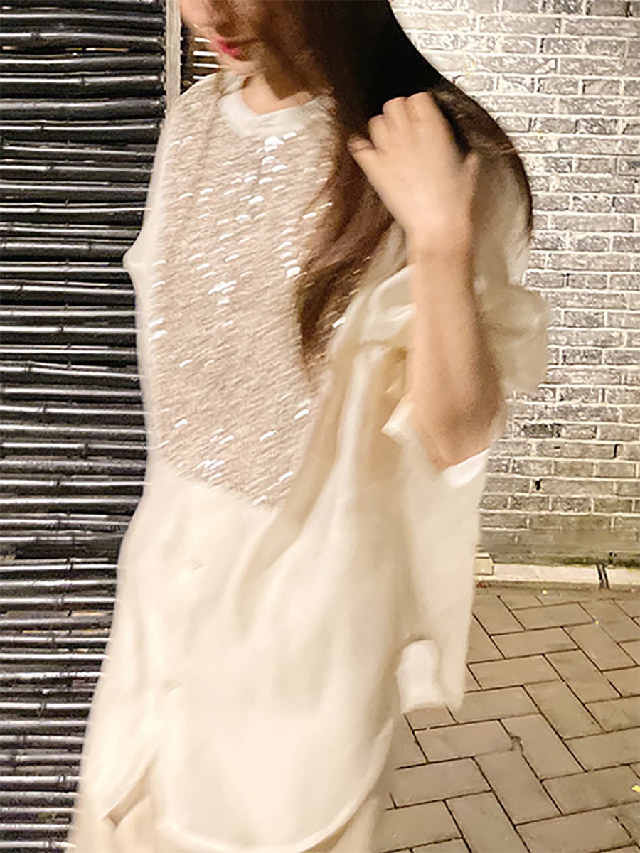 煌びやかに散りばめられたスパンコールが、ラグジュアリー感を演出。日常のコーディネートにも特別感を加えます。シアー素材特有の透け感は、軽やかな印象を与えつつ、エレガントな雰囲気を醸し出します。
