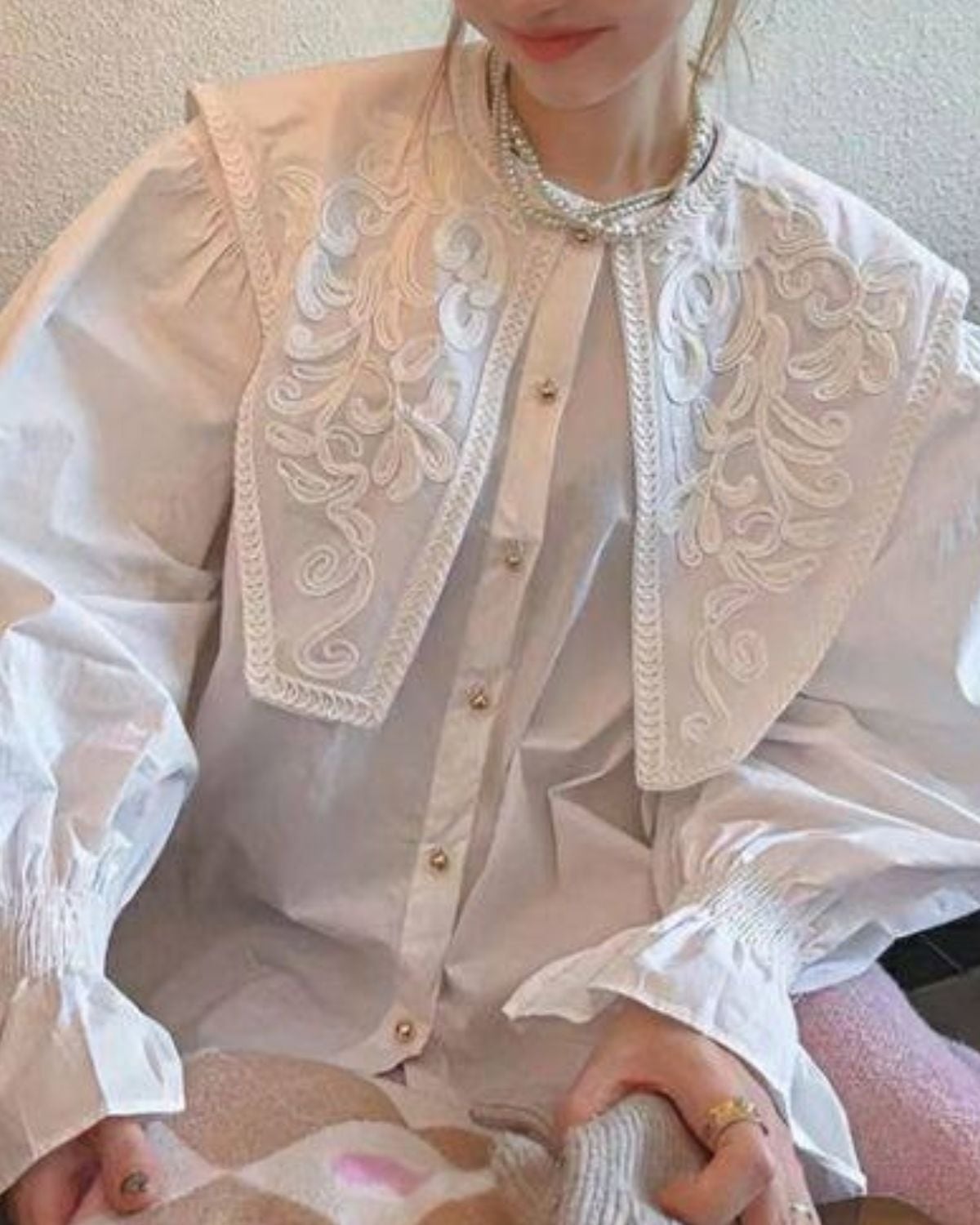 存在感のあるビッグカラーに施された美しい刺繍デザイン。
