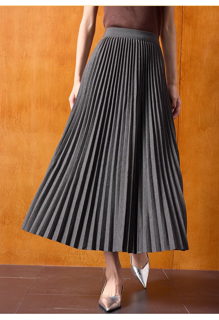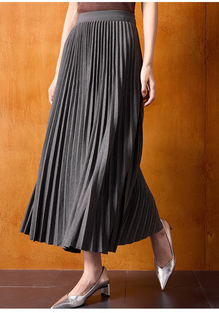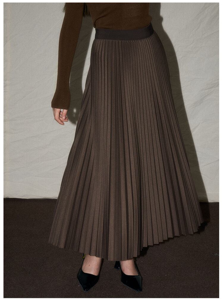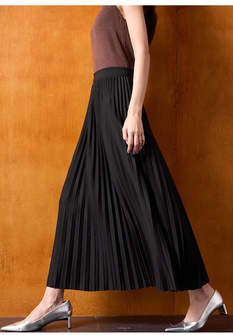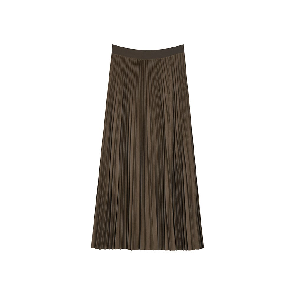 やや艶のあるプリーツスカートが美しいカーブを描き、脚を長く、細く見せてくれます。