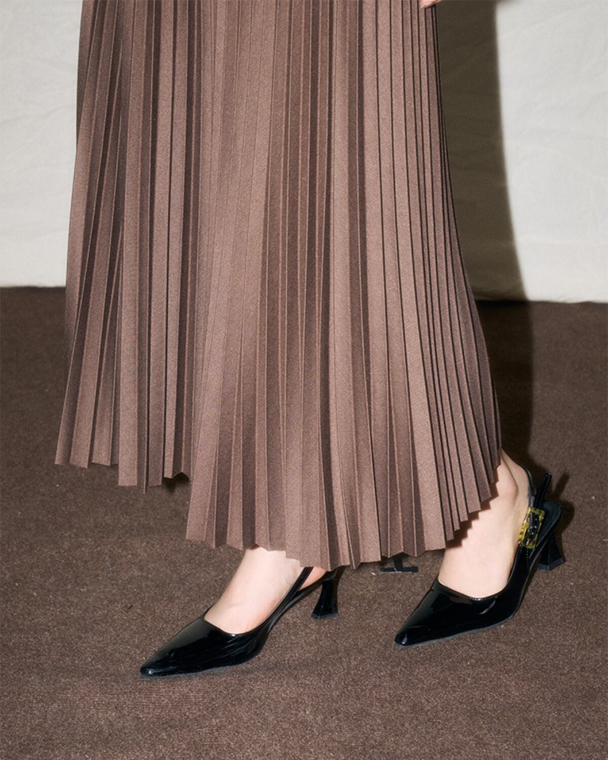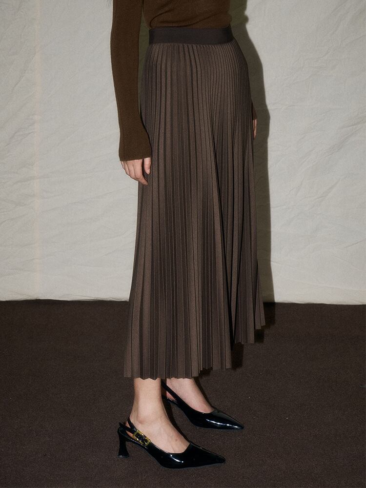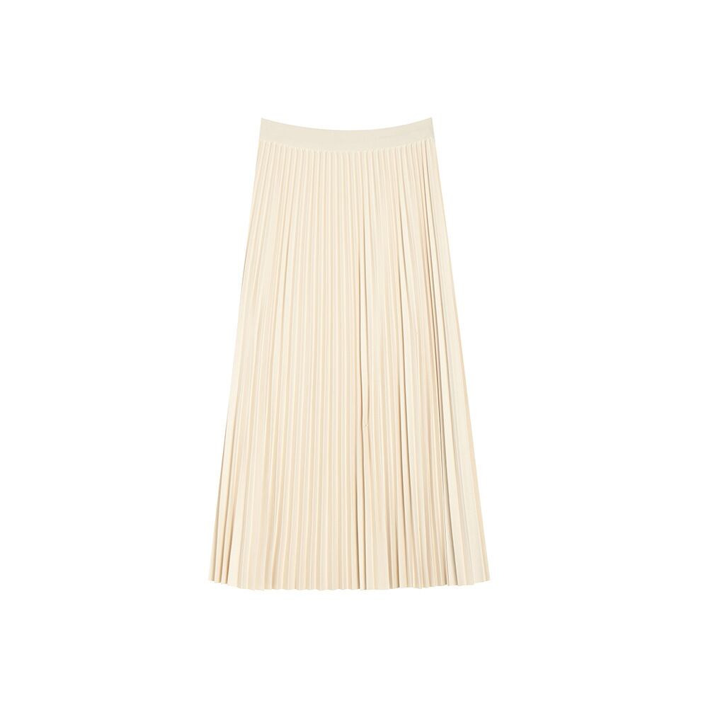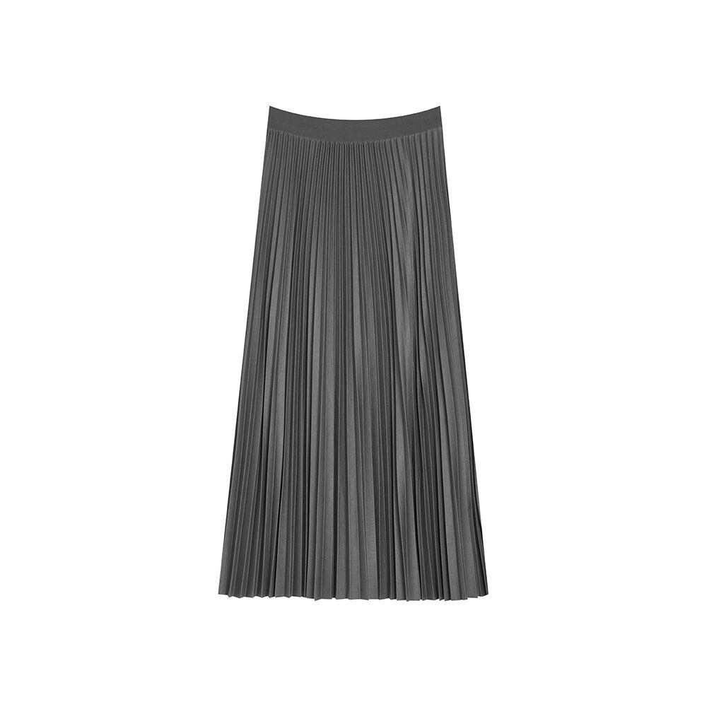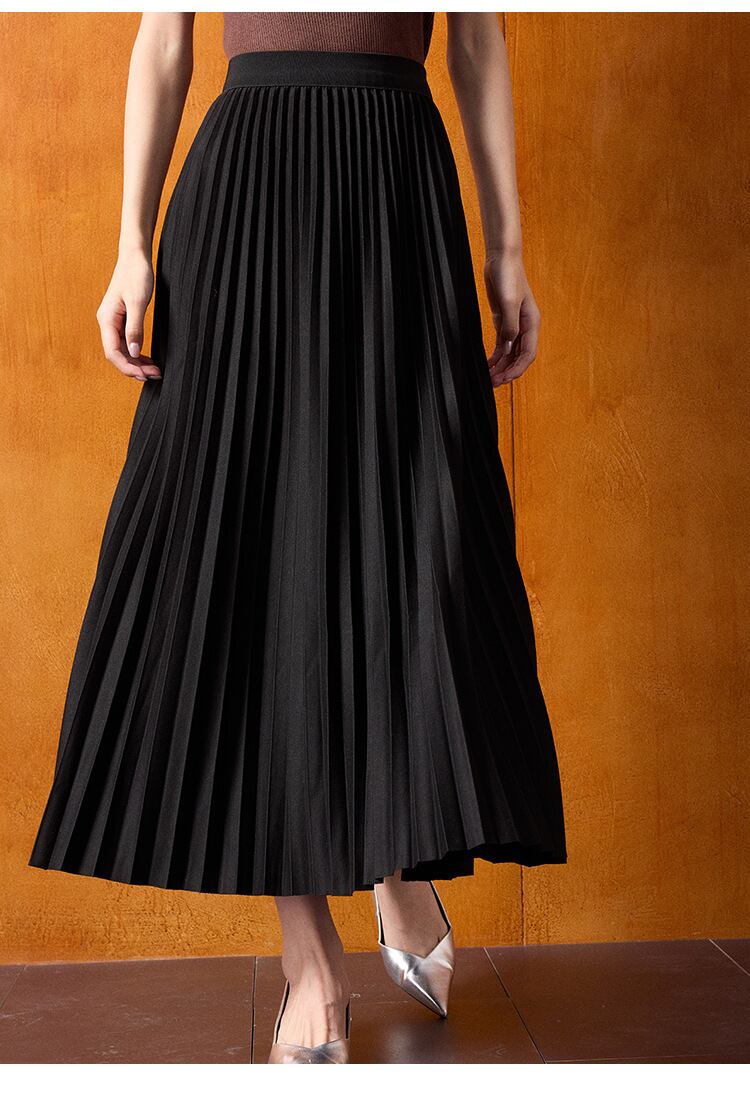 やや艶のあるプリーツスカートが美しいカーブを描き、脚を長く、細く見せてくれます。