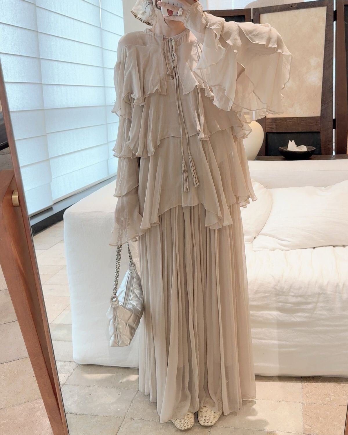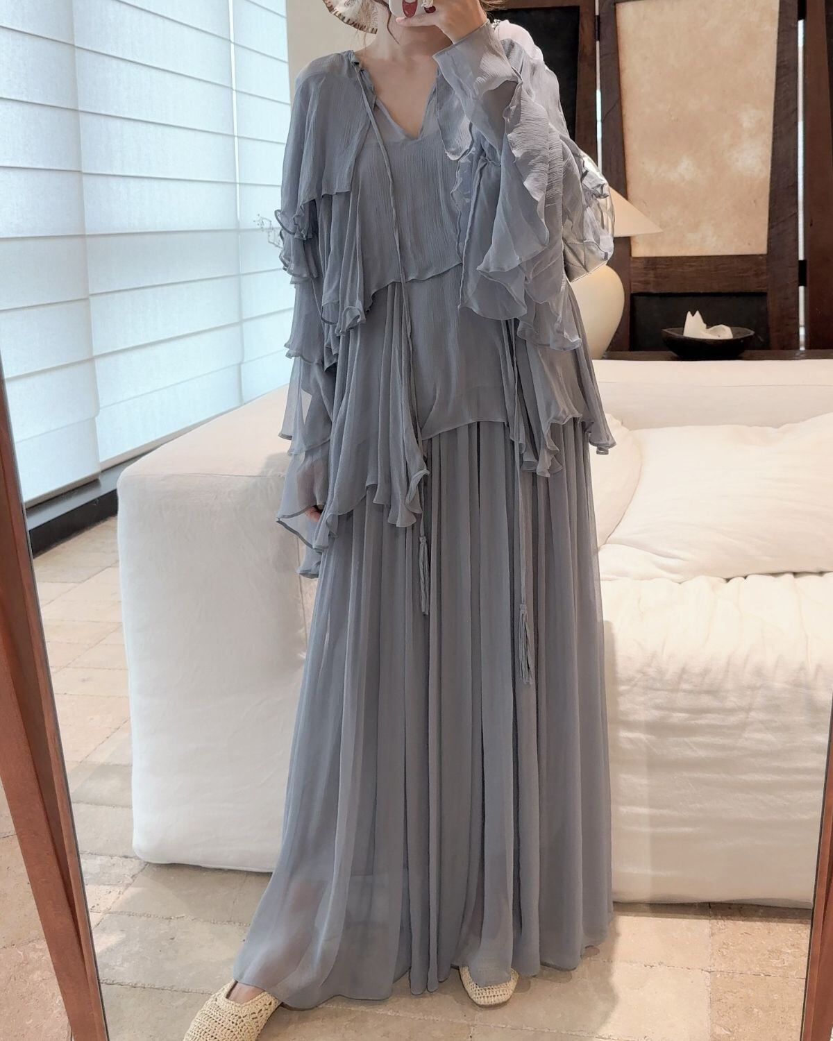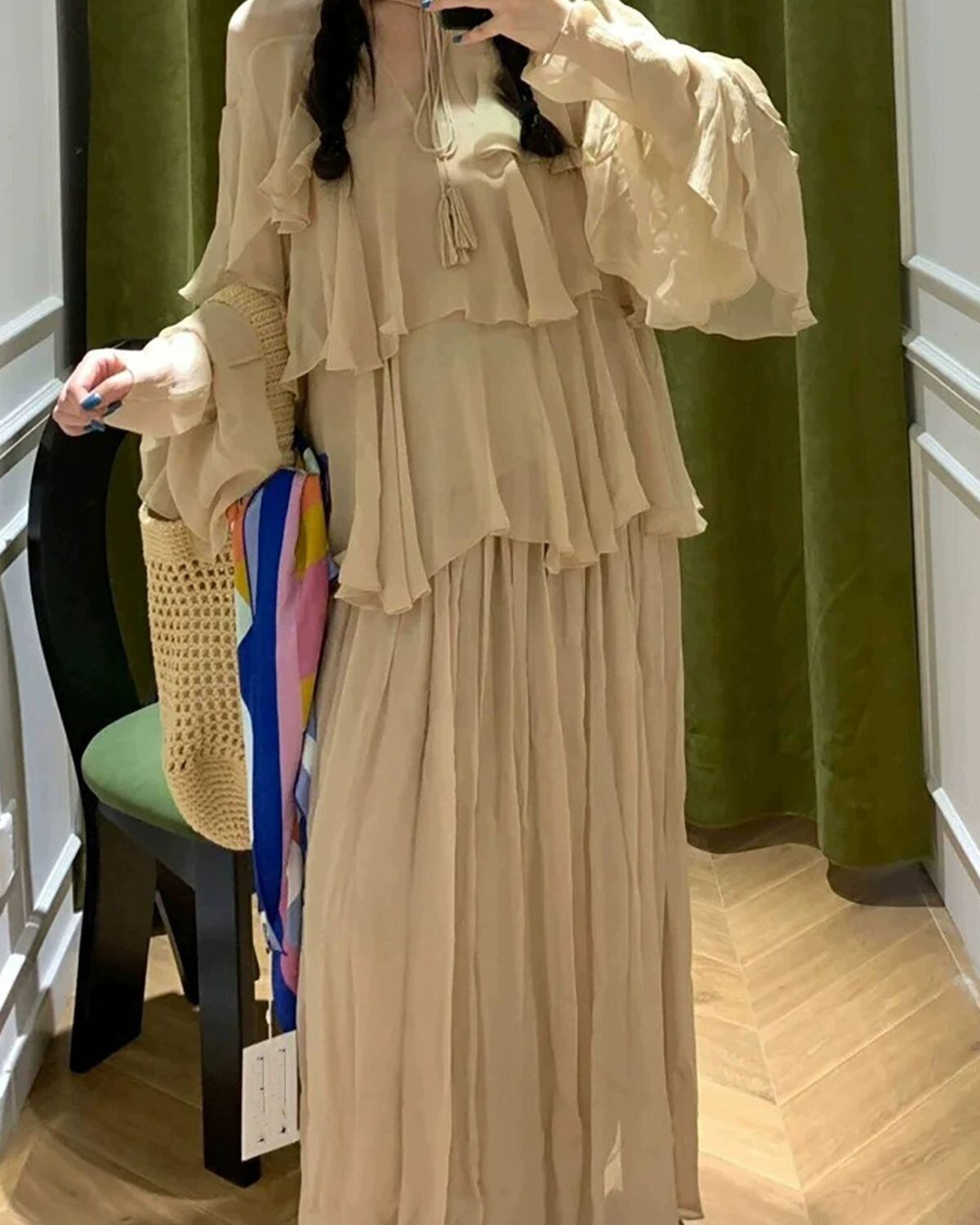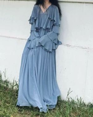 たっぷりとフリルがあしらわれた、エレガントでロマンティックな印象のティアードフリルワンスカート。柔らかな透け感と、幾重にも重なったフリルが美しいデザインです。