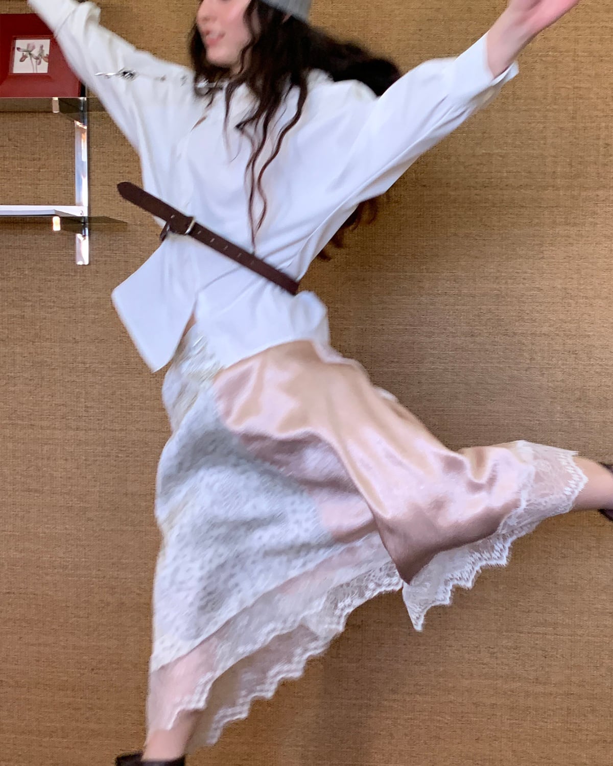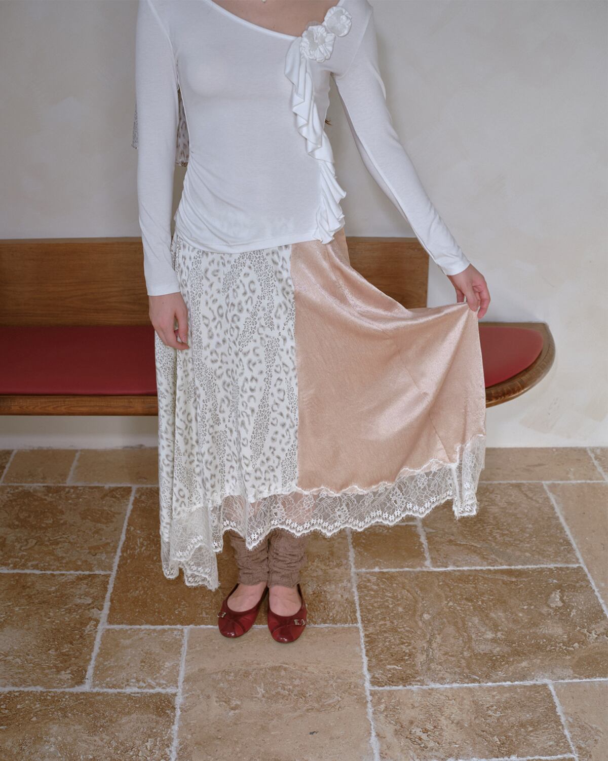 異なる素材が施されたパッチワークの裾は、動くたびに軽やかに揺れ、シルキーな光沢と豊かなドレープ感が魅力。