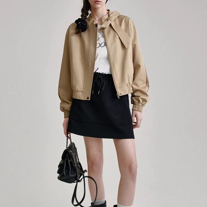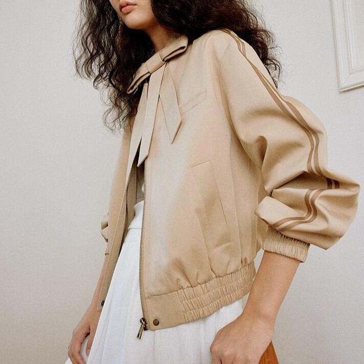 ファッションに遊び心をプラスするリボン付き襟のブルゾンです。
