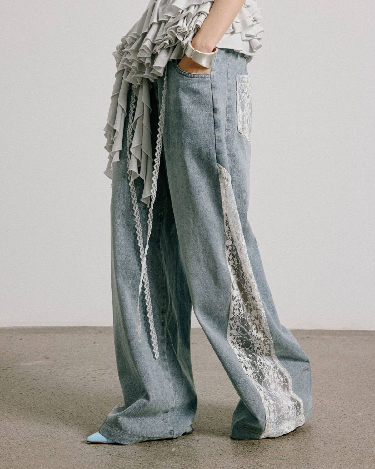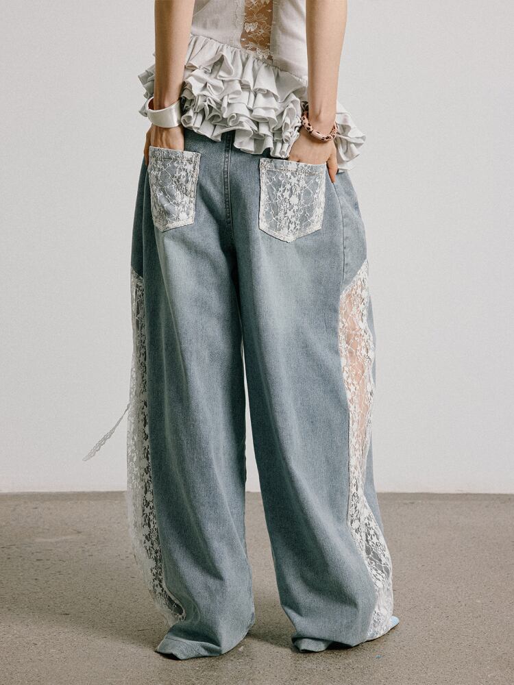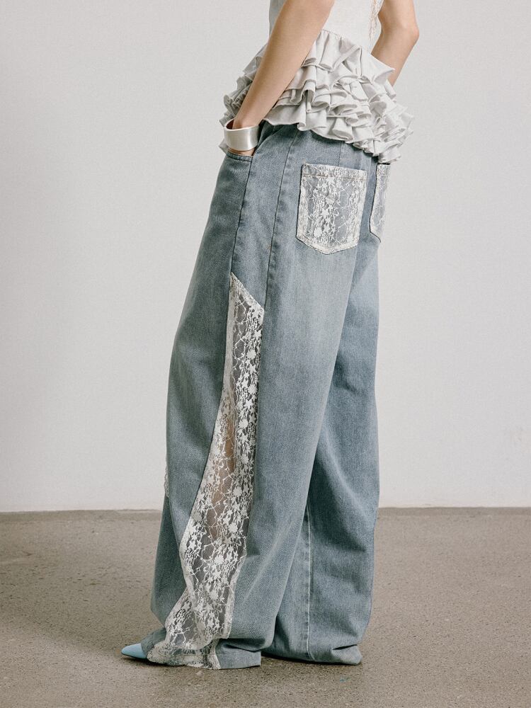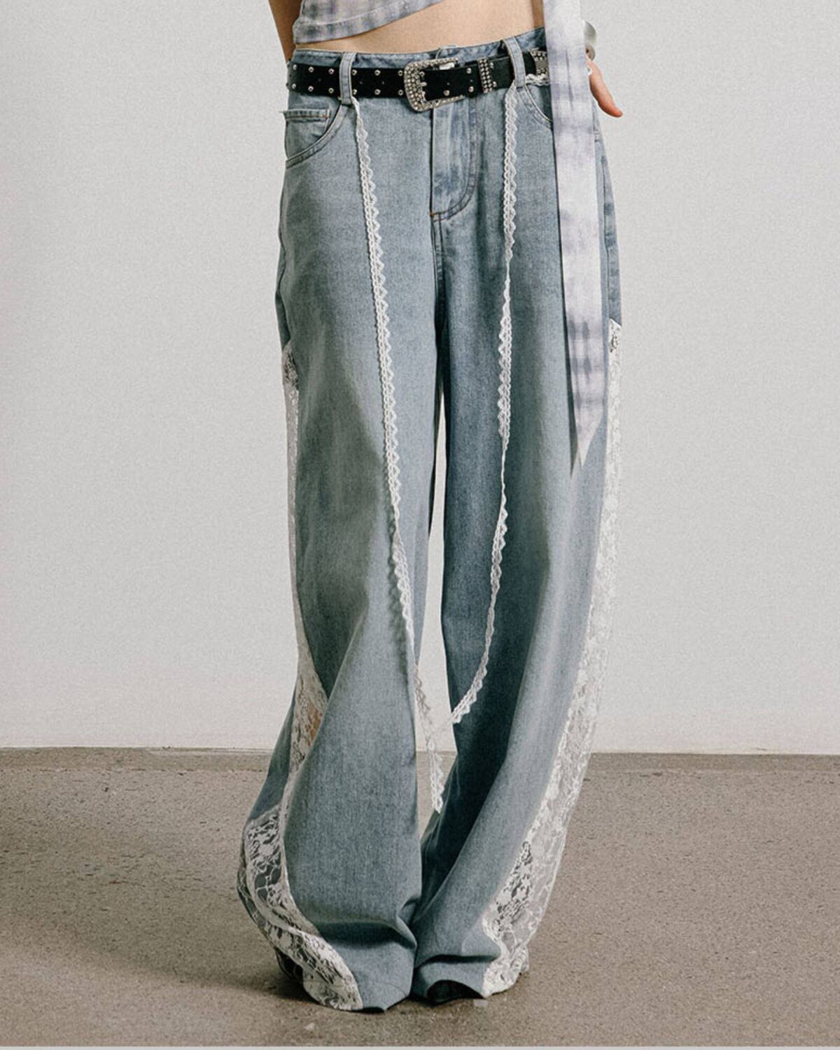 レースパッチワークデザインワイドデニムパンツ 3316