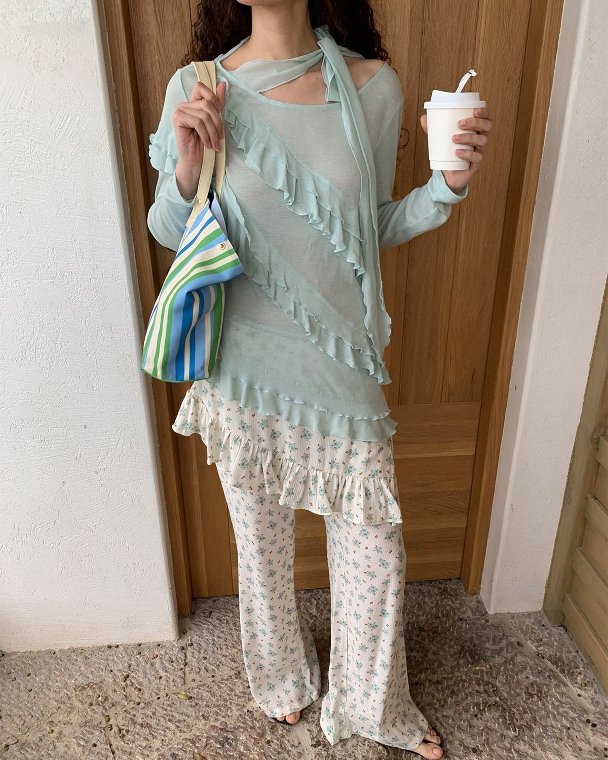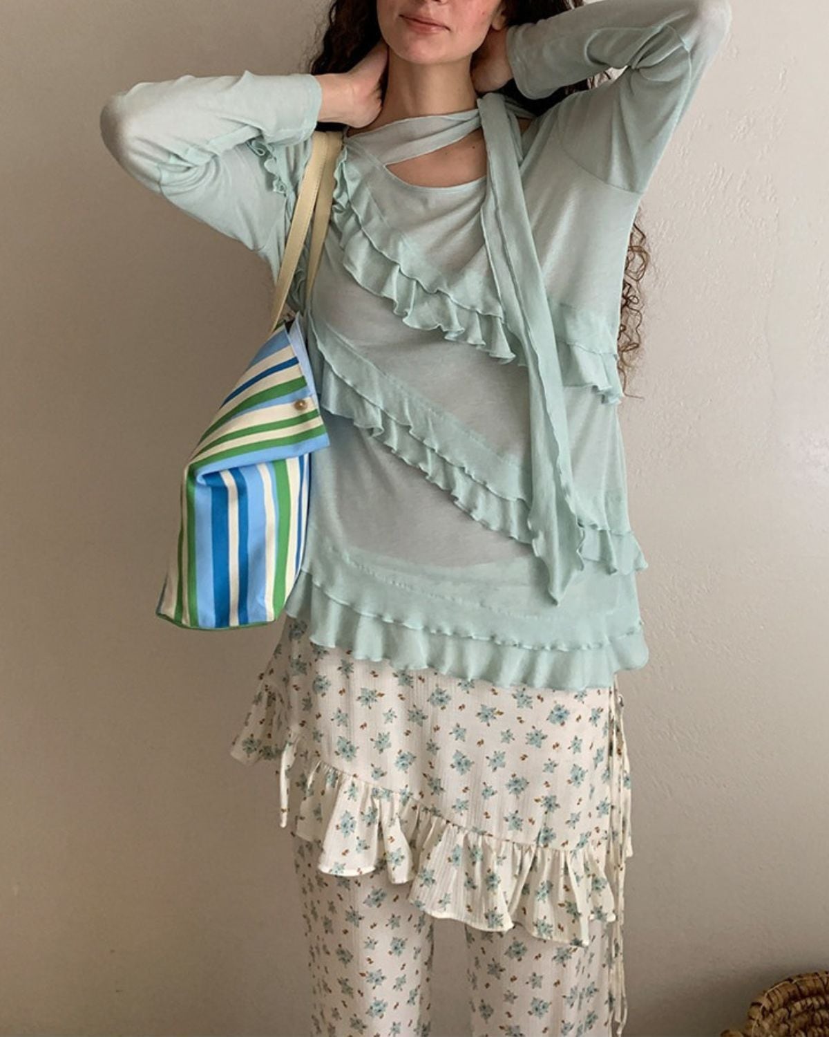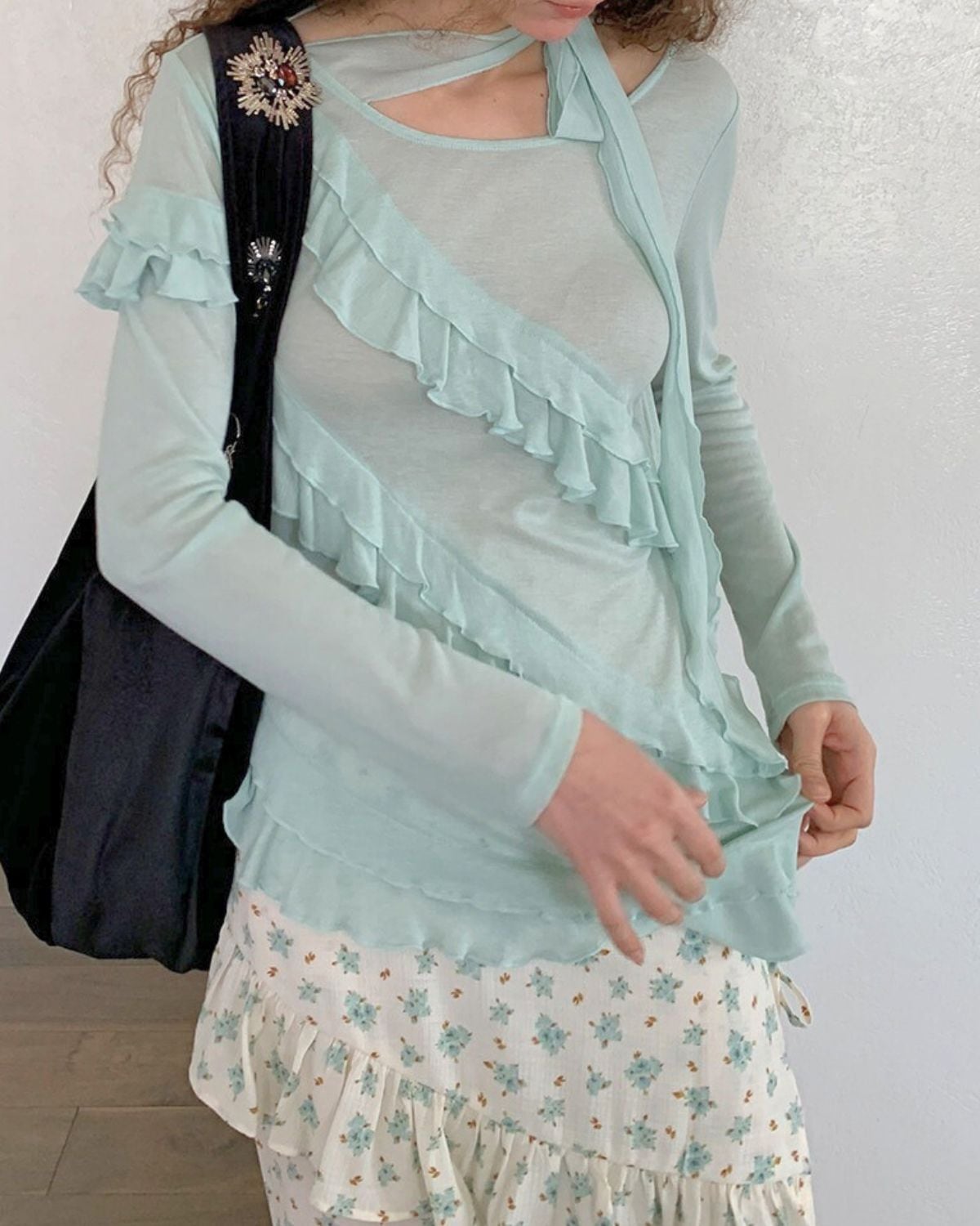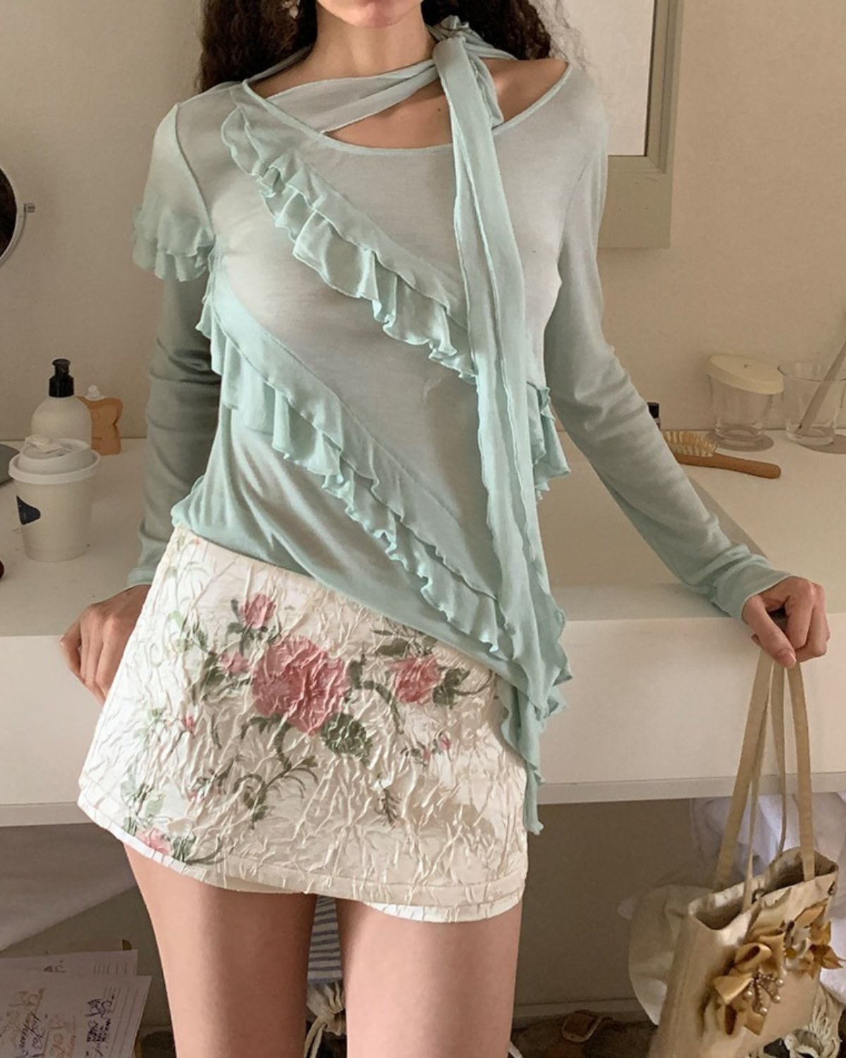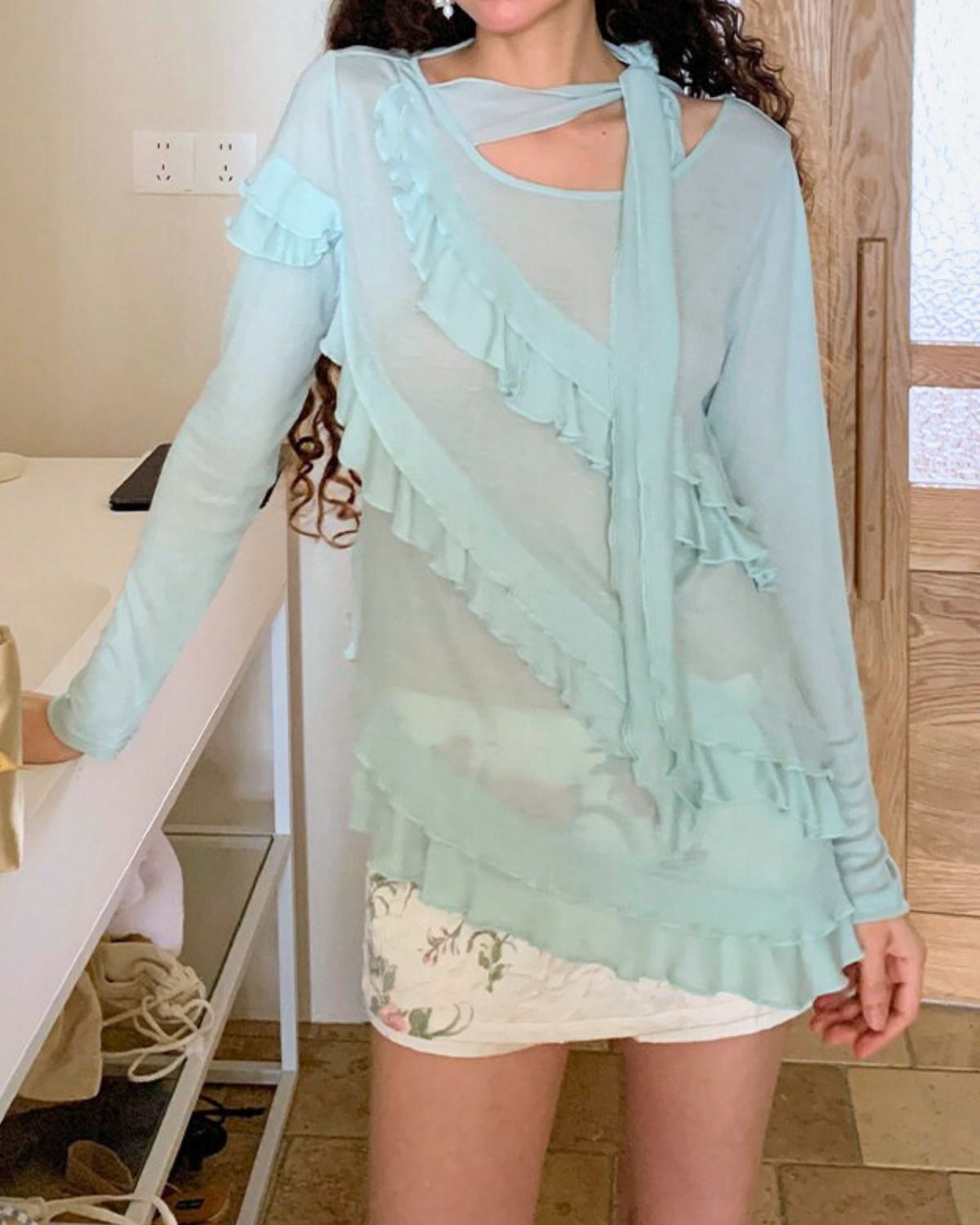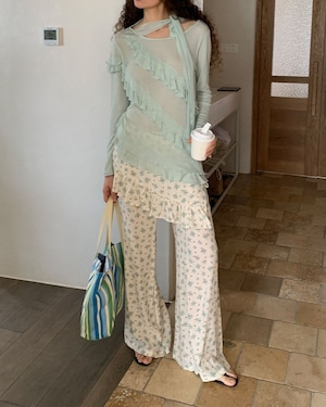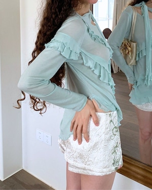 ミントグリーン系のフリルトップスには、アシンメトリーなデザインや透け感のある素材が使われています。襟ぐりからフロントにかけてフリルがあしらわれた、フェミニンなデザインです。