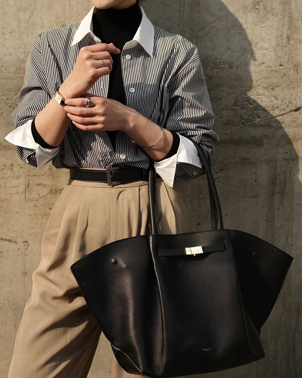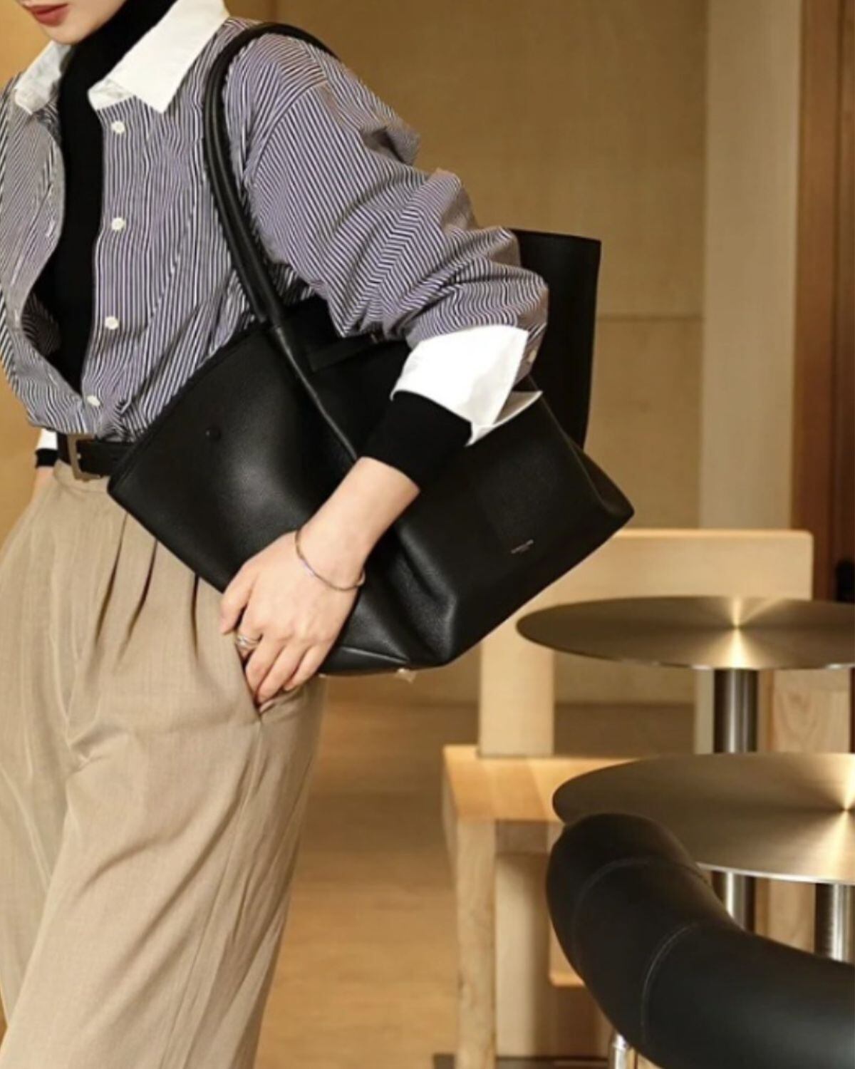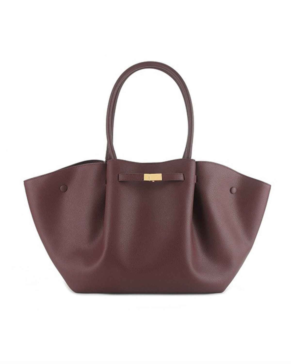 モダンな舟形のフォルムとゴールドの金具が特徴の大容量のトートバッグ。