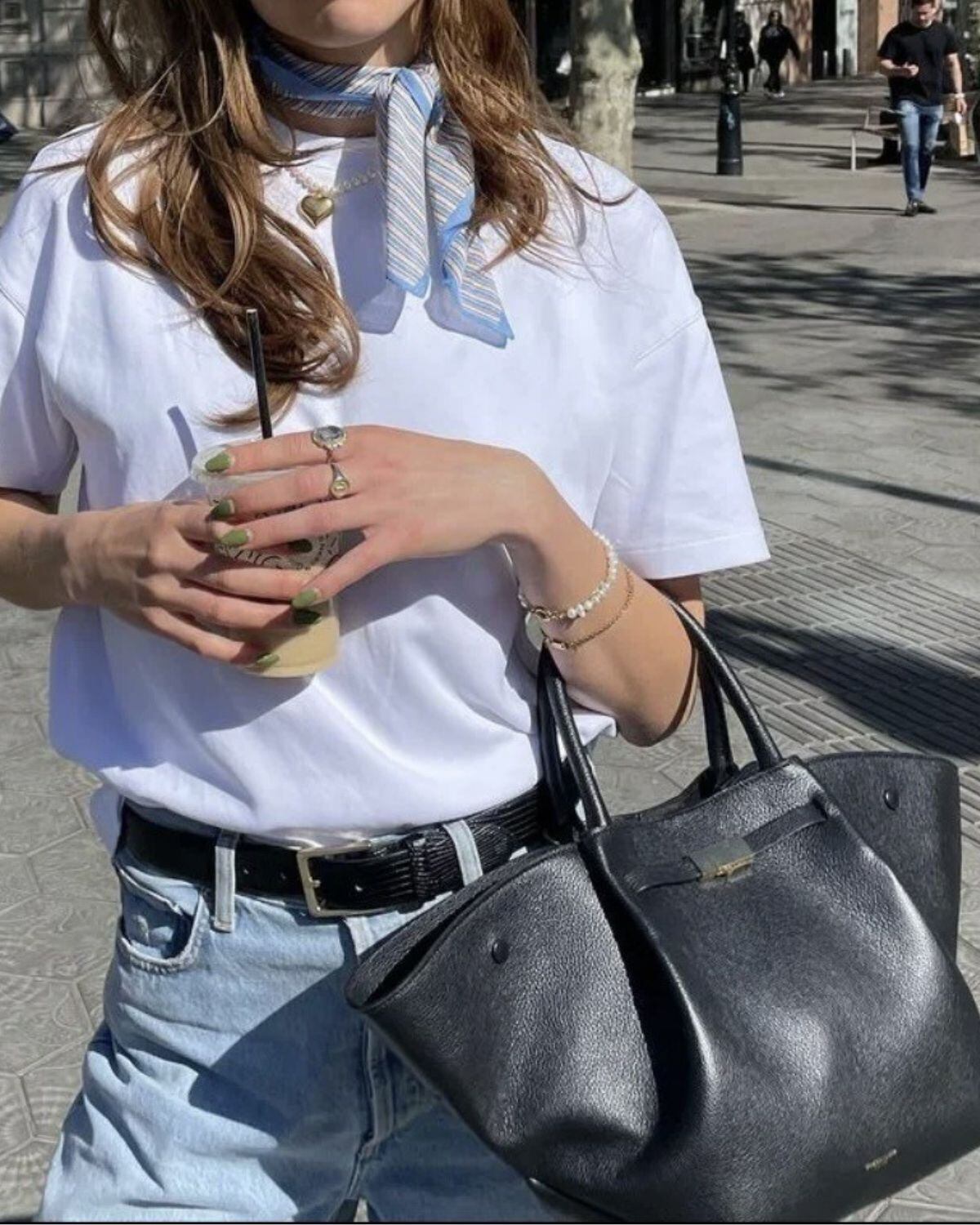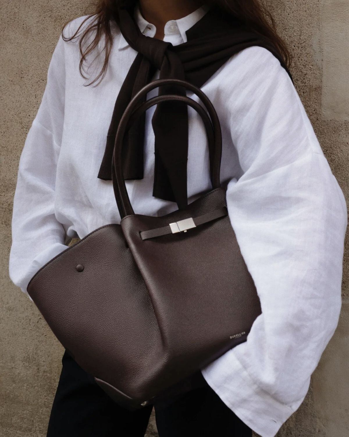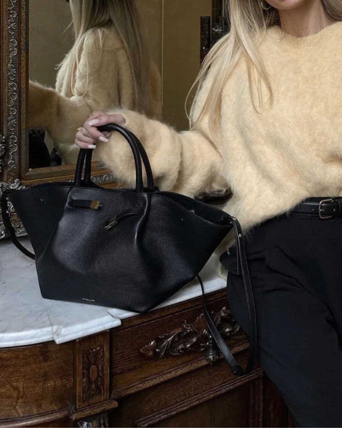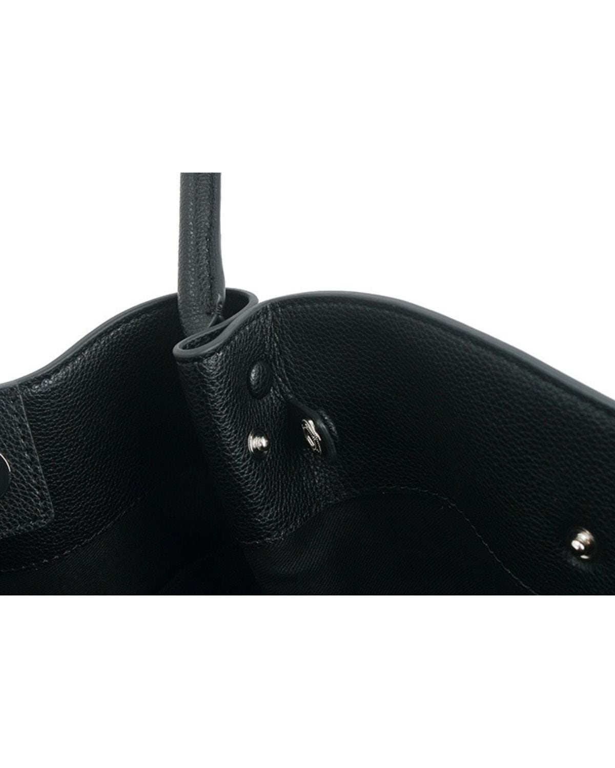 モダンな舟形のフォルムとゴールドの金具が特徴の大容量のトートバッグ。