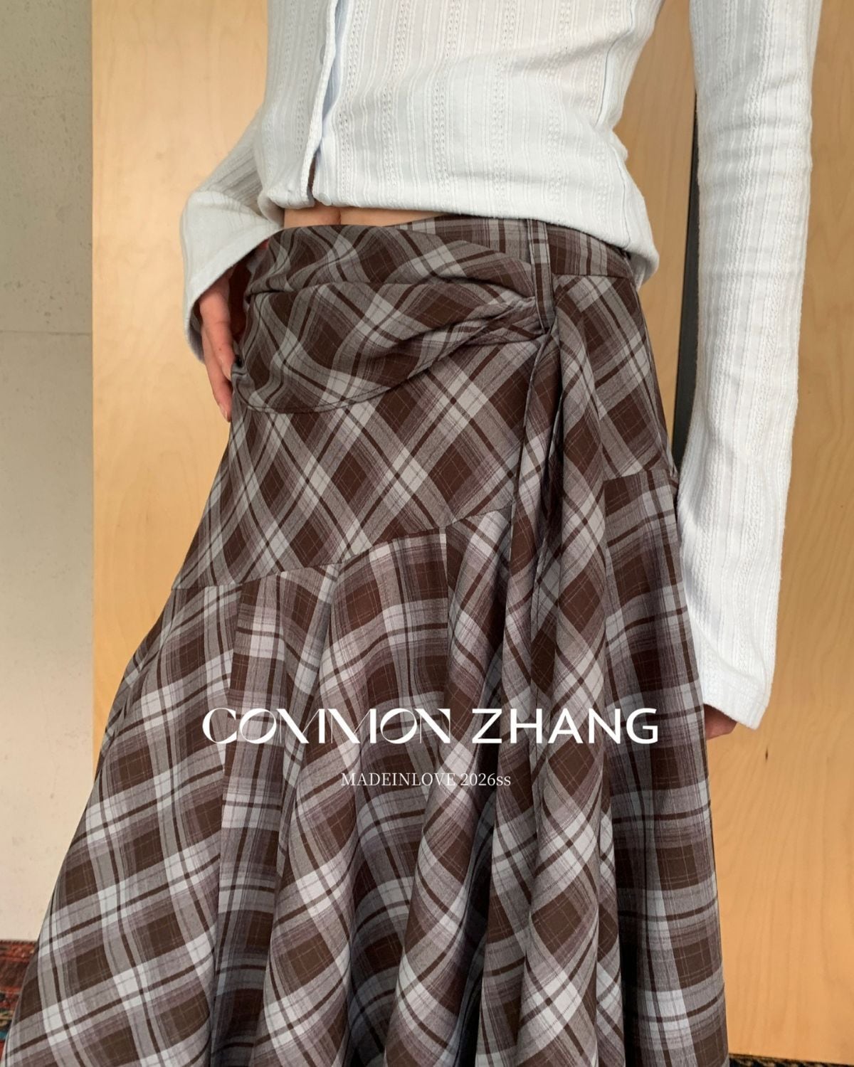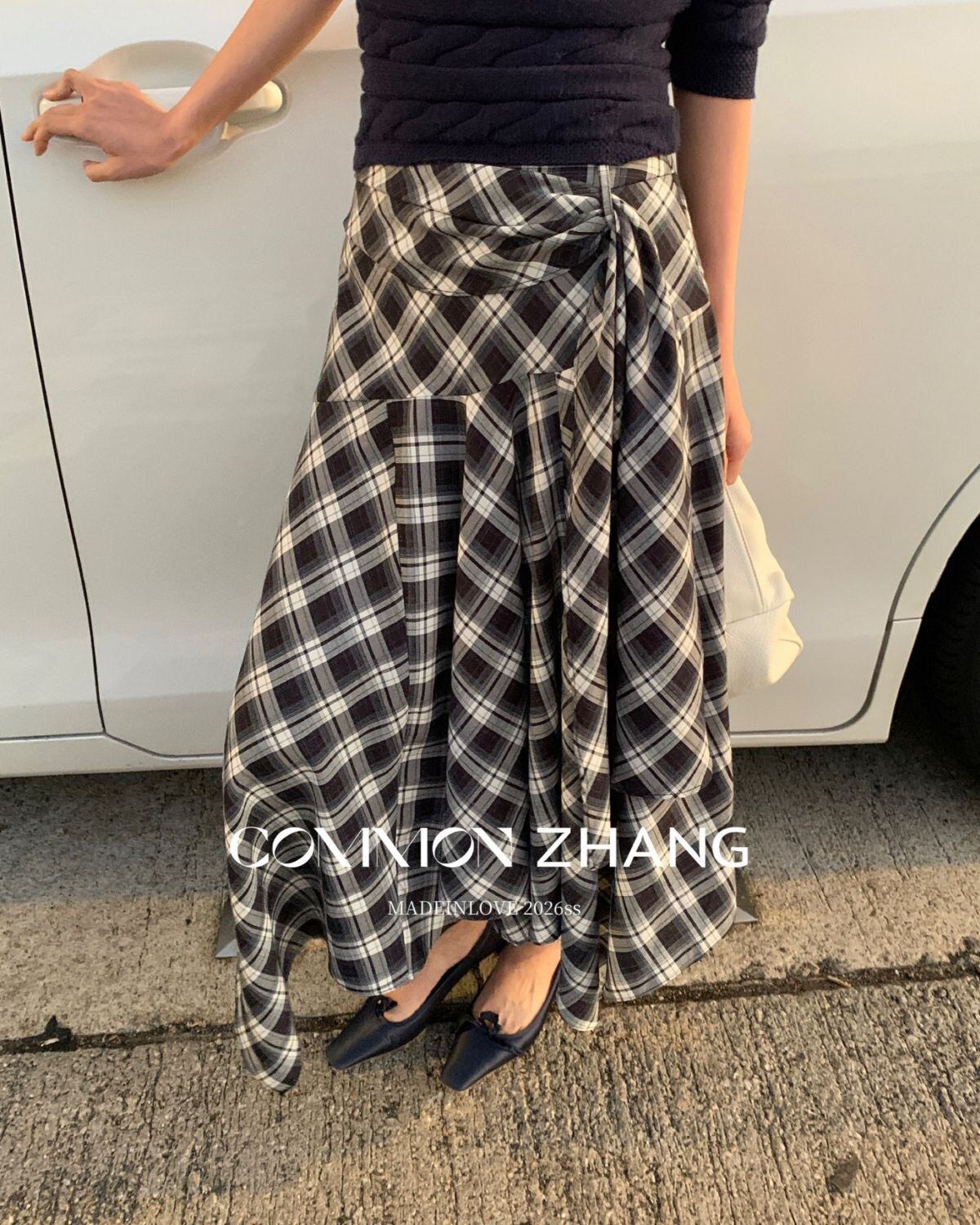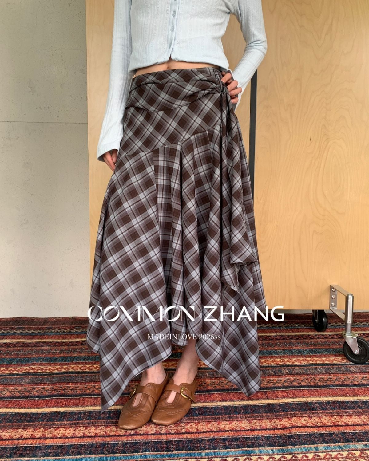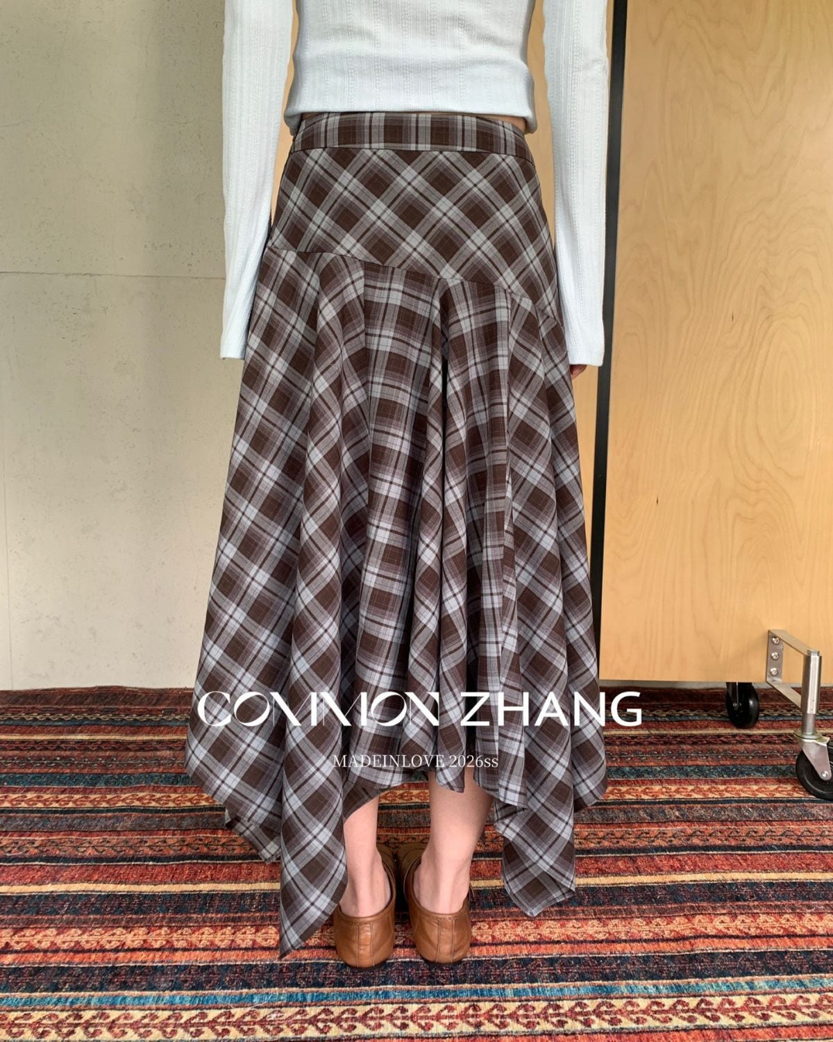 チェック柄のアシンメトリースカートです。シャツ風のラップレイヤードがいつものレイアウトをワンランクアップしてくれます。