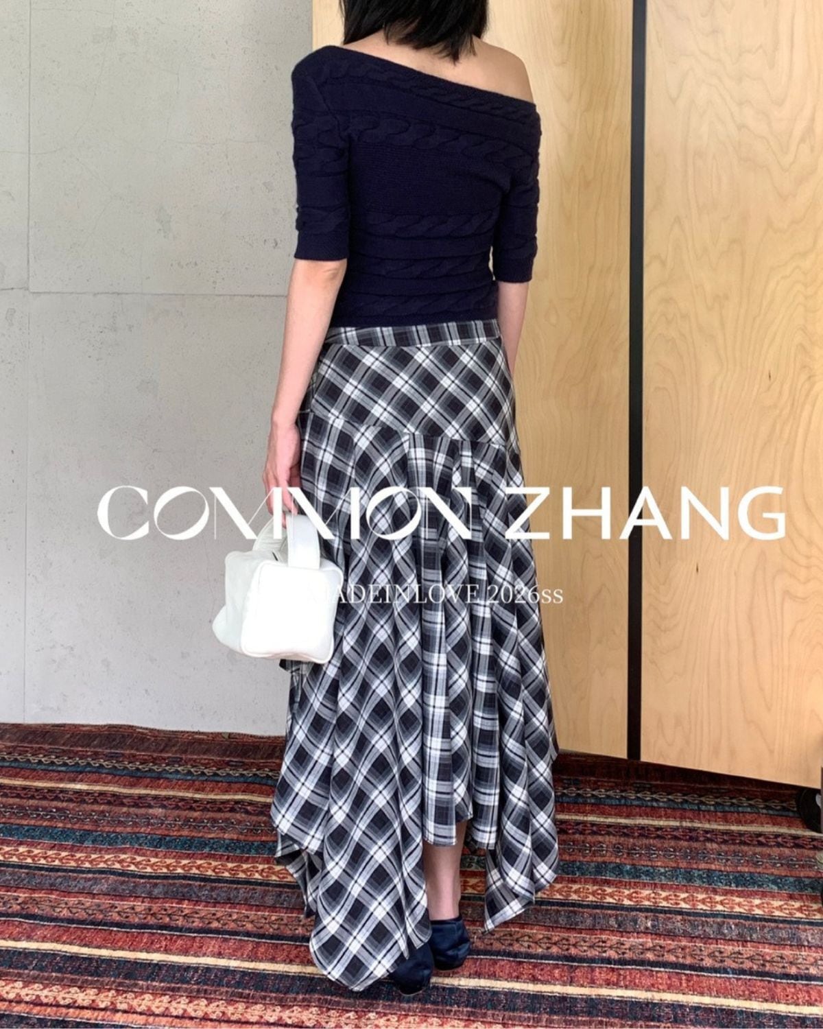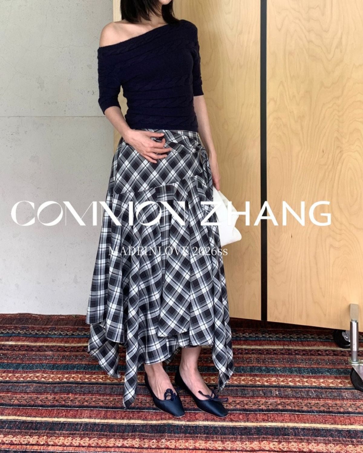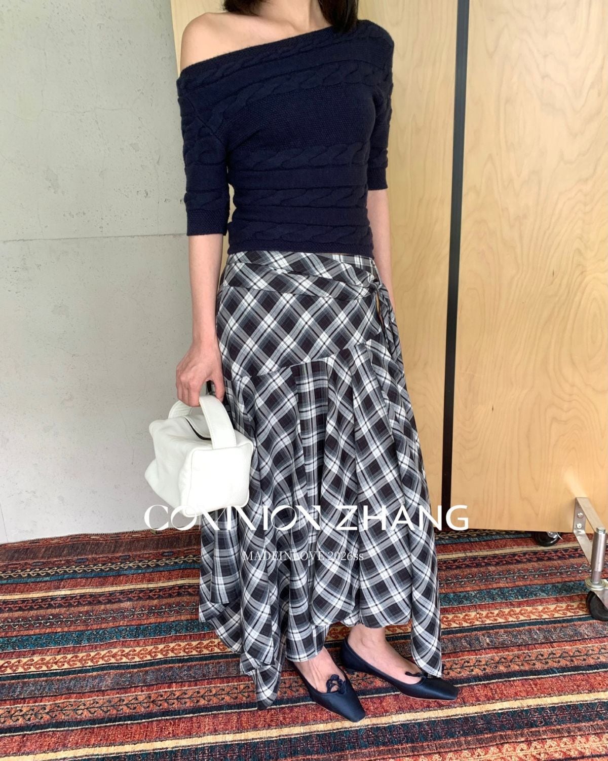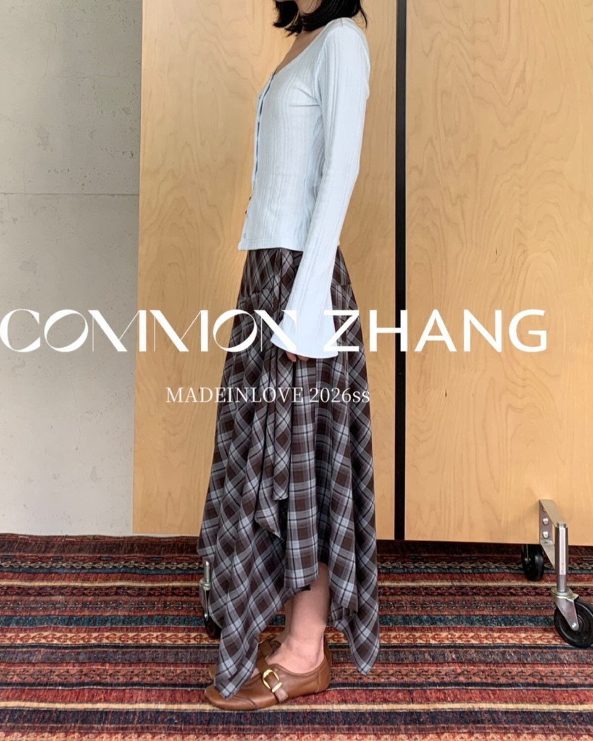 チェック柄のアシンメトリースカートです。シャツ風のラップレイヤードがいつものレイアウトをワンランクアップしてくれます。