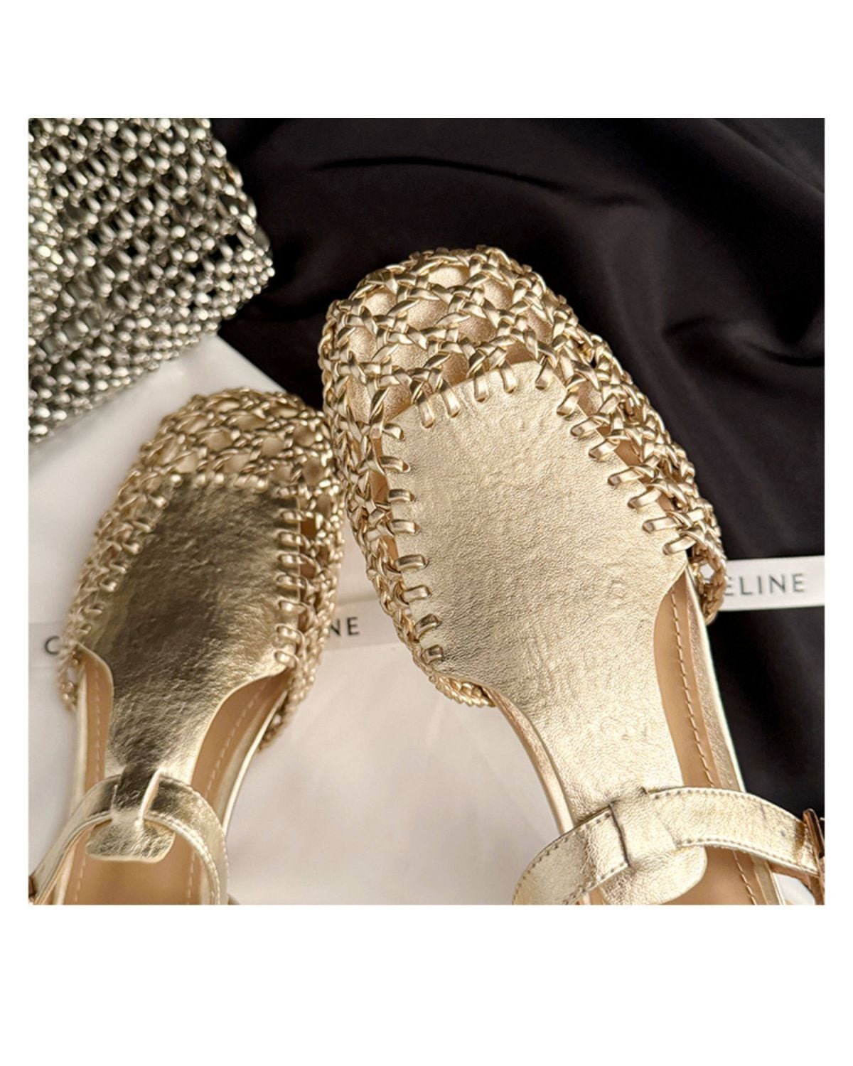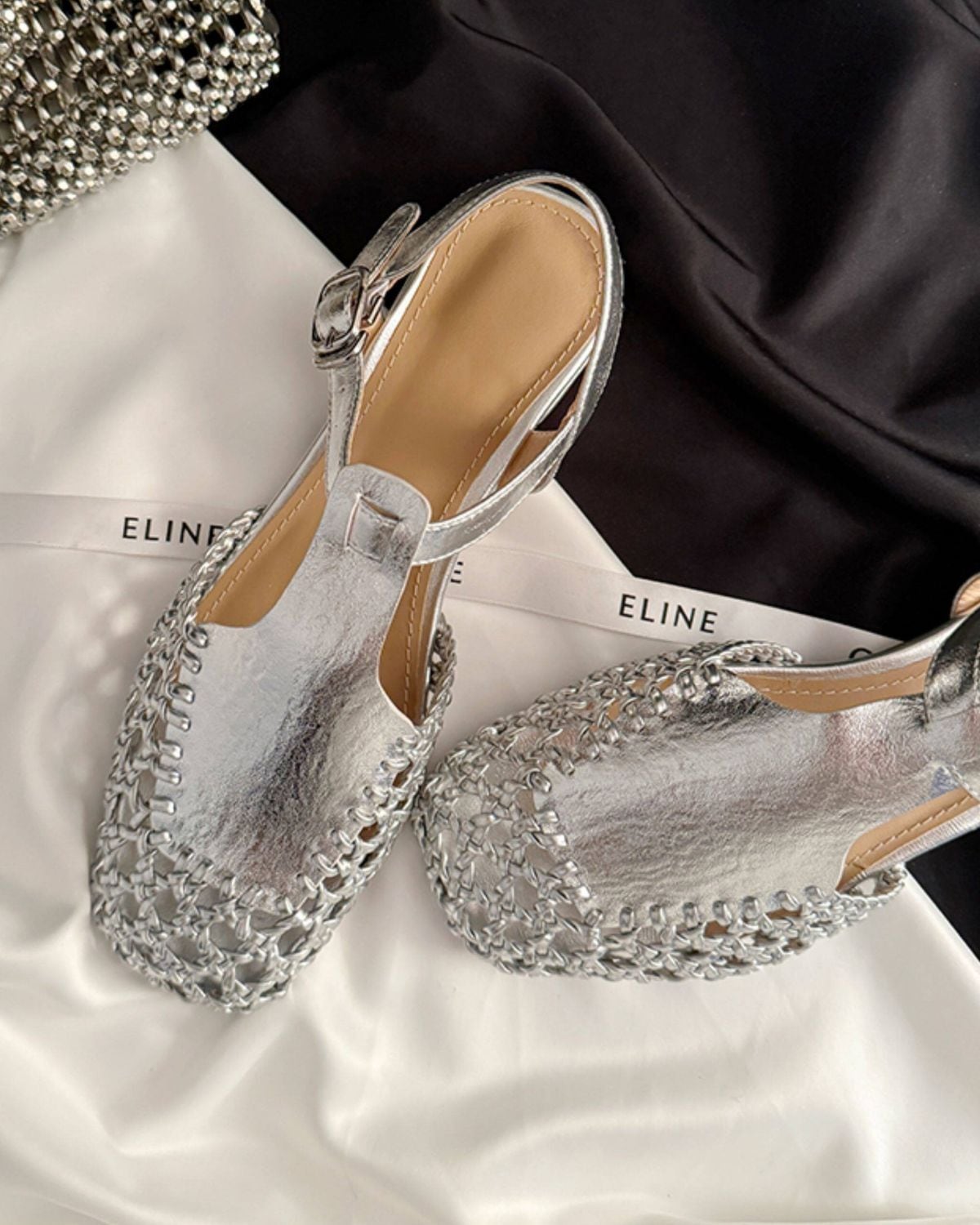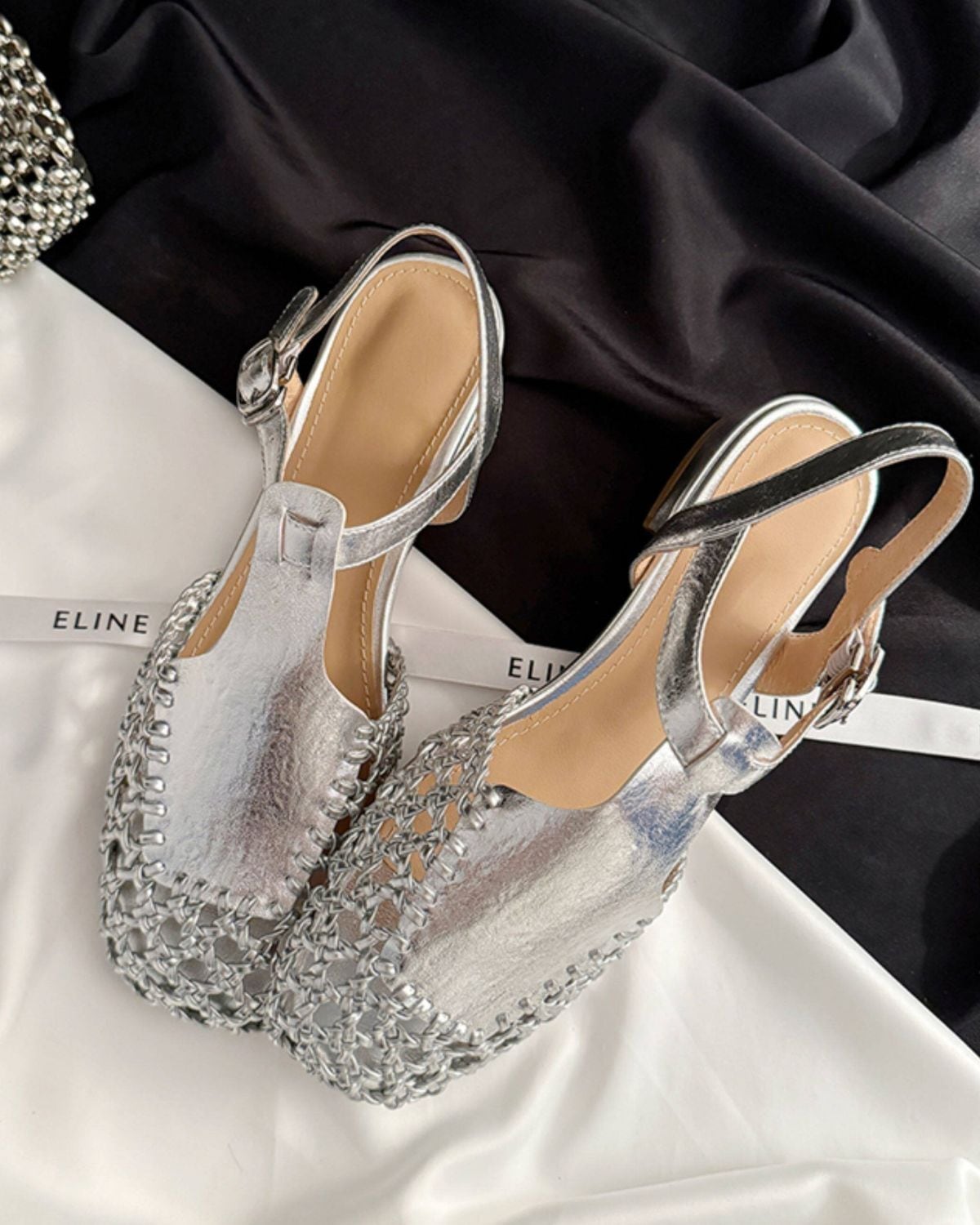 スクエアトゥの形状に、アッパー部分が網目状に編み込まれたデザインです。アンクルストラップで、カジュアルなデニムスタイルから、リゾートなどの装いまで幅広く合わせることができます。