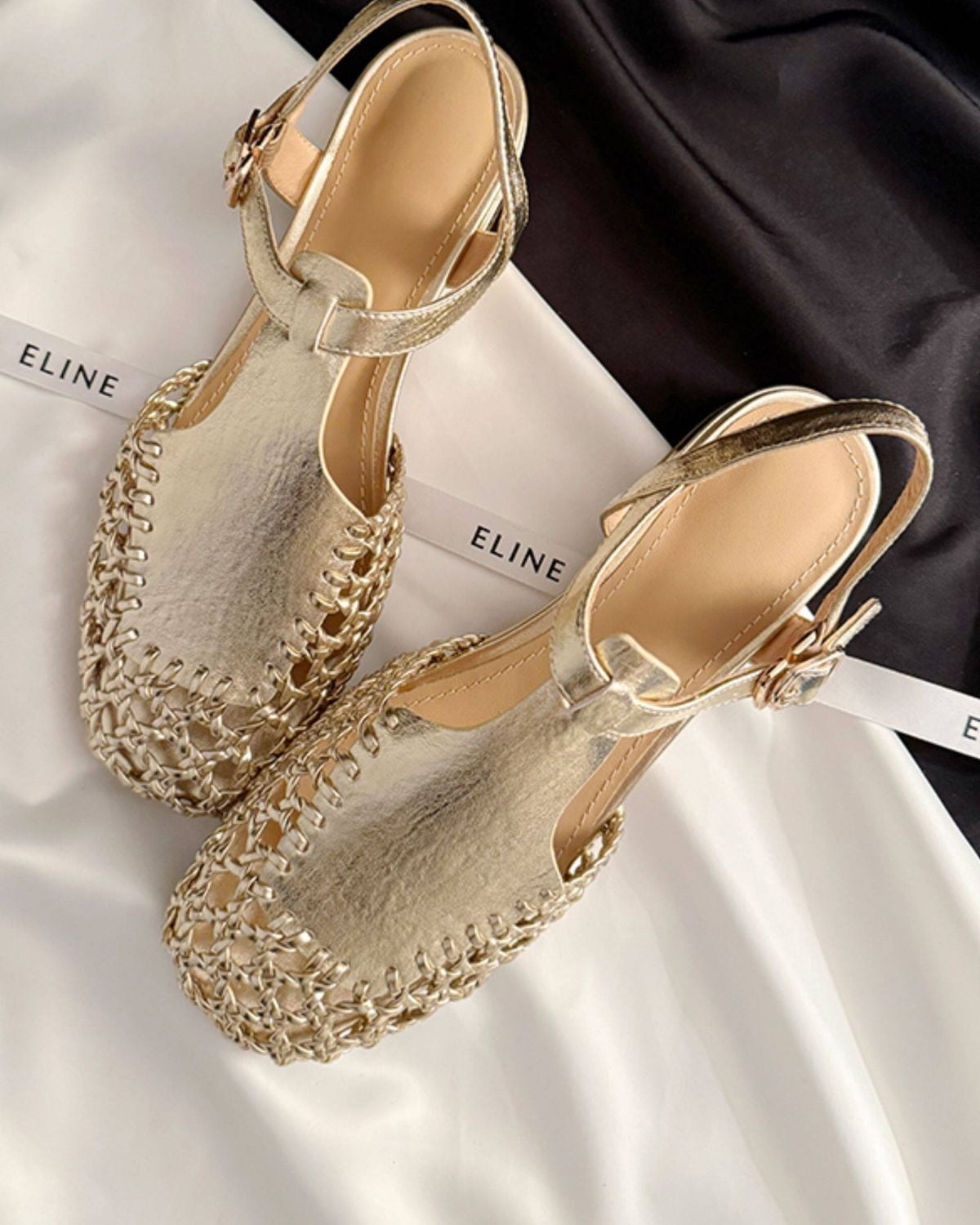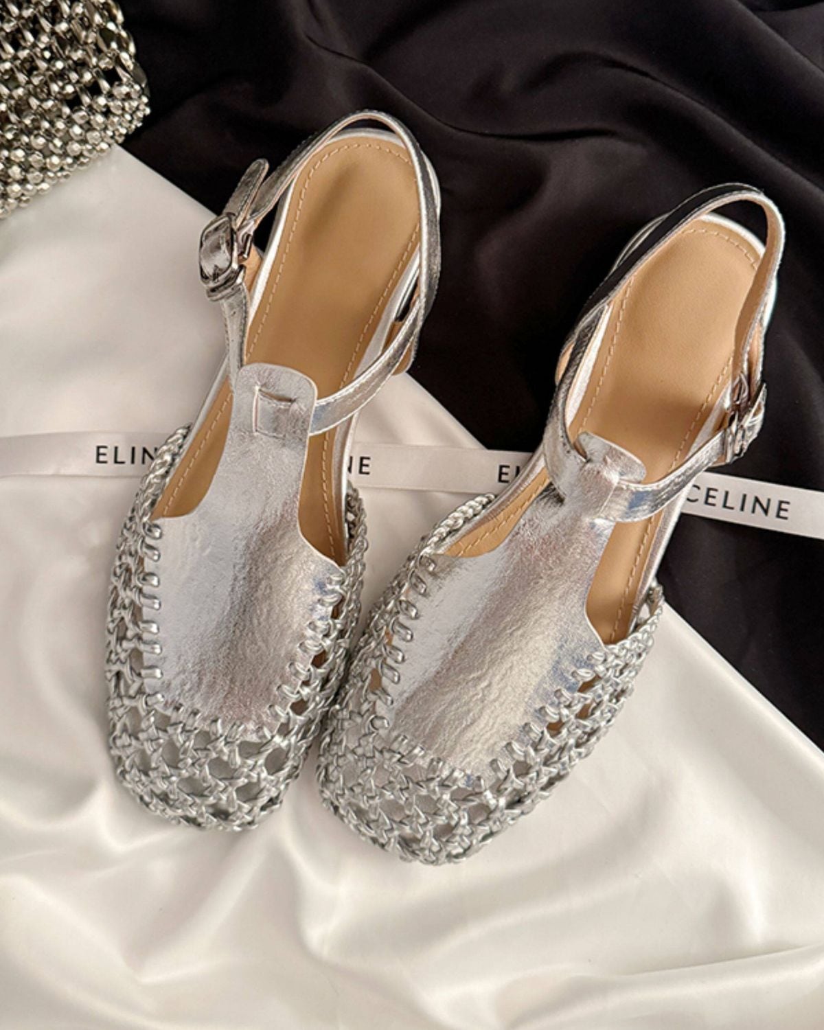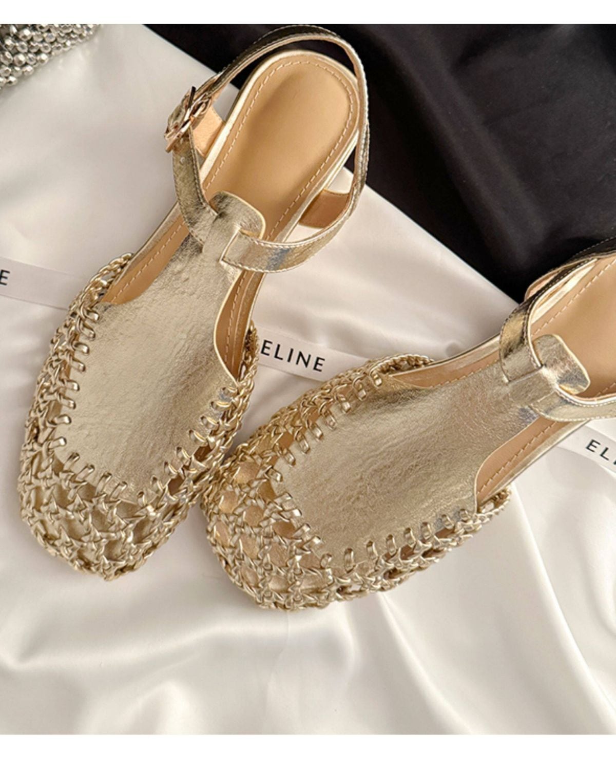 スクエアトゥの形状に、アッパー部分が網目状に編み込まれたデザインです。アンクルストラップで、カジュアルなデニムスタイルから、リゾートなどの装いまで幅広く合わせることができます。