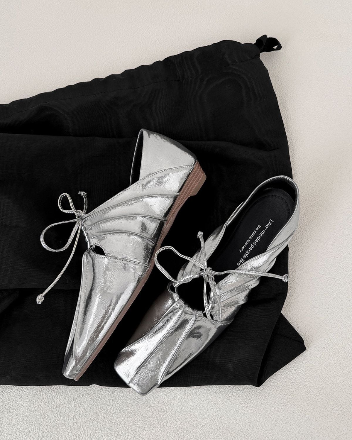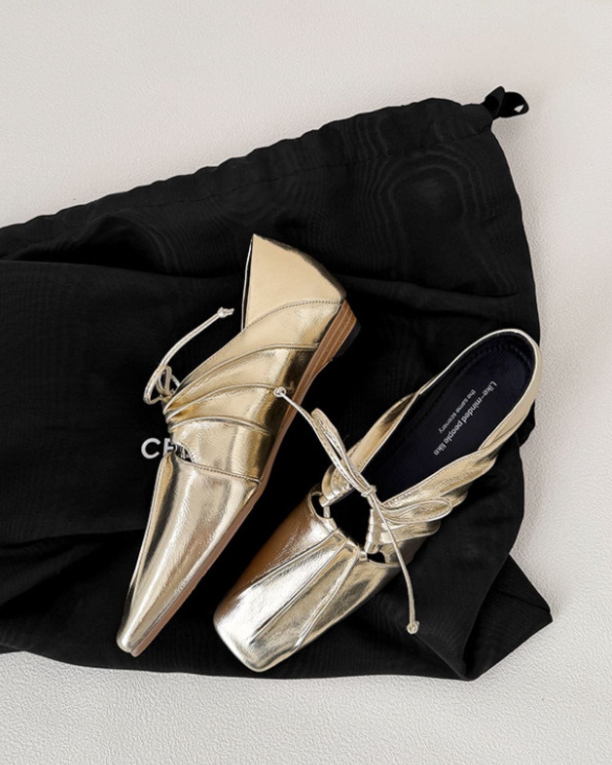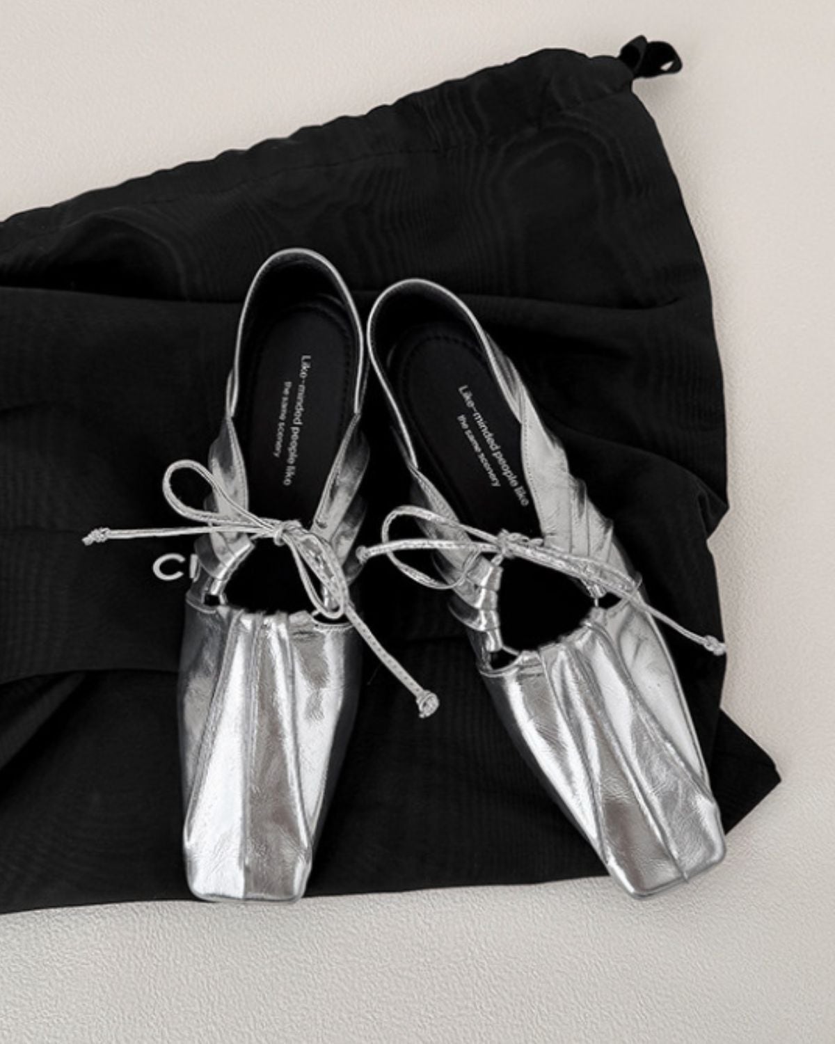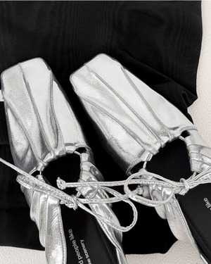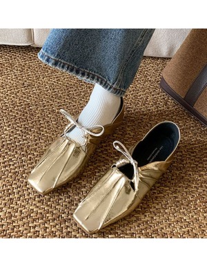 リボンとギャザーが特徴的なバレエシューズ風のデザインです。靴下と合わせることでカジュアルにも、そのまま履いてモードな印象にもコーディネートできるのが魅力です。