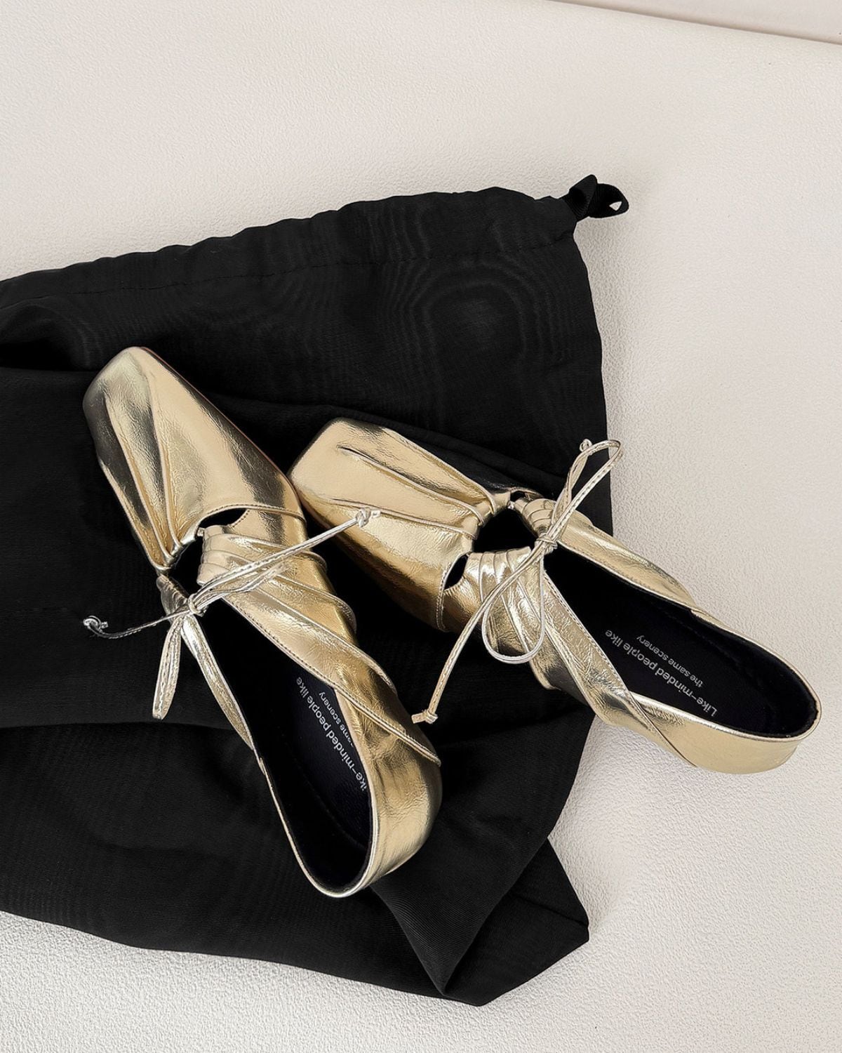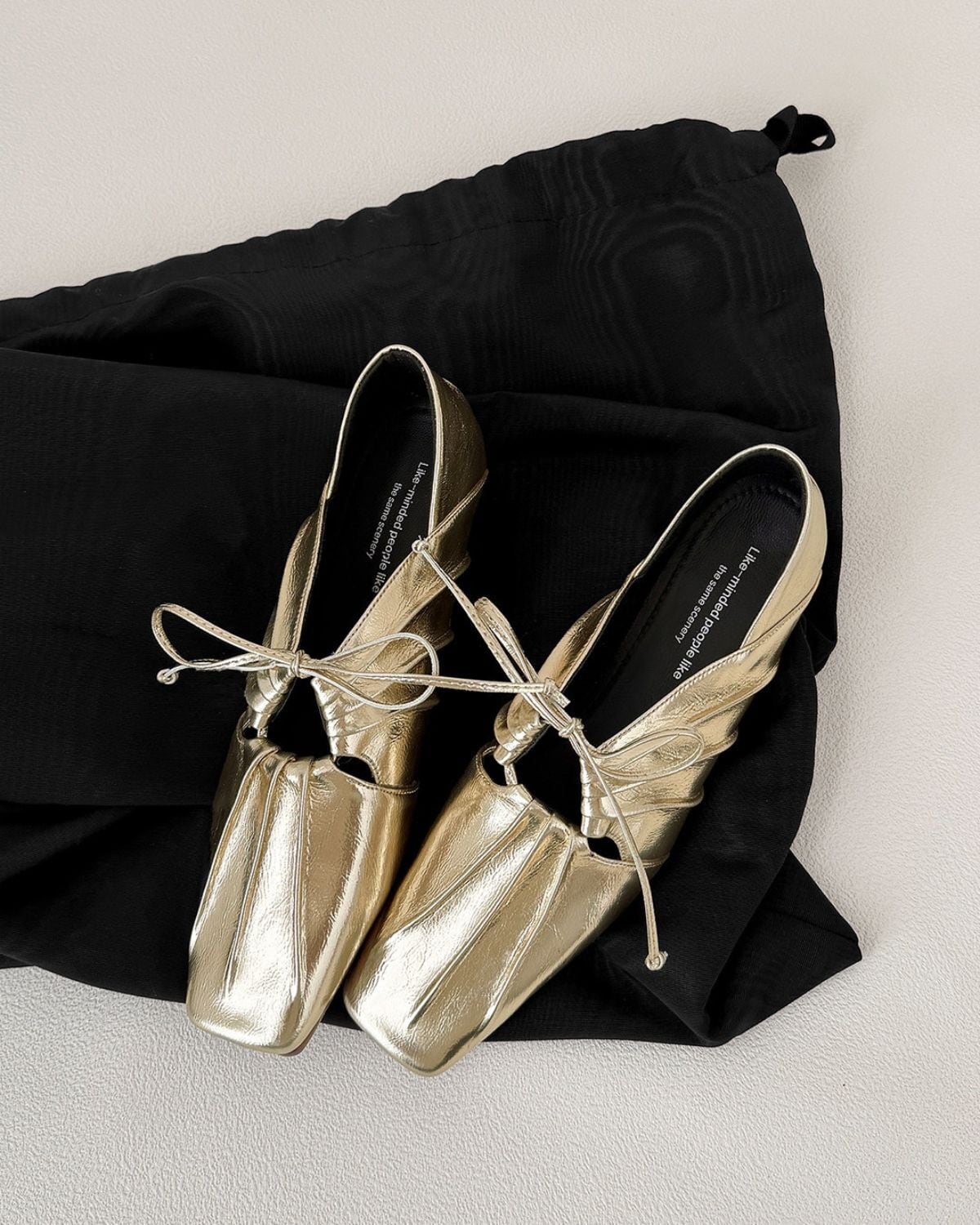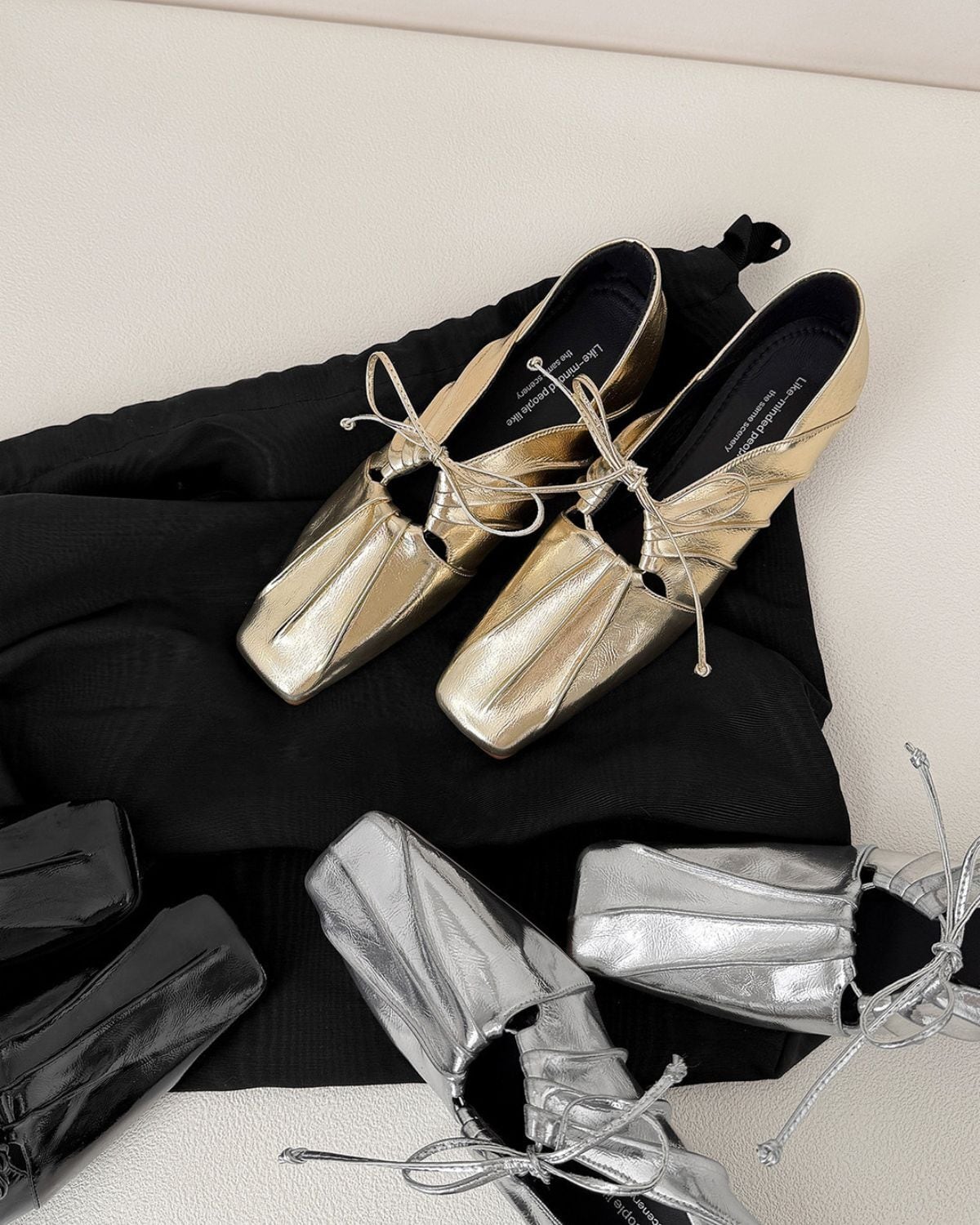 リボンとギャザーが特徴的なバレエシューズ風のデザインです。靴下と合わせることでカジュアルにも、そのまま履いてモードな印象にもコーディネートできるのが魅力です。