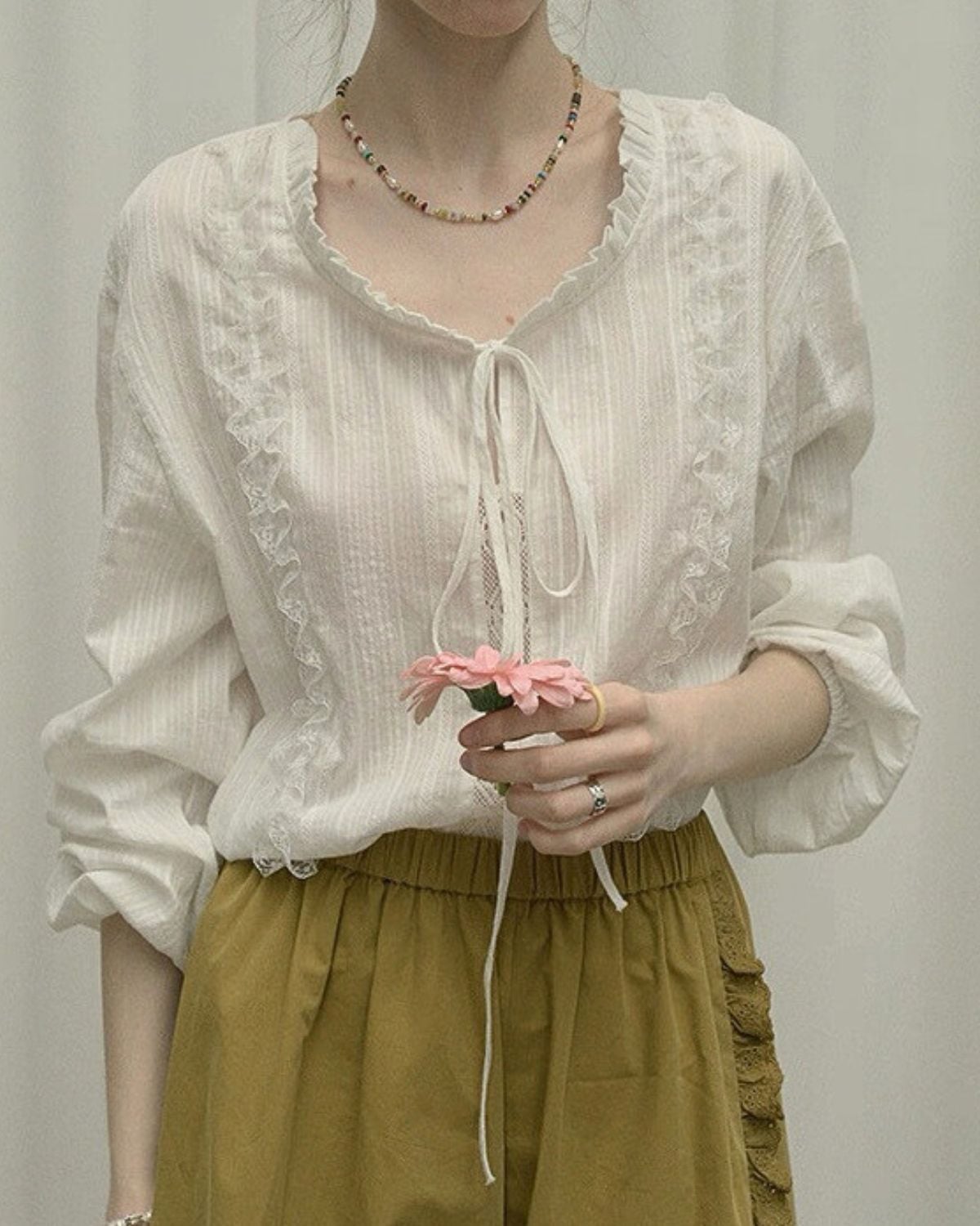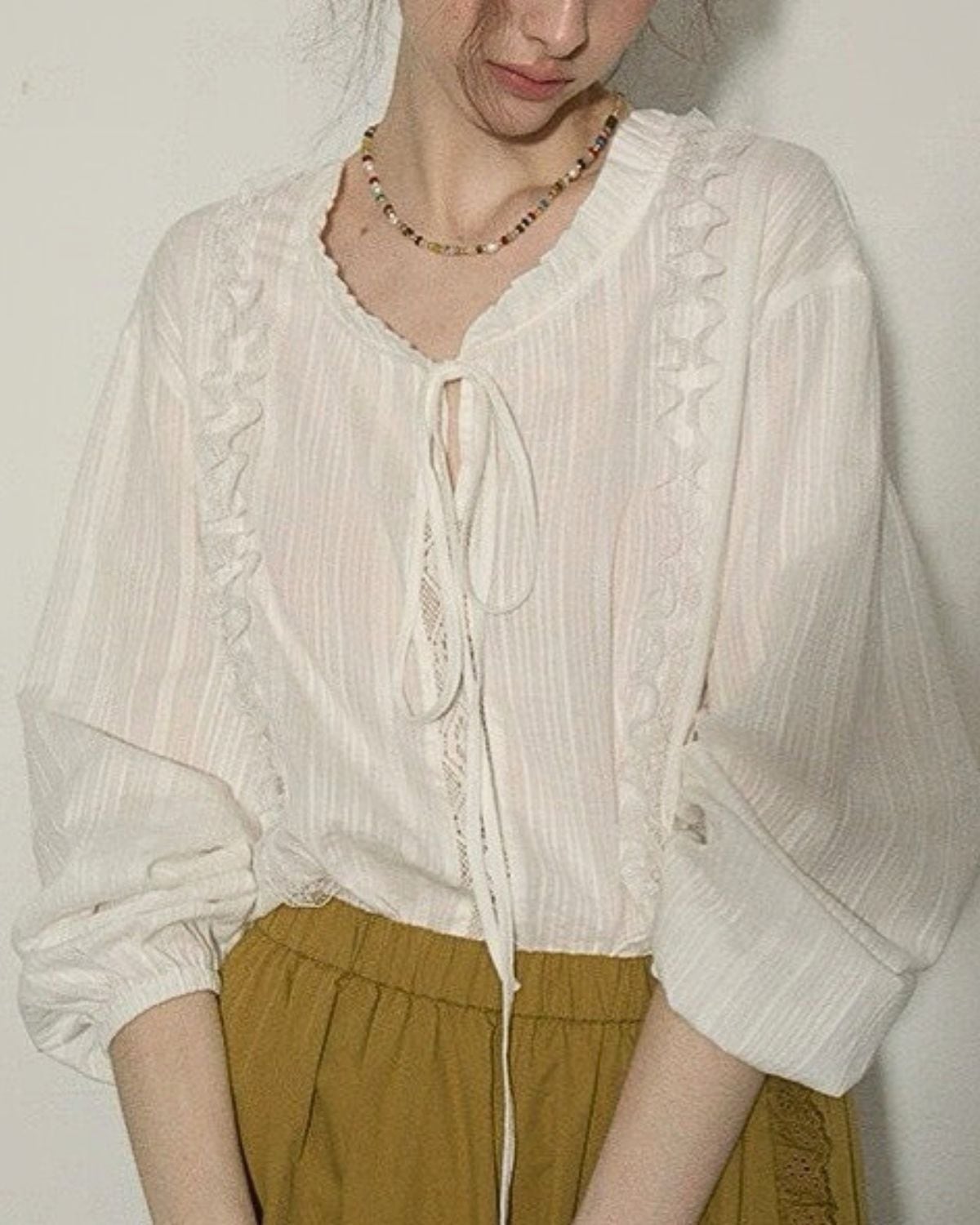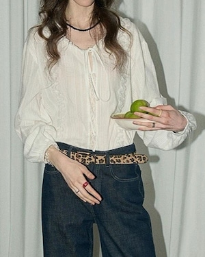 フロントにリボンと縦のフリル、繊細なレースがあしらわれた白いブラウスです。