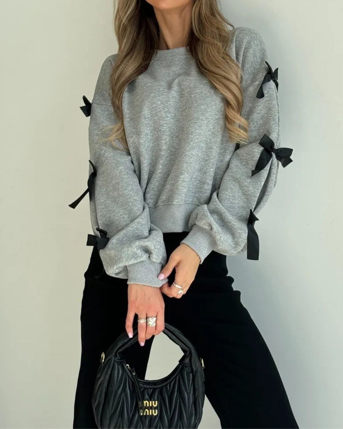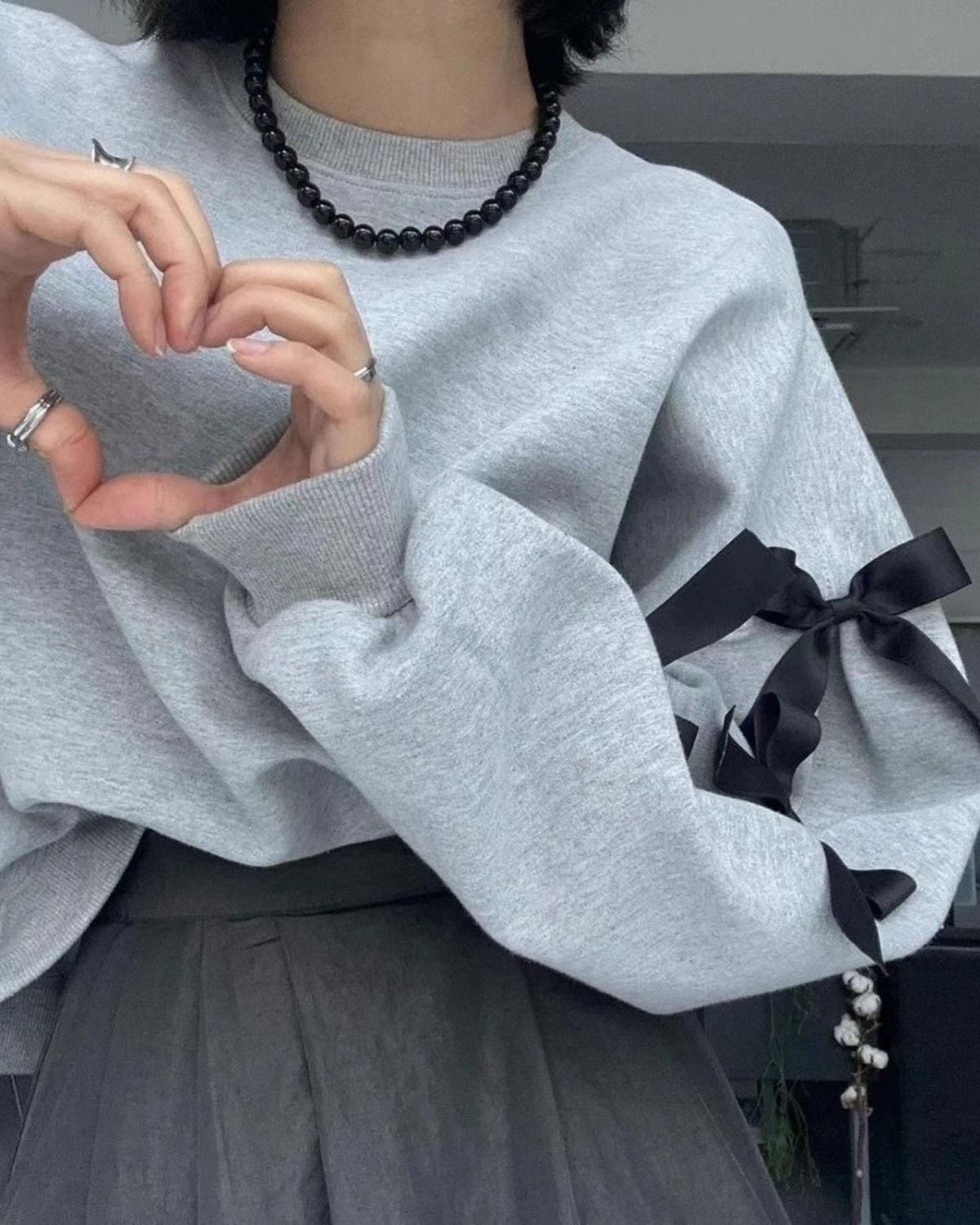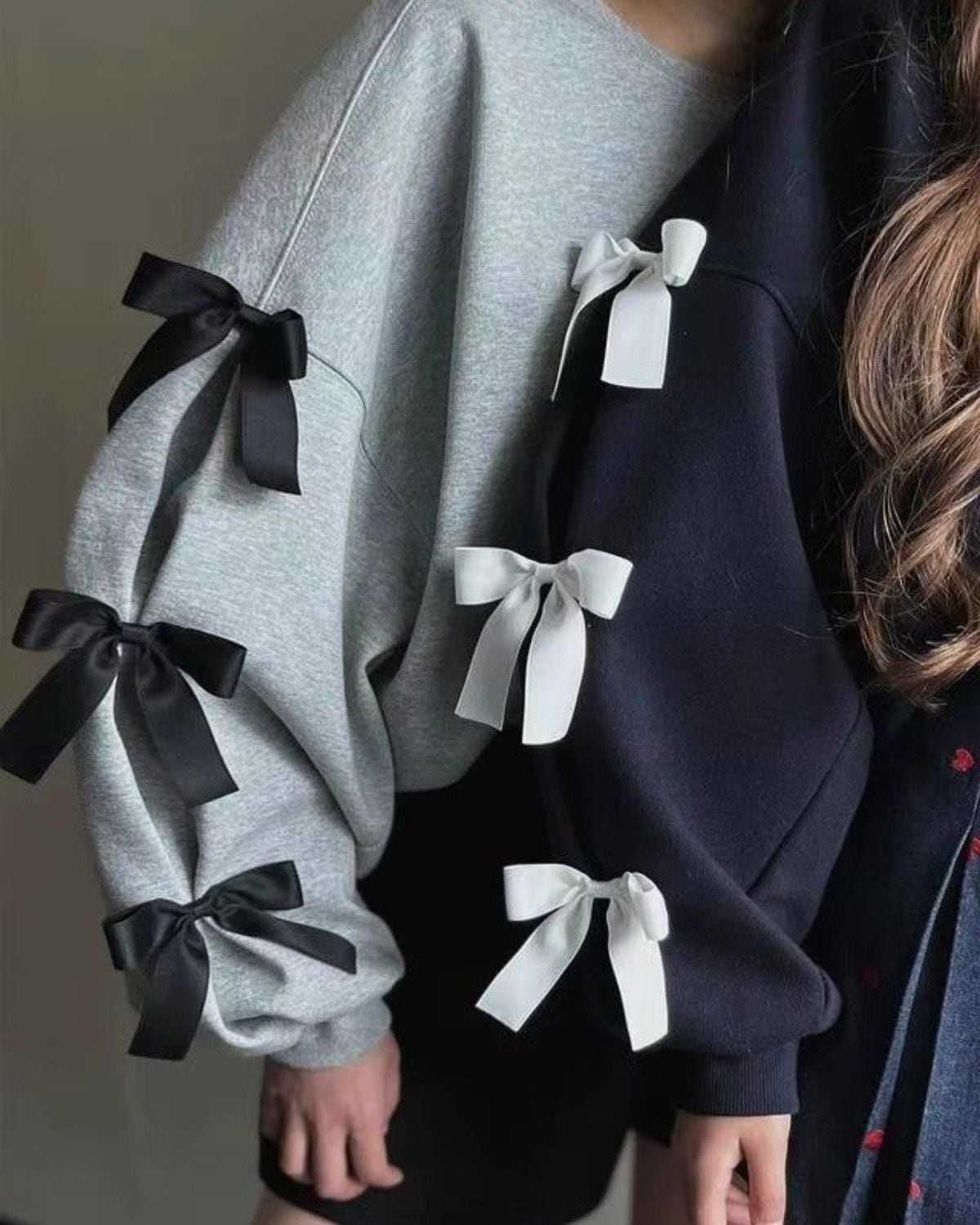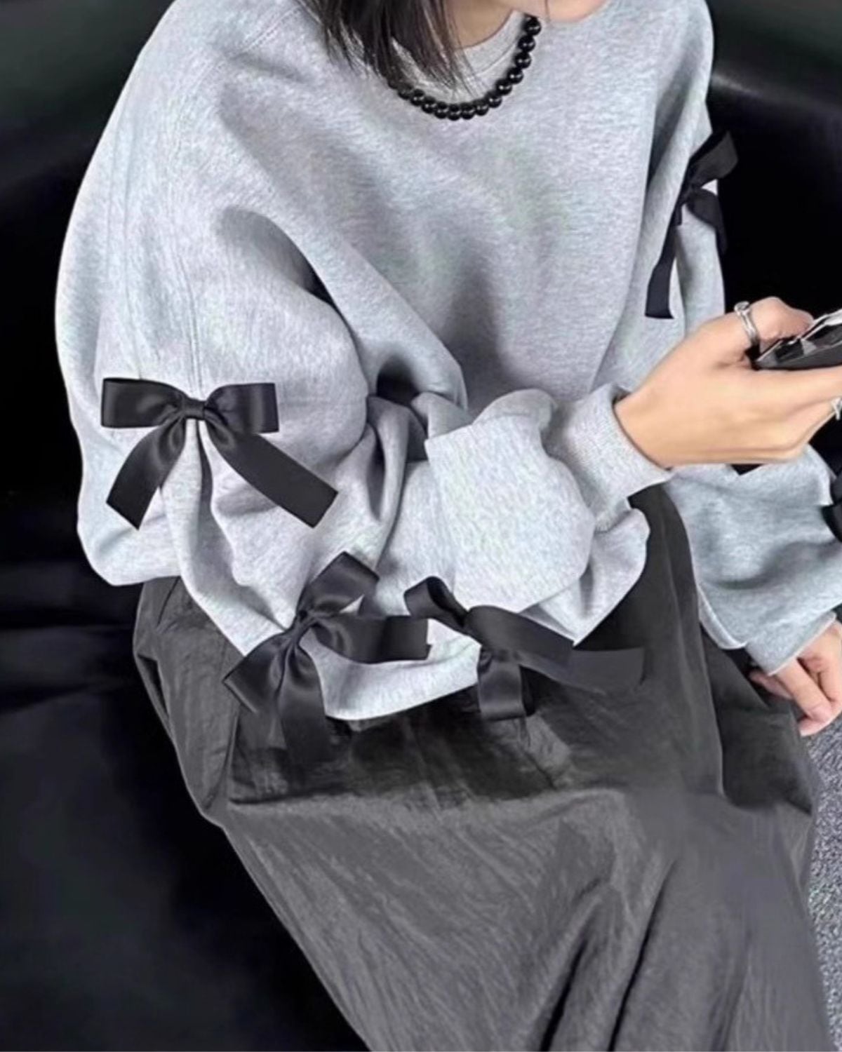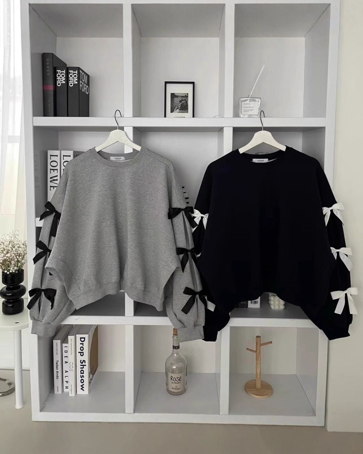 袖に複数のリボンがあしらわれた、ガーリーでボリューム感のあるスウェットです。