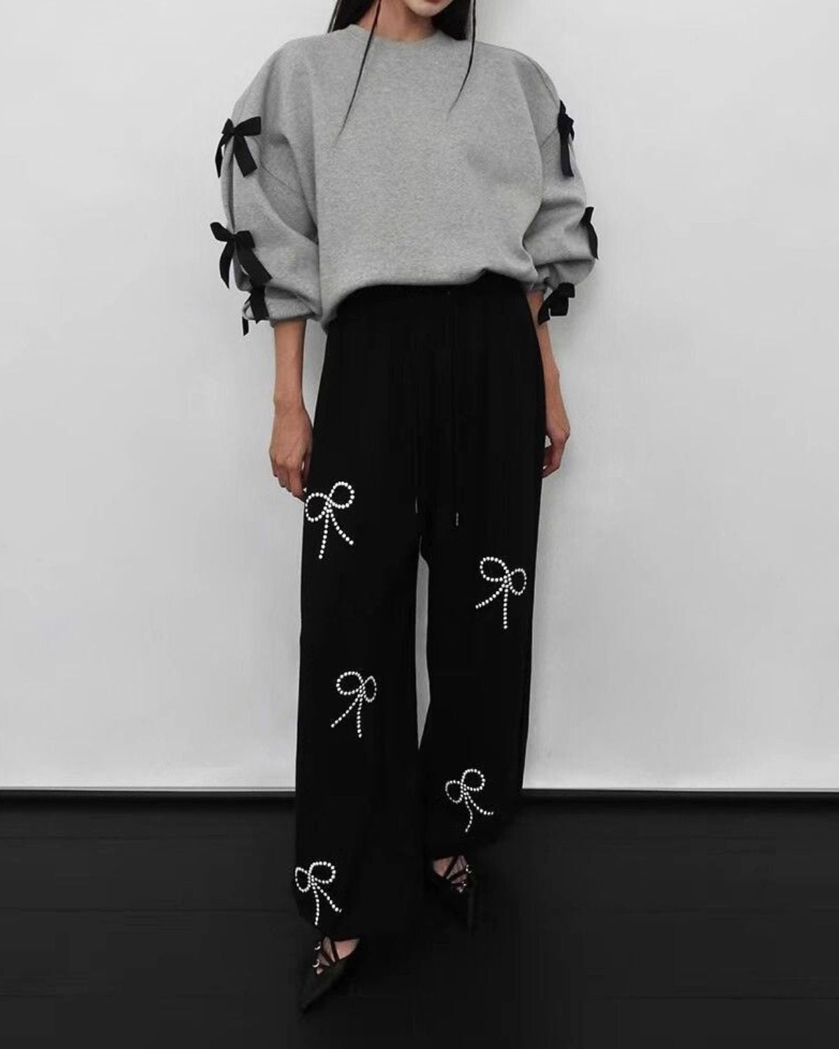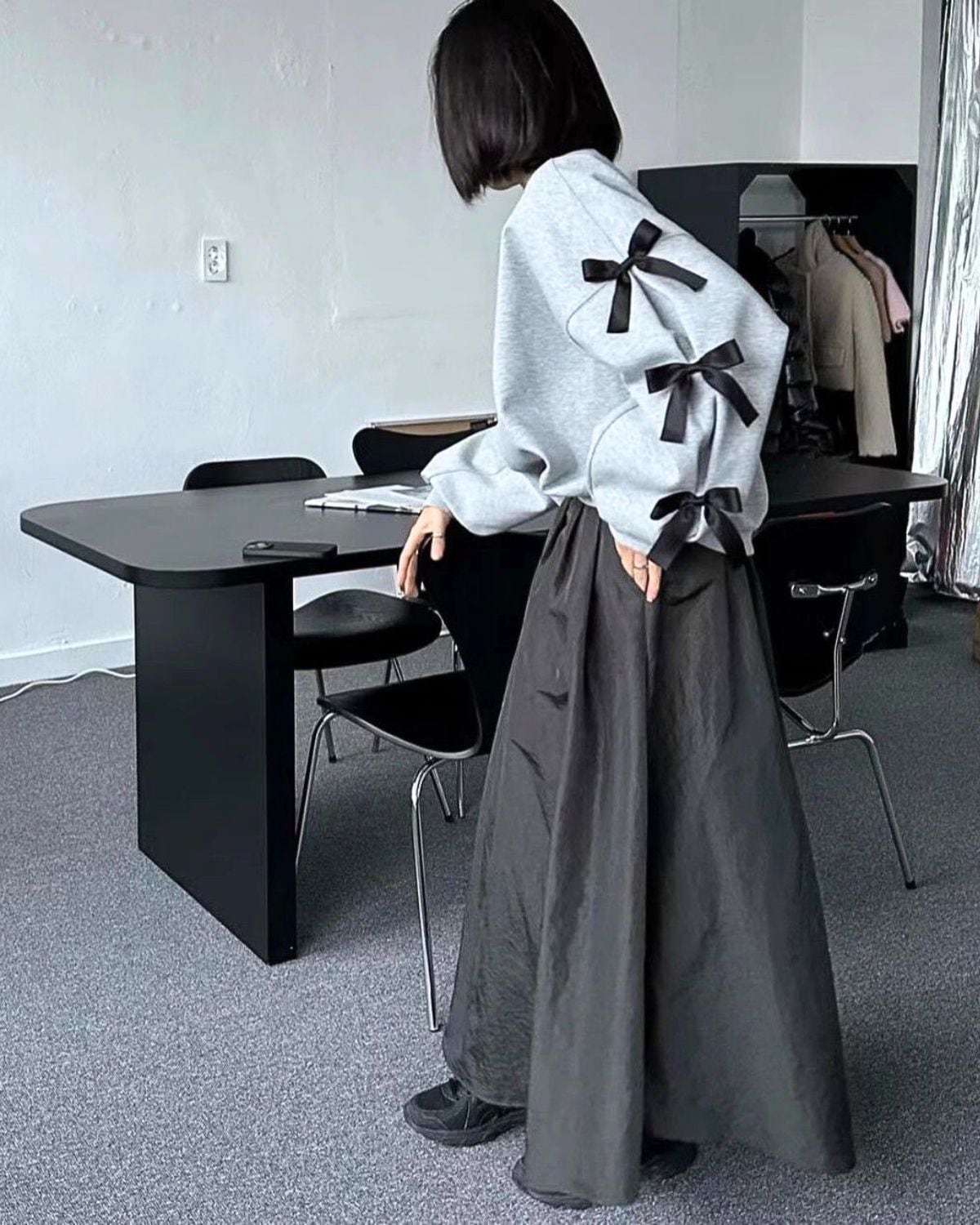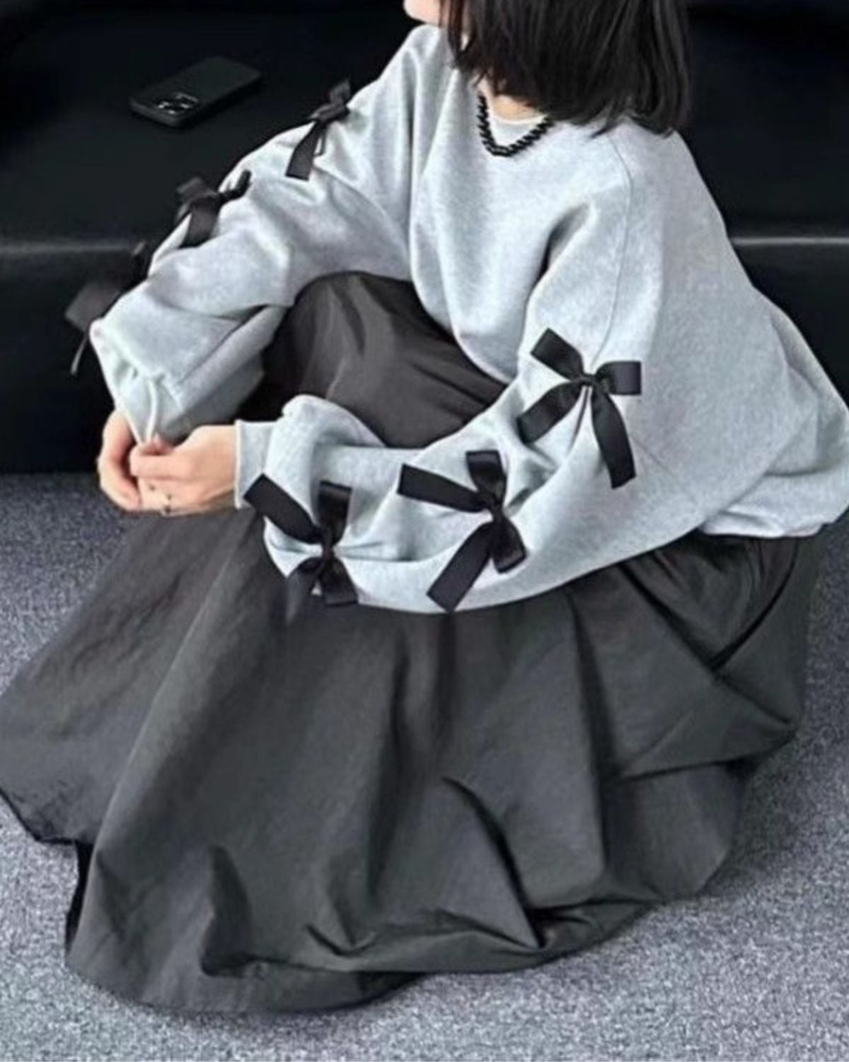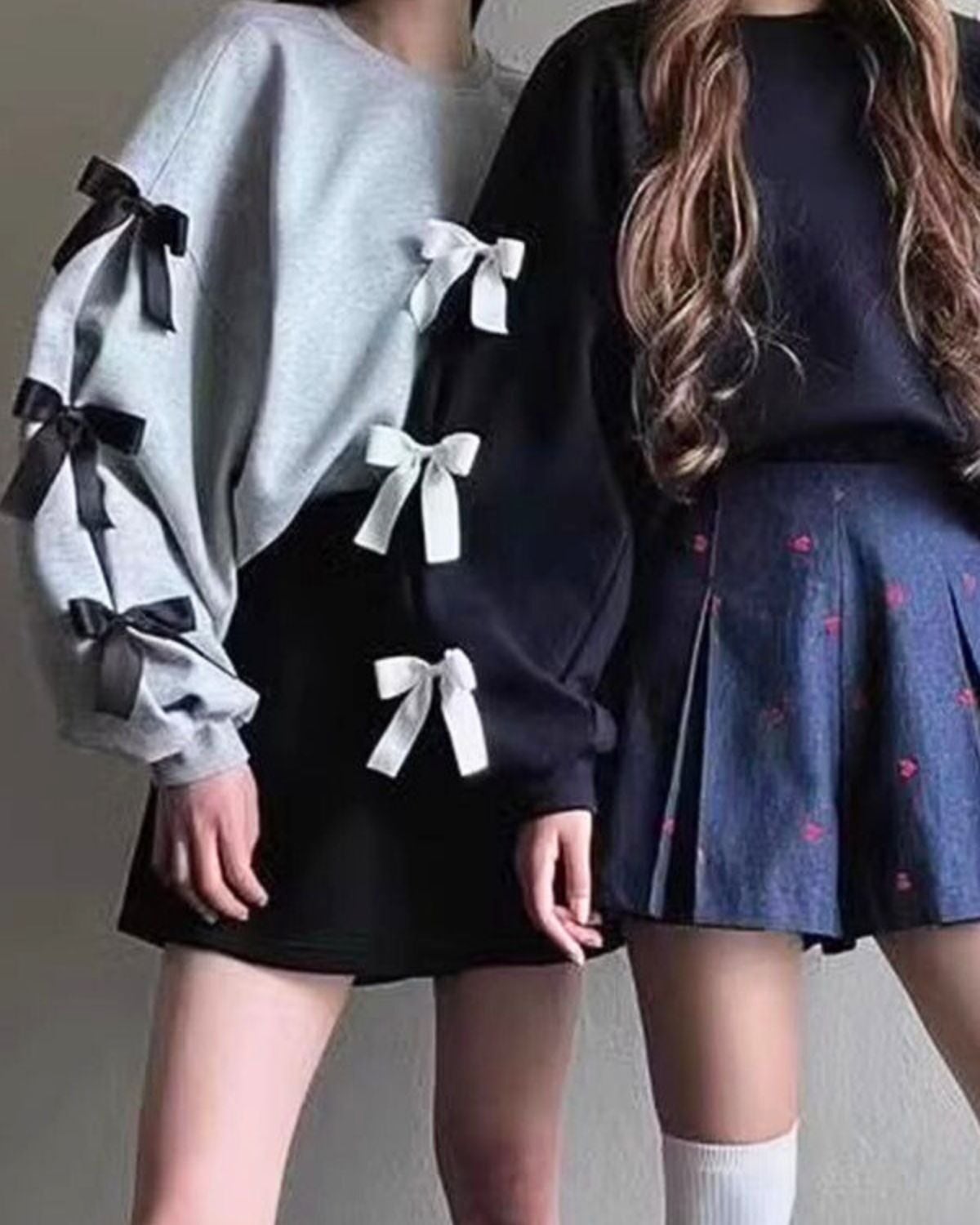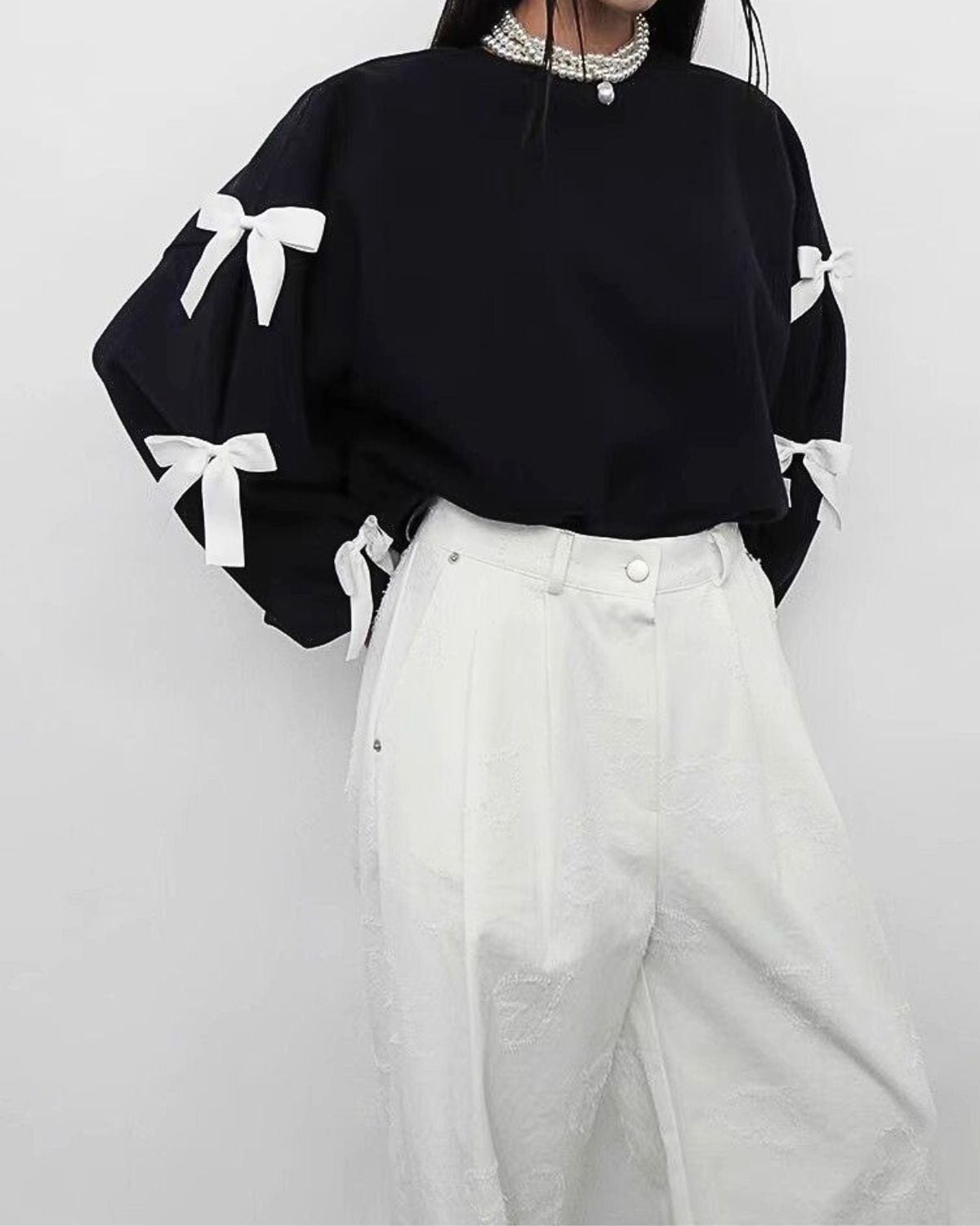 袖に複数のリボンがあしらわれた、ガーリーでボリューム感のあるスウェットです。