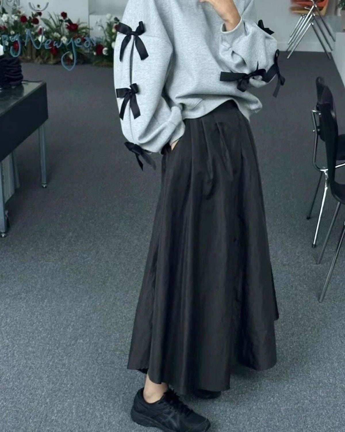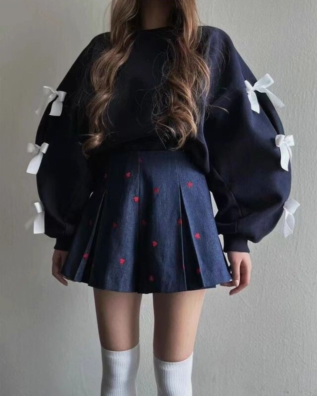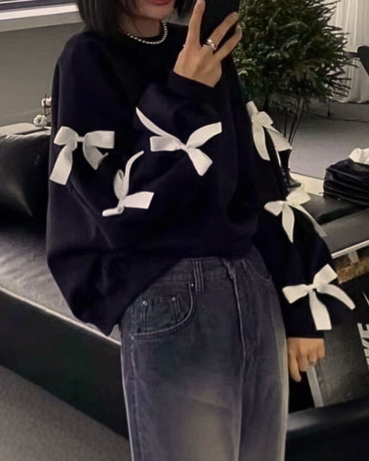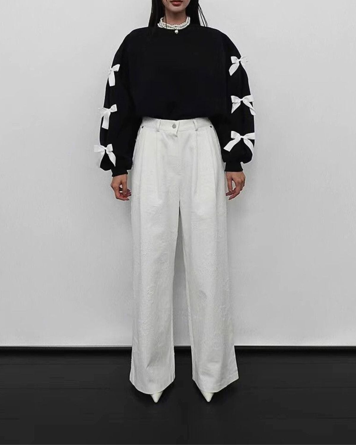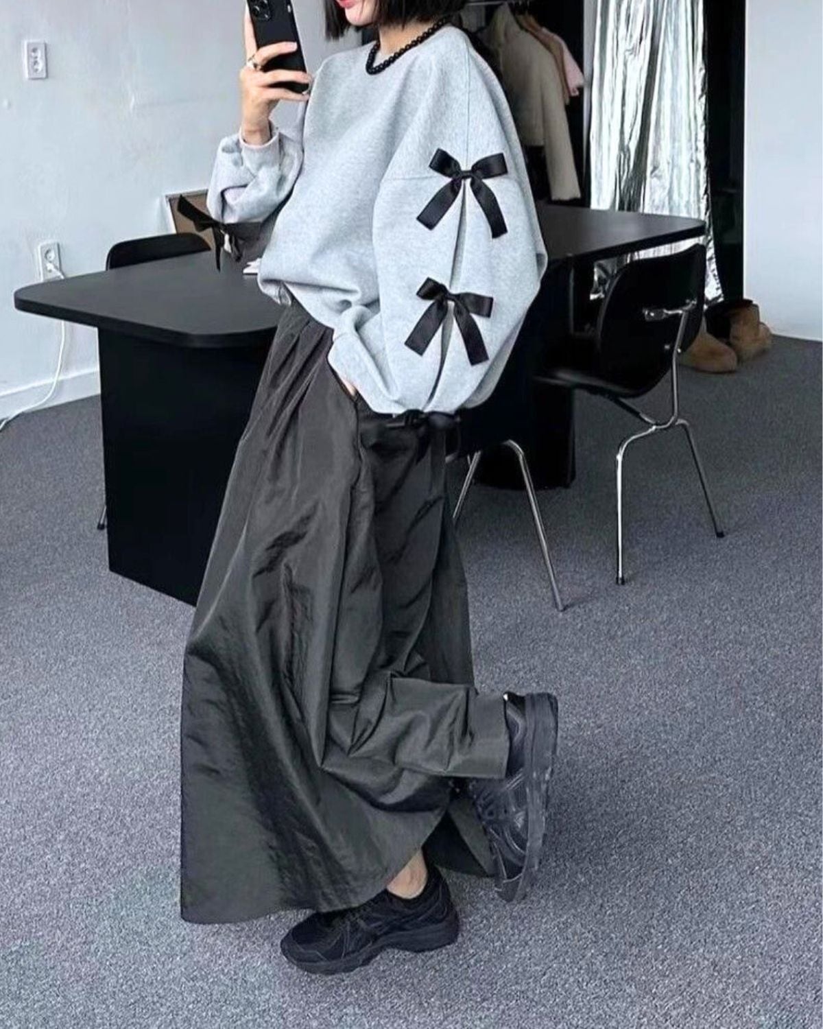 袖に複数のリボンがあしらわれた、ガーリーでボリューム感のあるスウェットです。