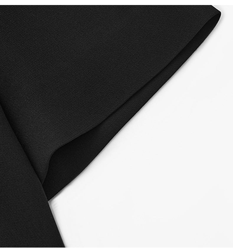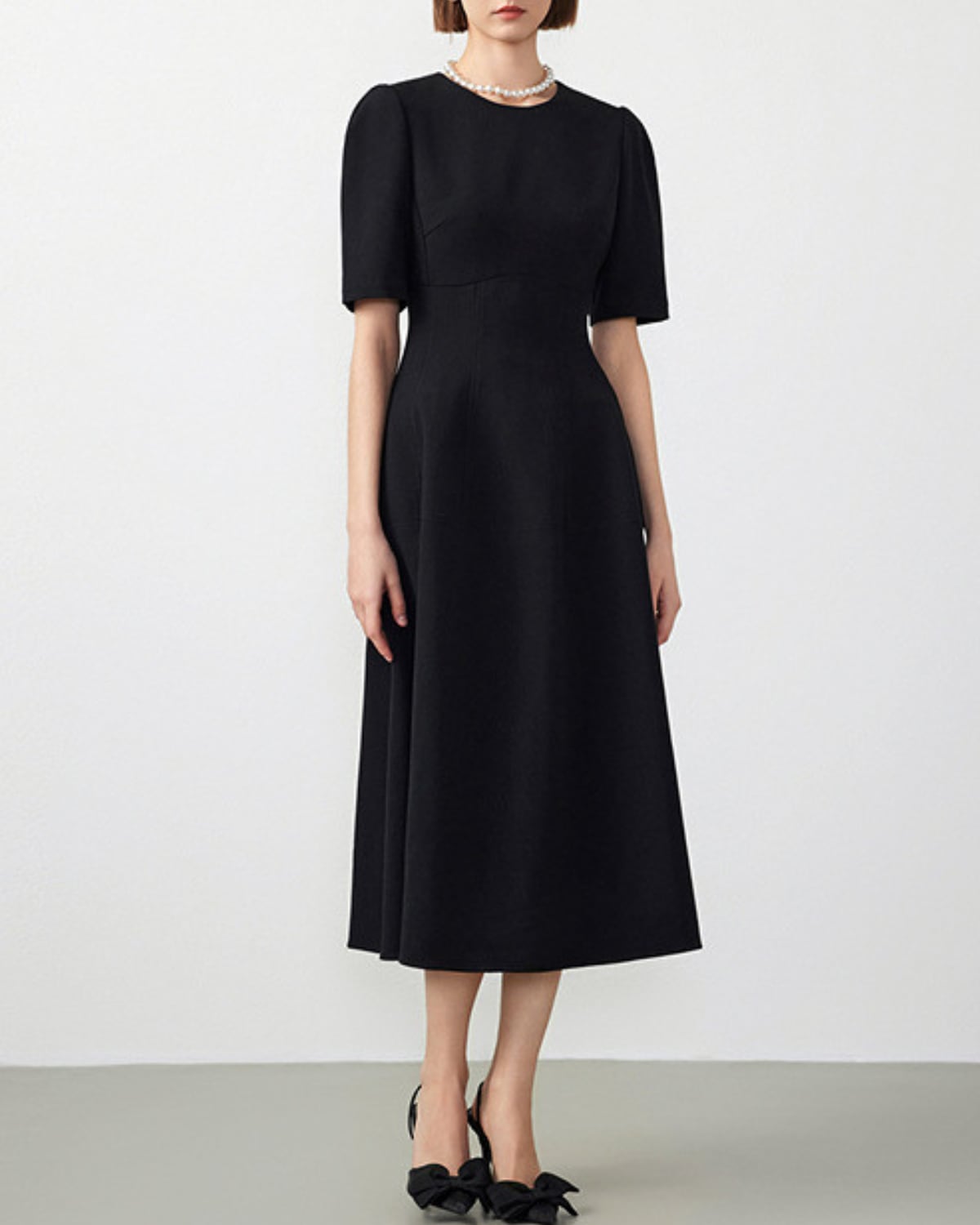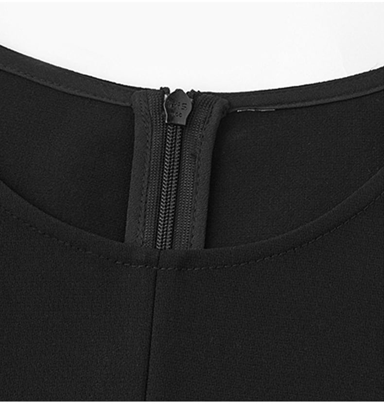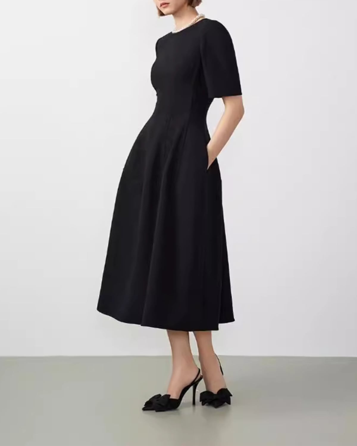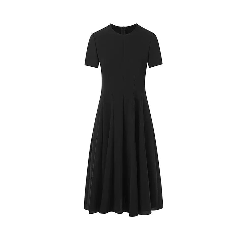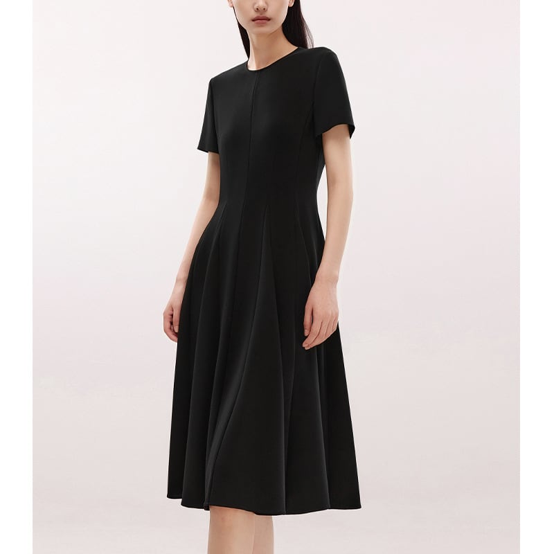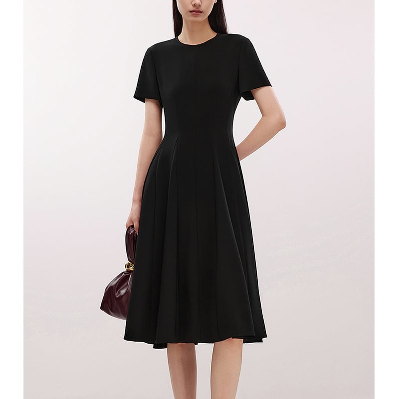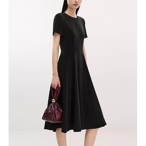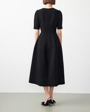 ラウンドネックとフレアウエストのデザインが、体型を美しく見せながら、気になるお腹周りやヒップ周りもすっきりとカバー。