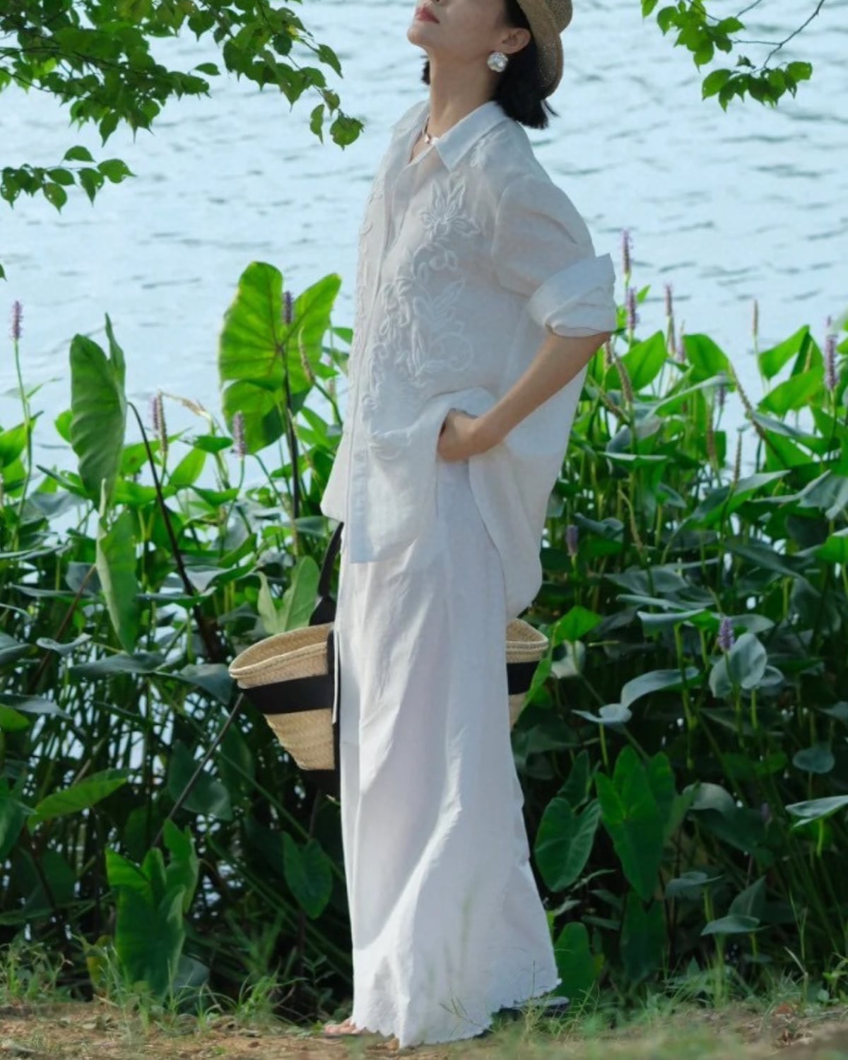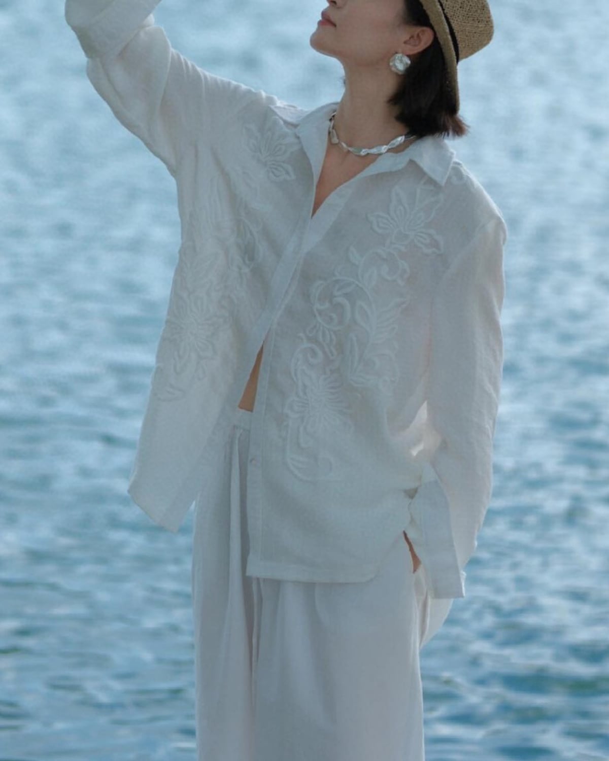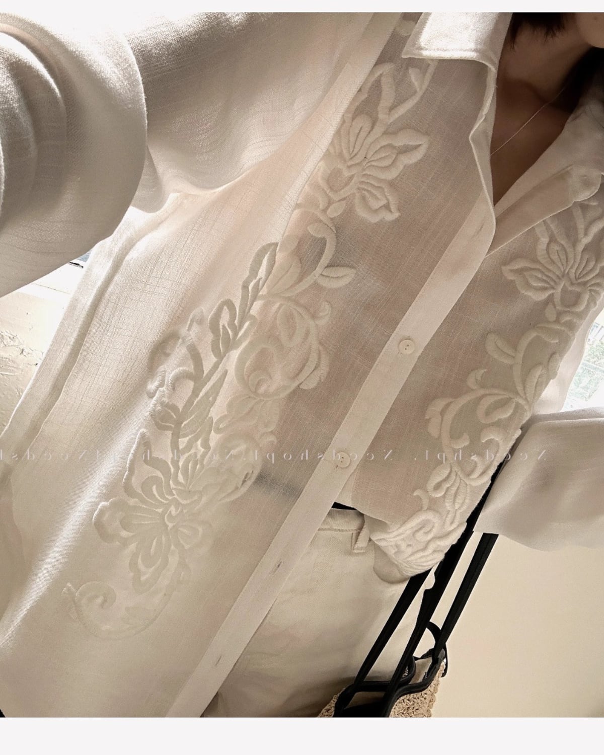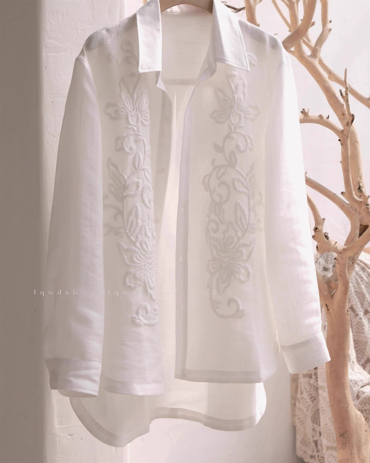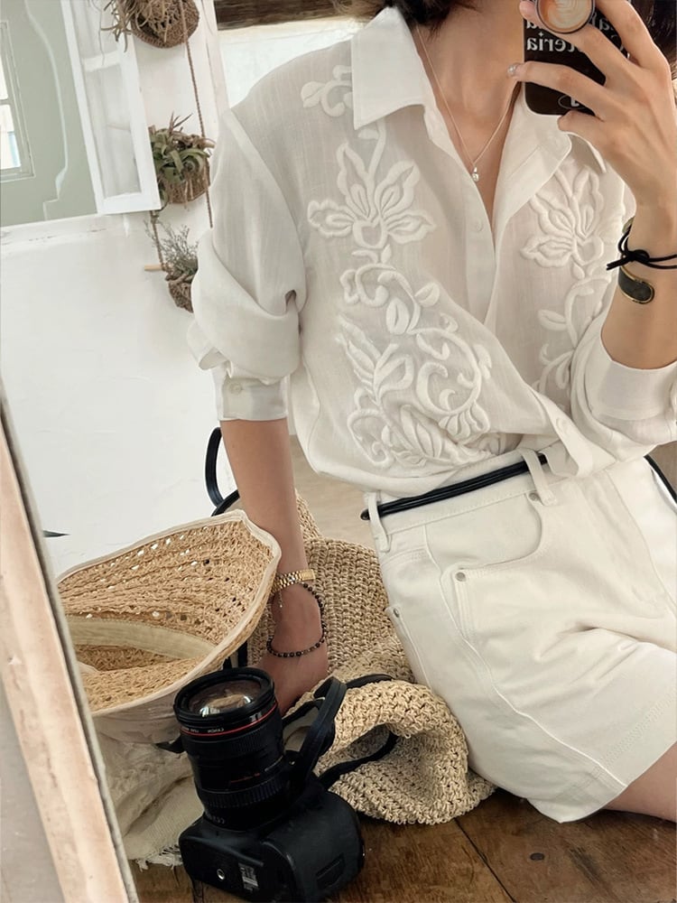 フランス風の上品な、軽くて豪華な刺繍の長袖リネンシャツ。