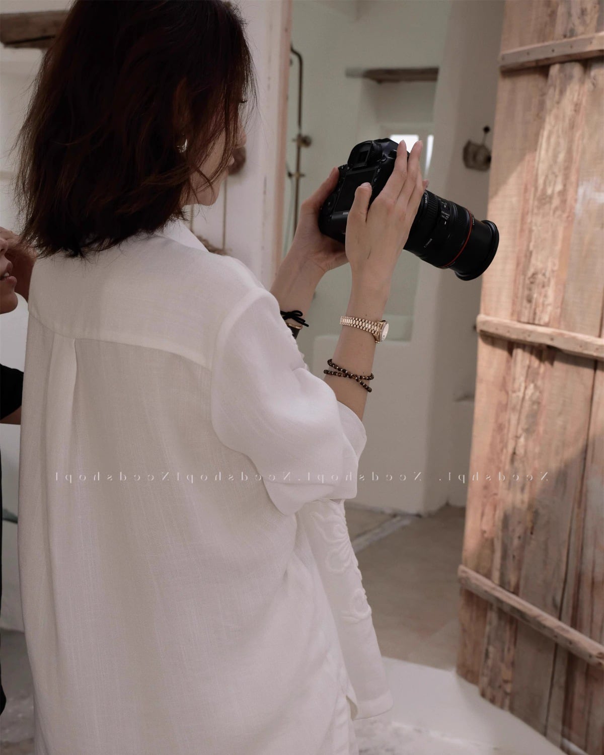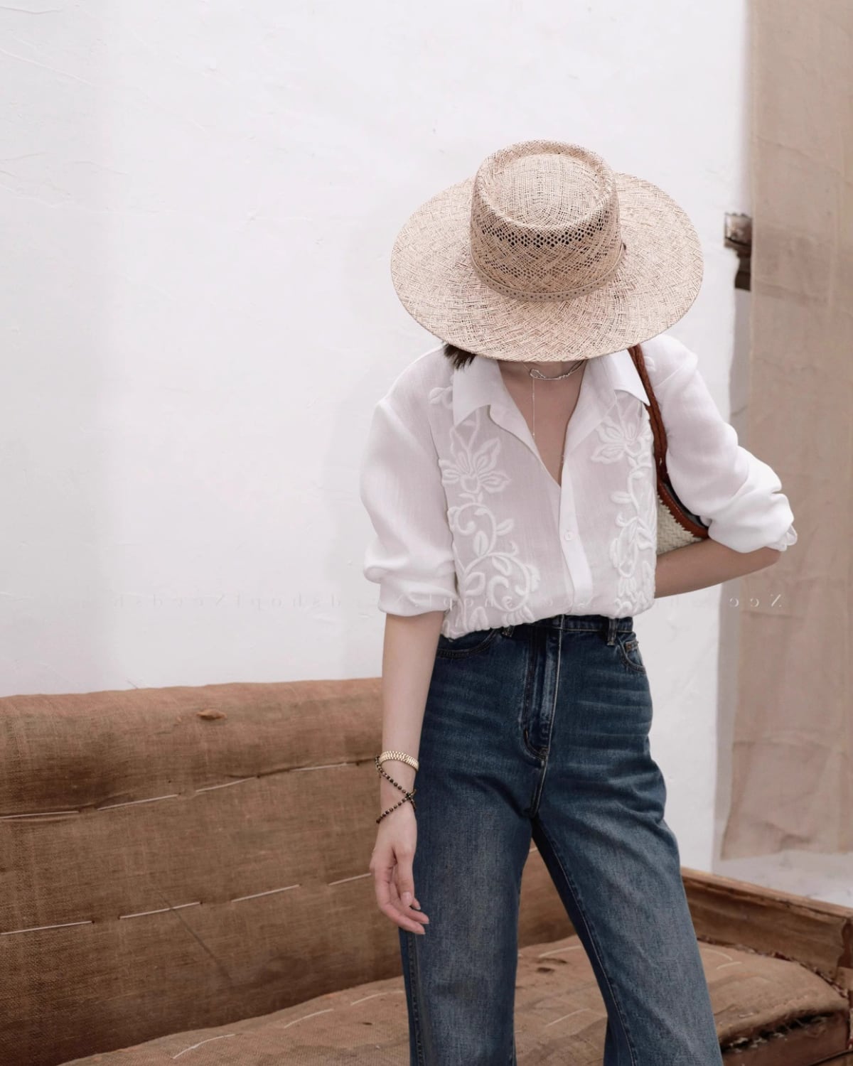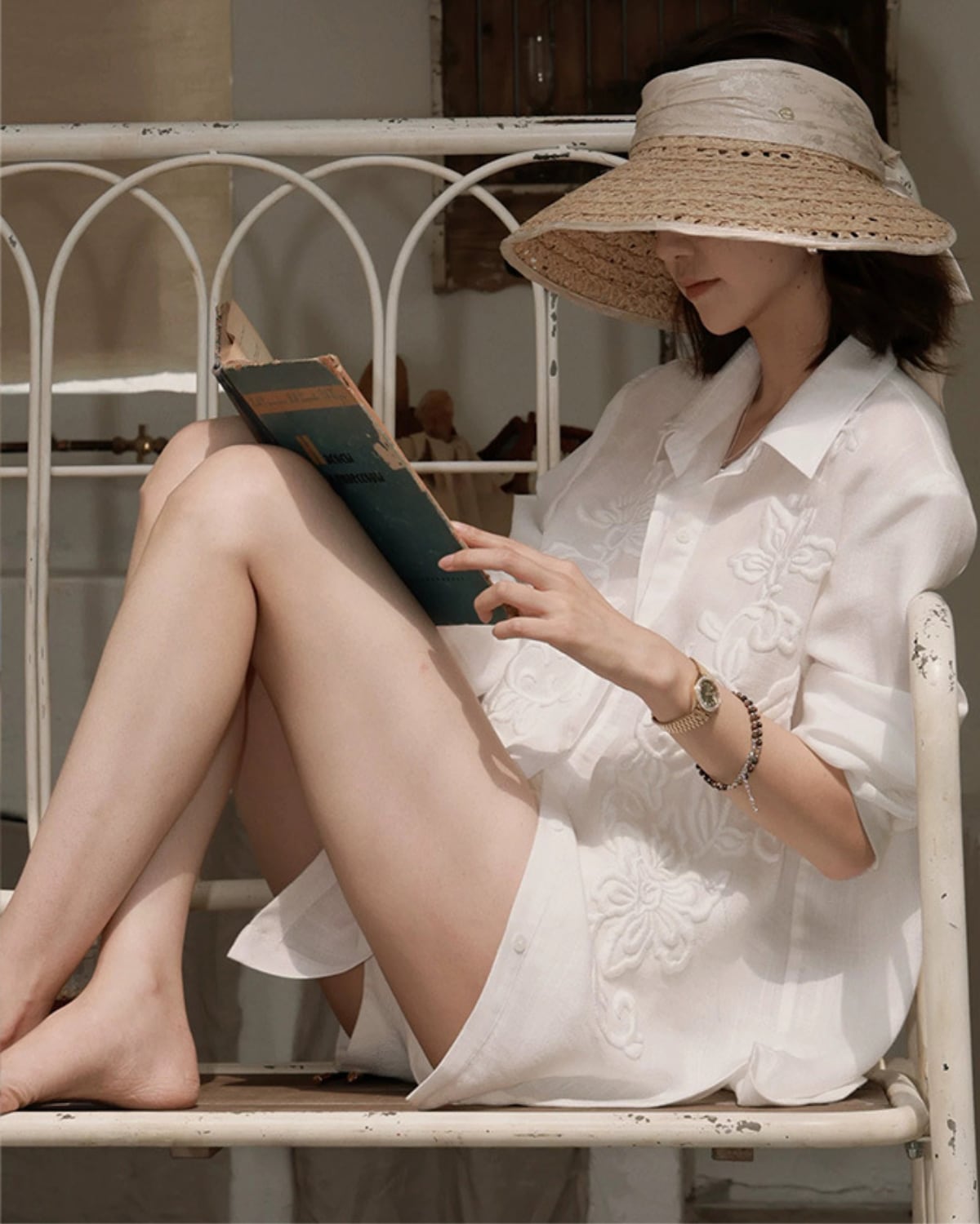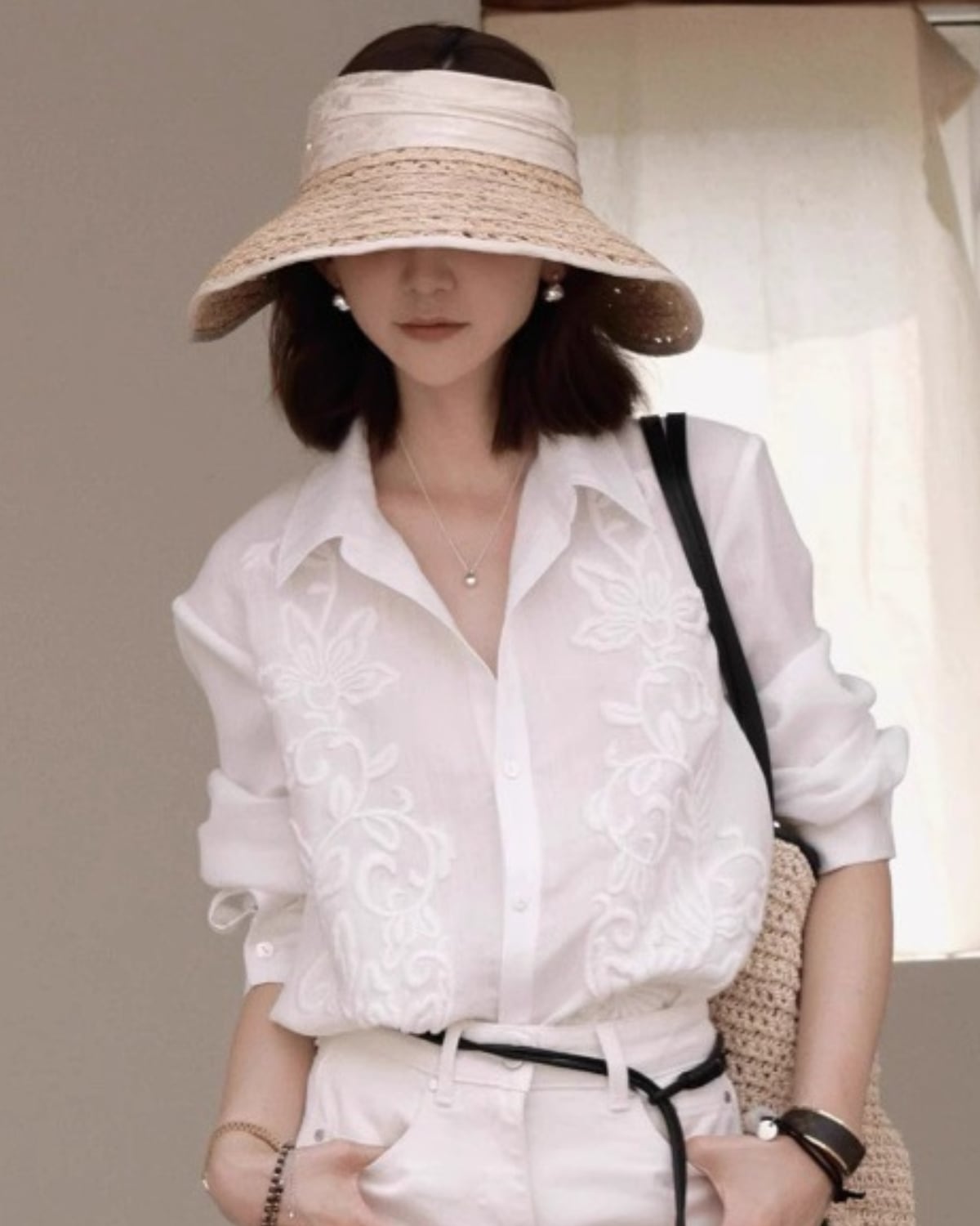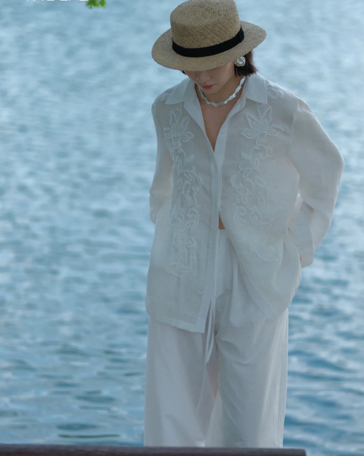 フランス風の上品な、軽くて豪華な刺繍の長袖リネンシャツ。