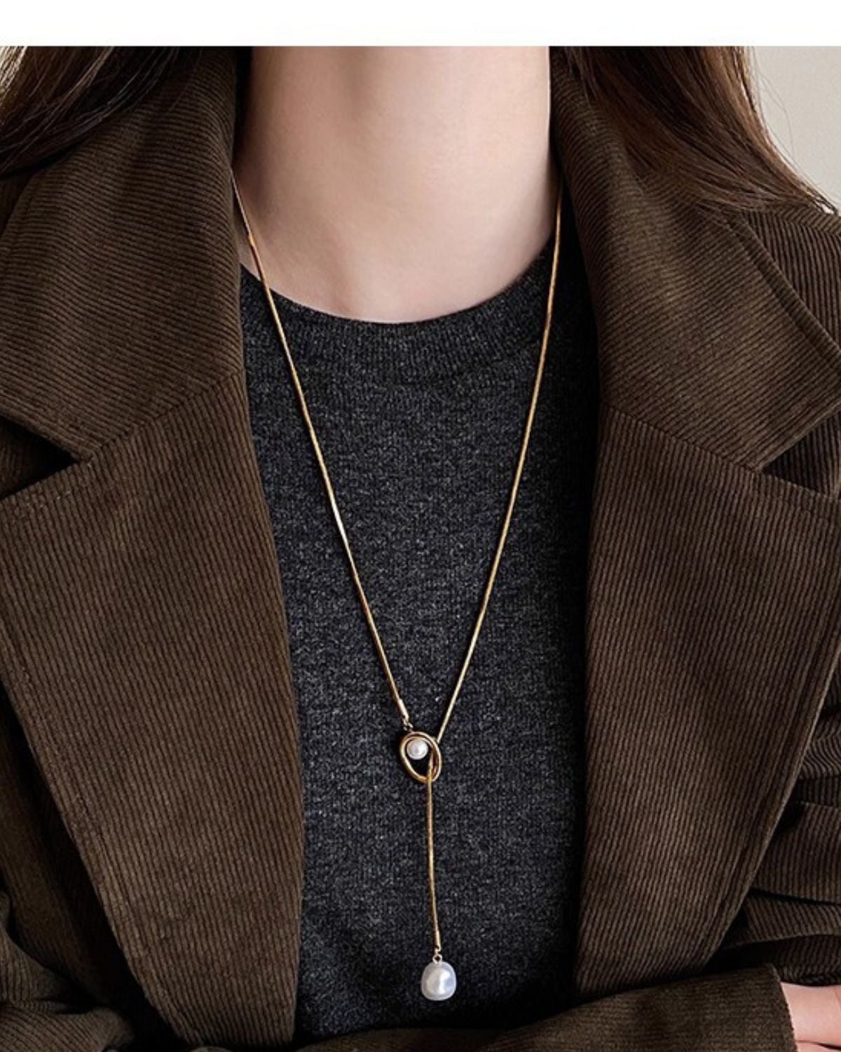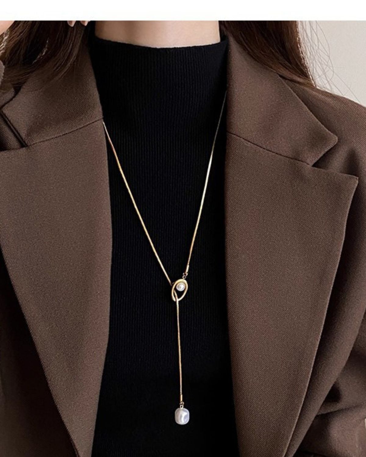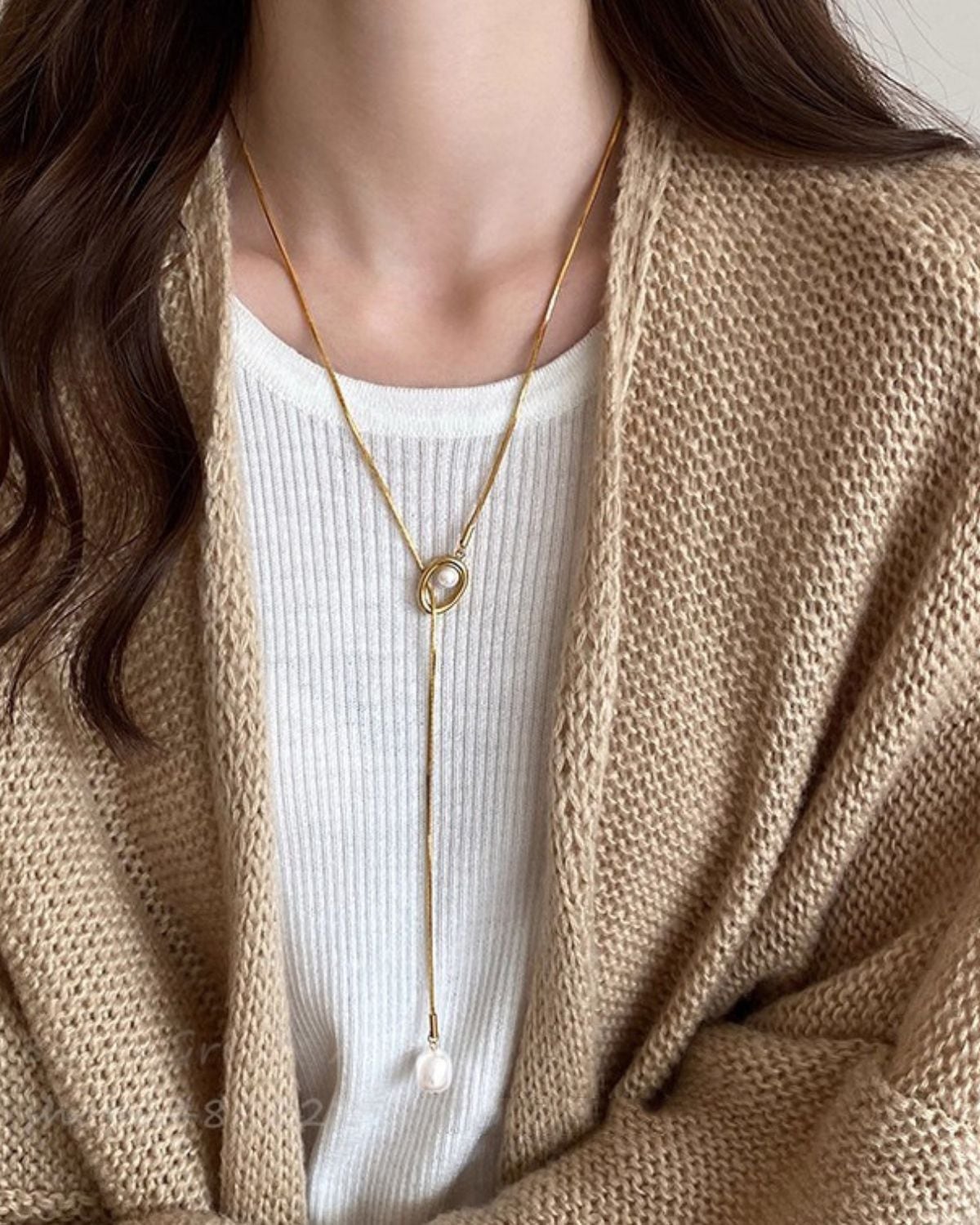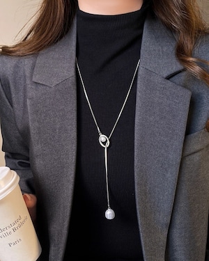 中央のパーツをスライドさせて長さを調節できる、パールをあしらったY字型のラリエット(ロングネックレス)です。一粒パールを配した上品なスタイルで、卒業式や入学式などのフォーマルから日常使いまで幅広く活用できます。