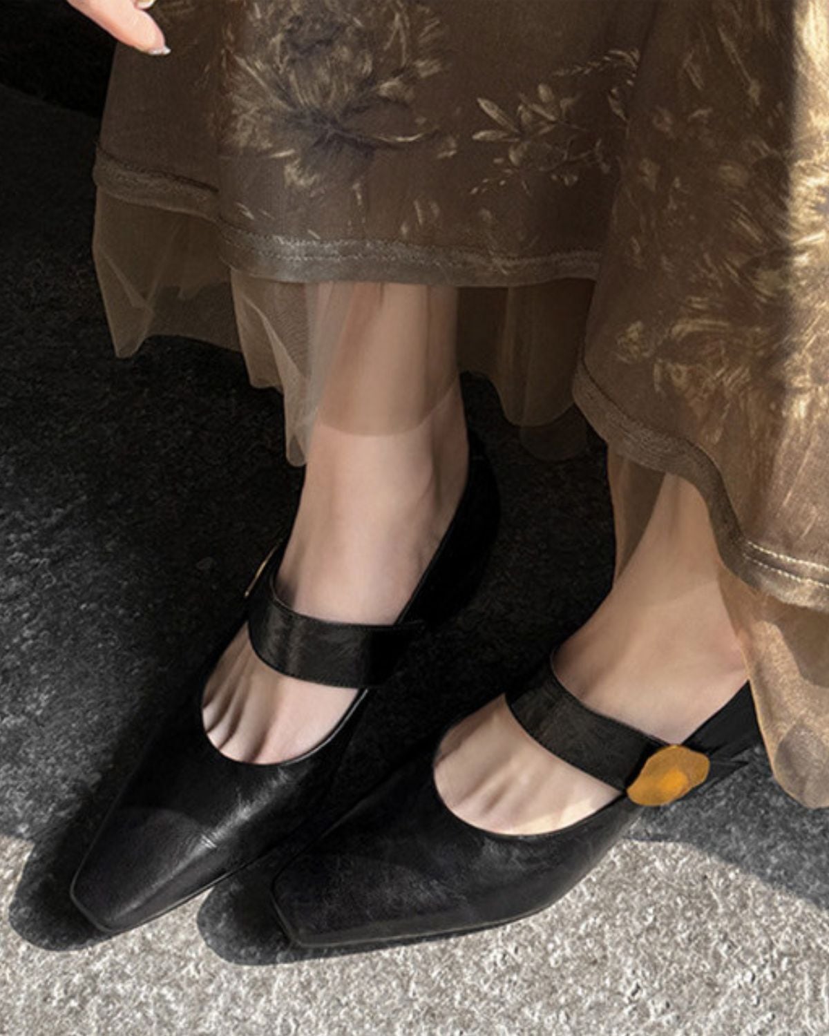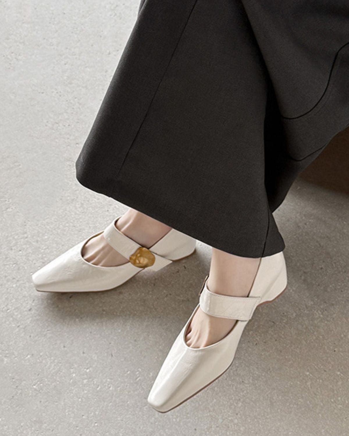 クラシックなジェーンスタイルのスクエアトゥパンプスです。上品さと安定感を兼ね備えているため、デニムに合わせて足元に上品さをプラスしたり、スカートやワンピースと合わせてクラシカルな雰囲気になります。