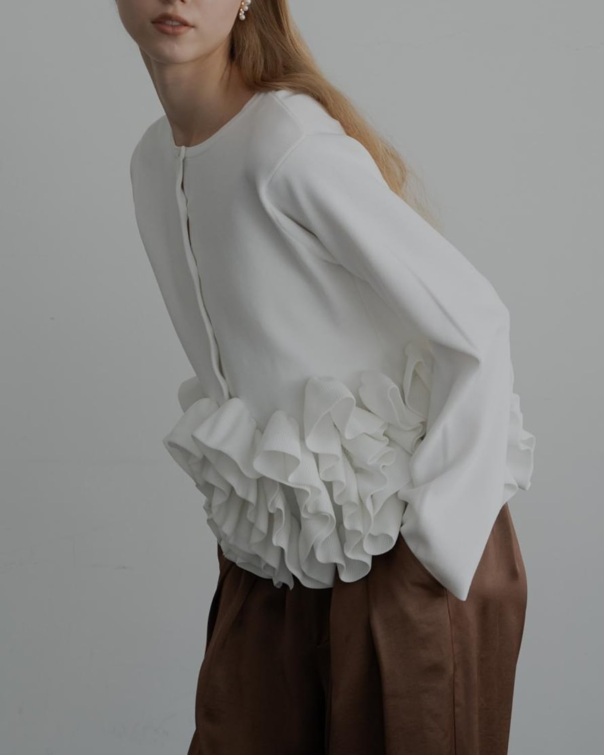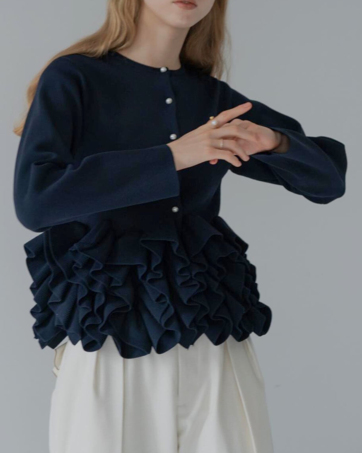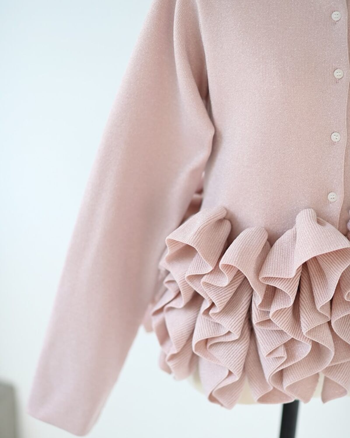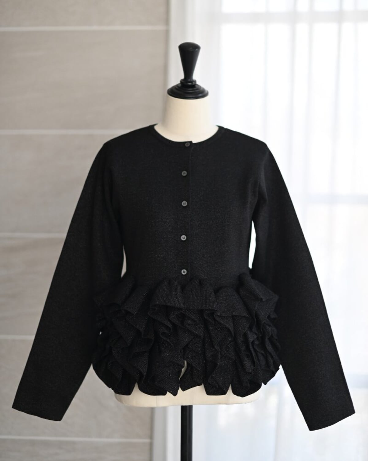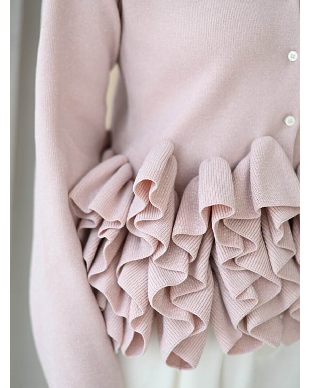 裾に贅沢にあしらわれたフリルが特徴のフリルヘムニットカーディガン。