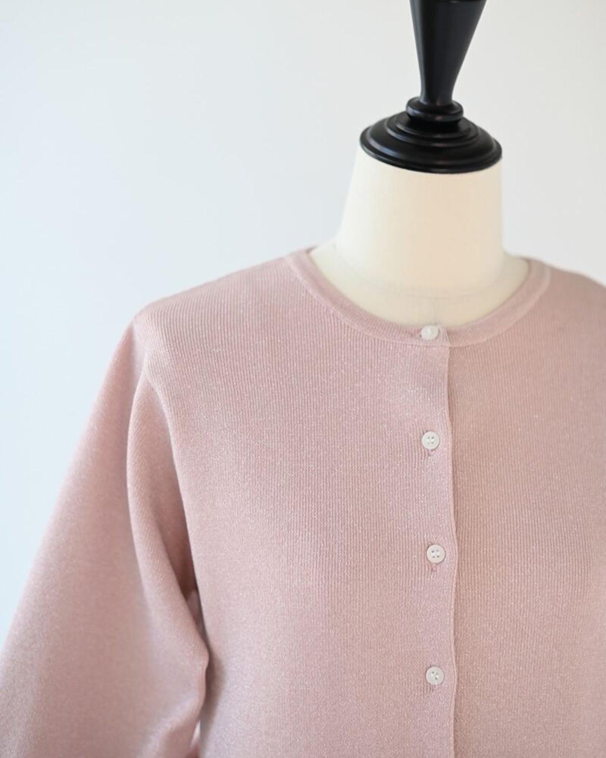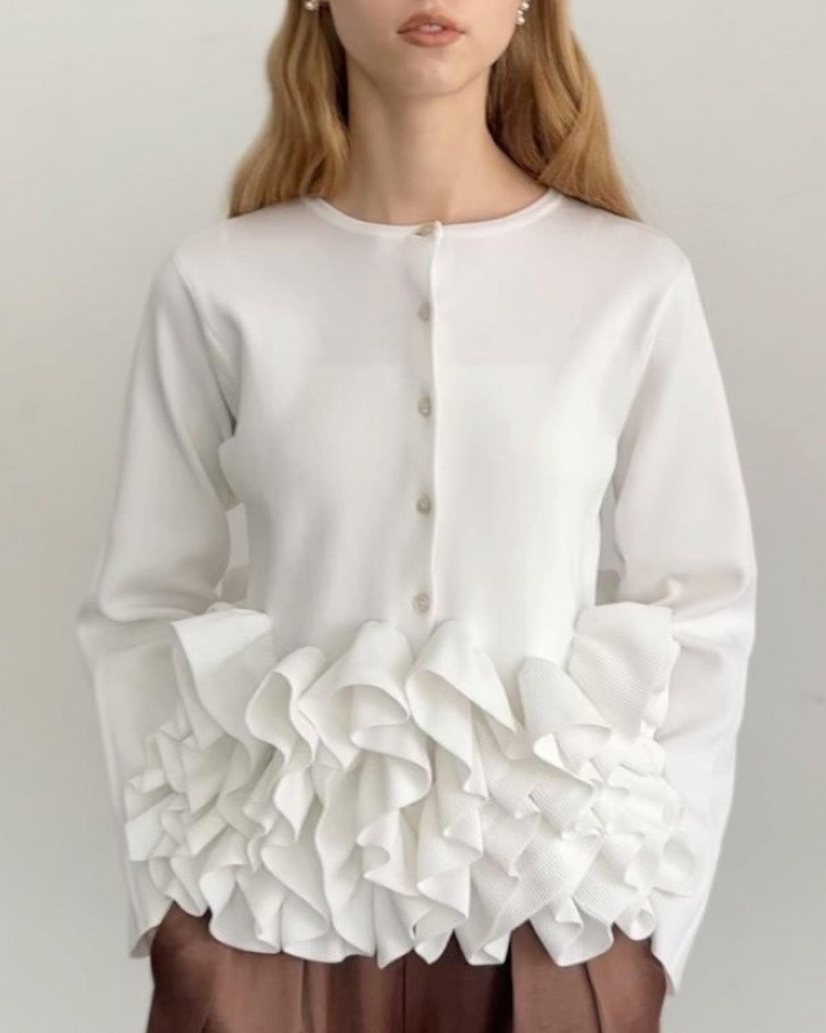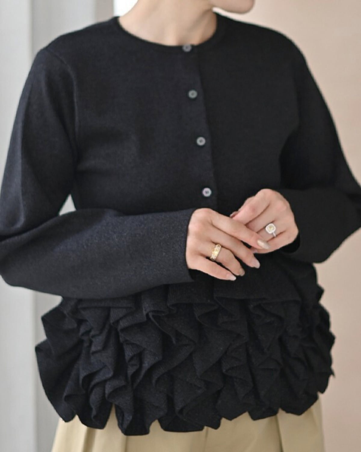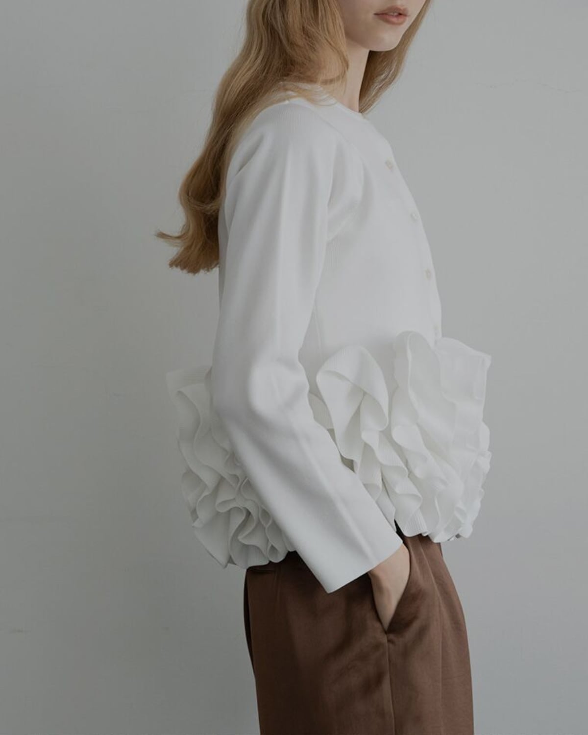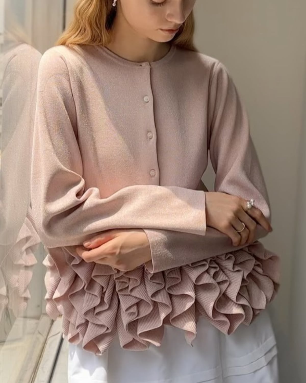 裾に贅沢にあしらわれたフリルが特徴のフリルヘムニットカーディガン。