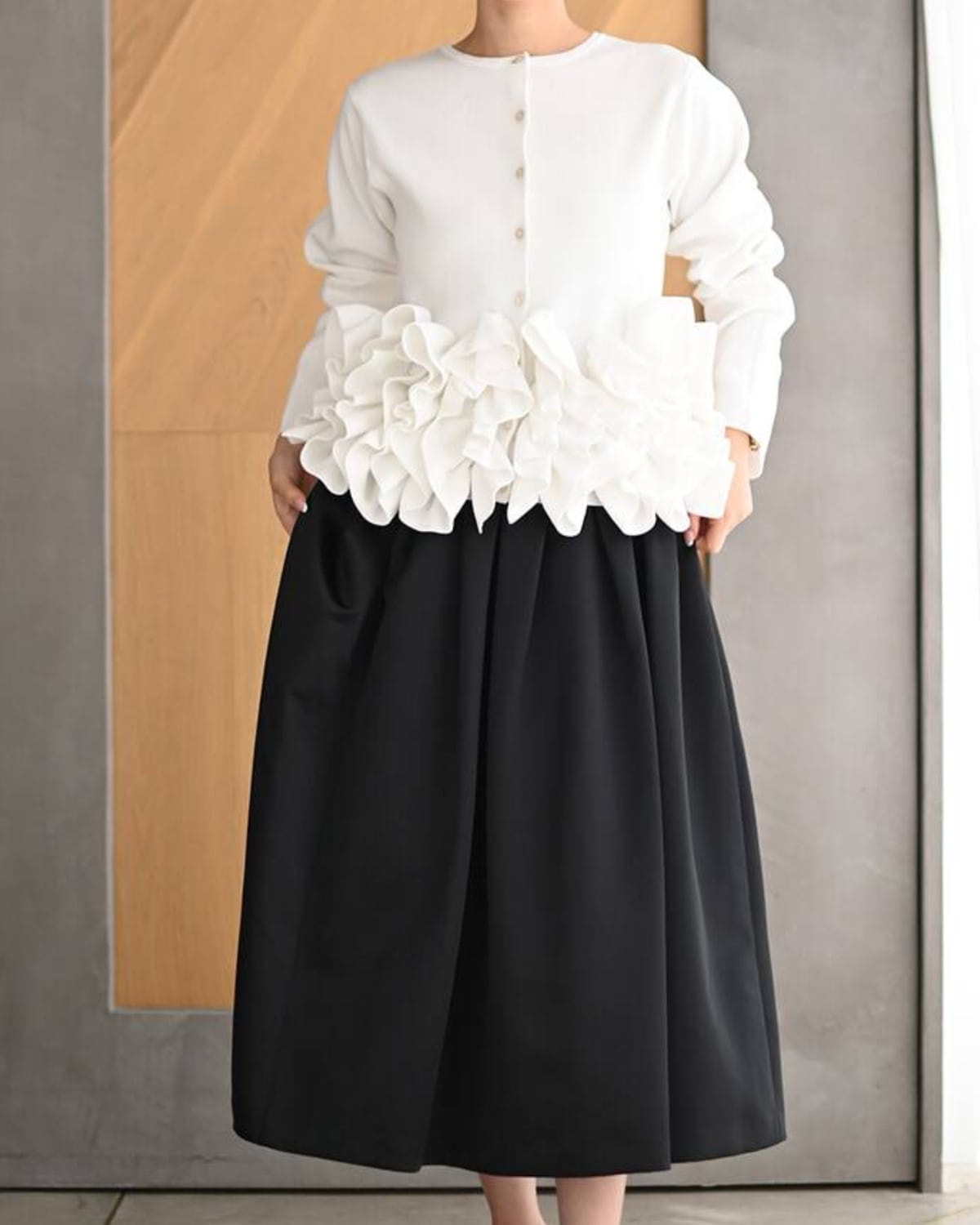 上品なディティールで、立体的なフリルがアクセントになり、華やかさと上品さを演出。オケージョンや特別な日などの幅広いシーンで活躍します。
