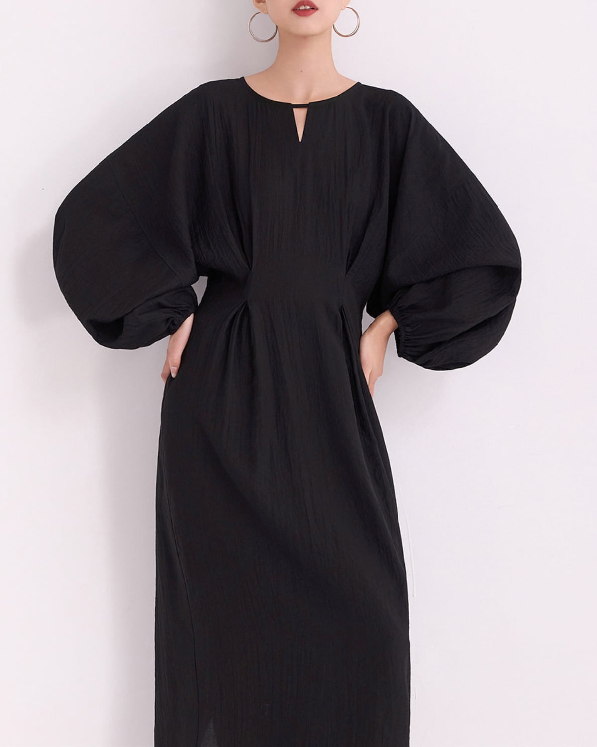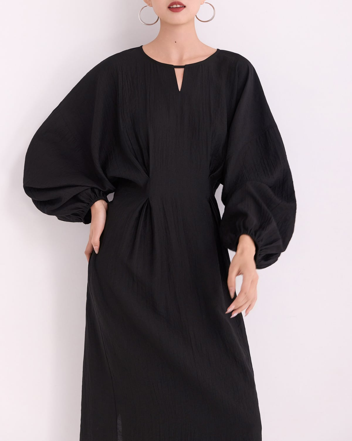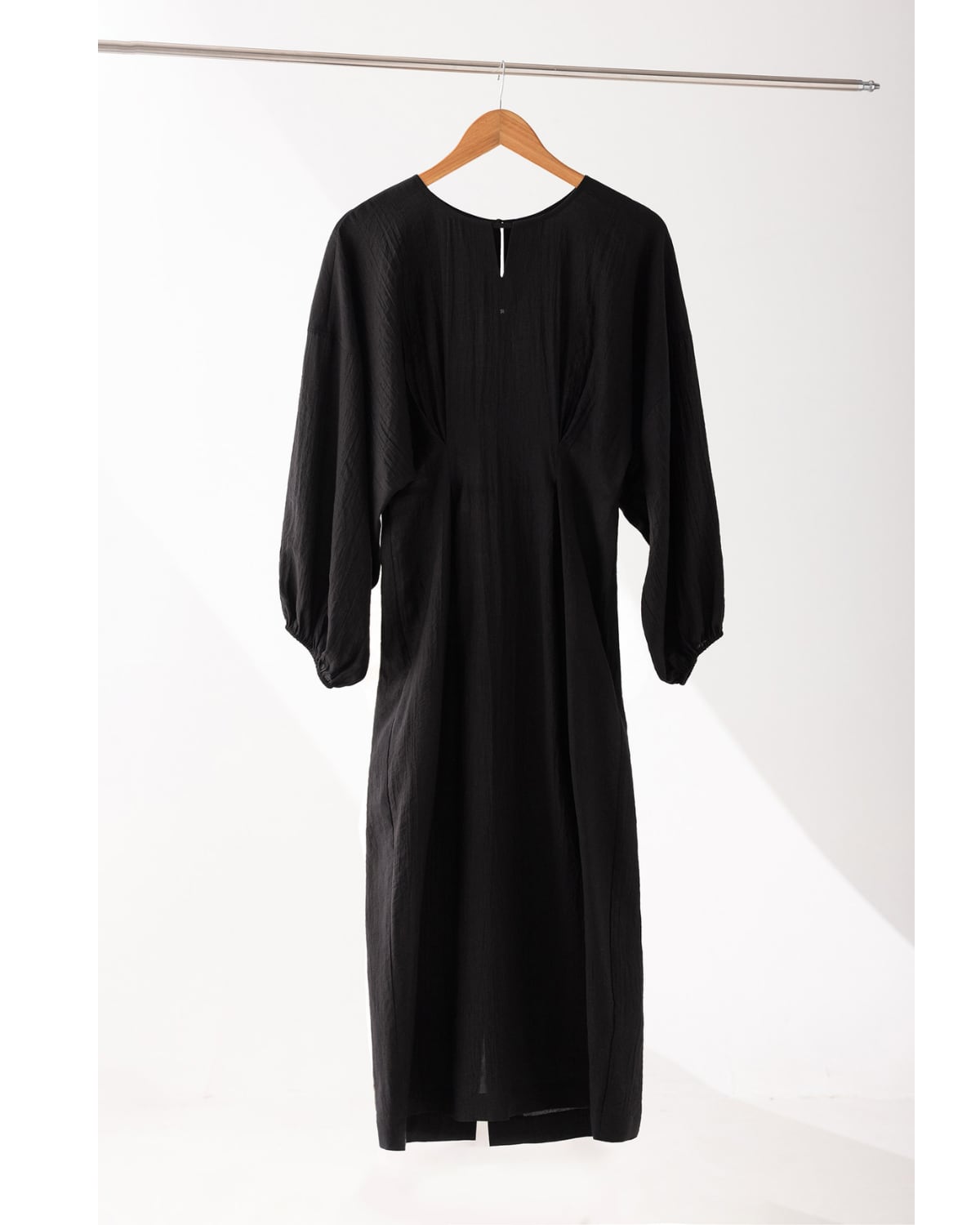 程よいフィット感のあるウエストタックに大きなランタンスリーブが特徴のワンピース。