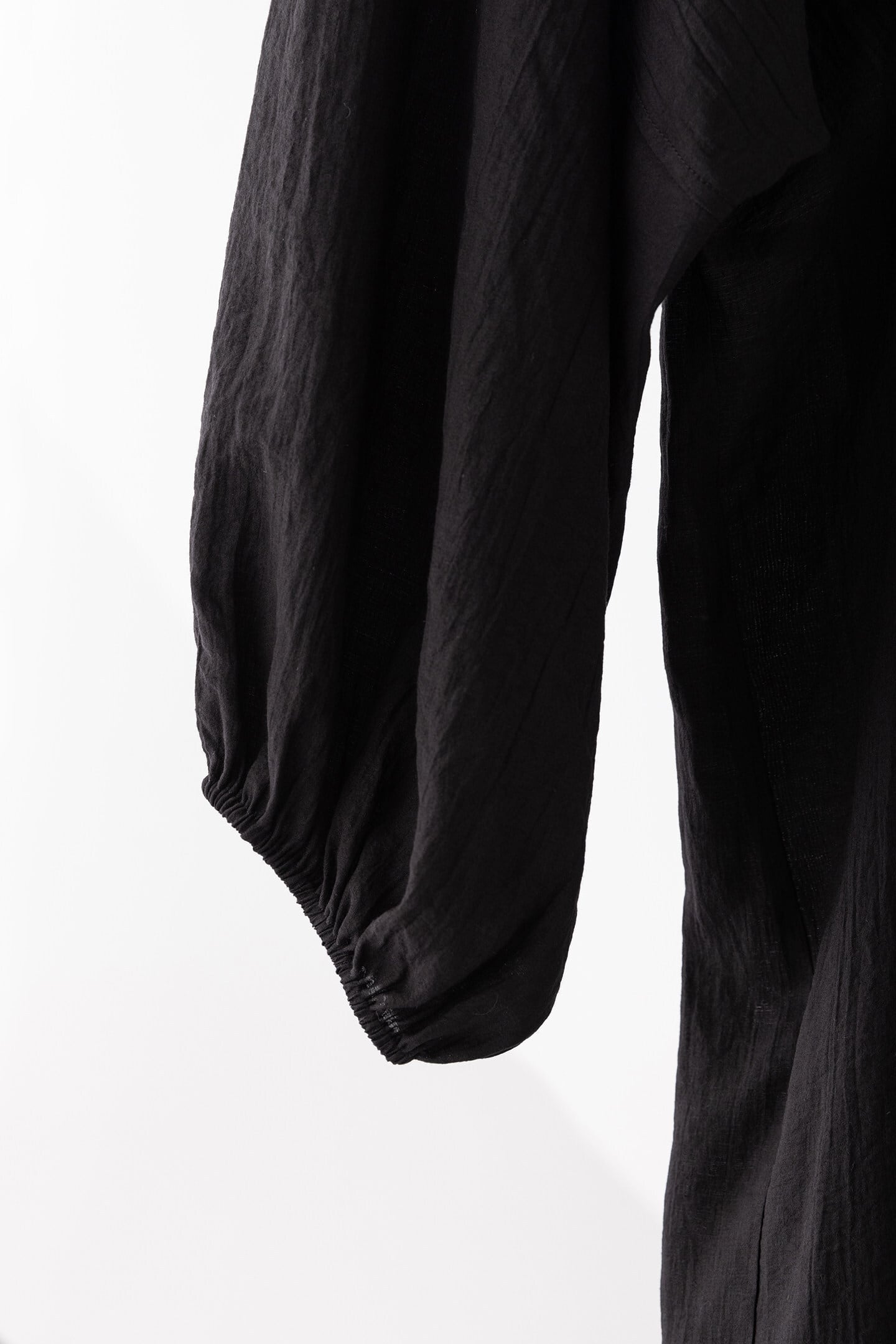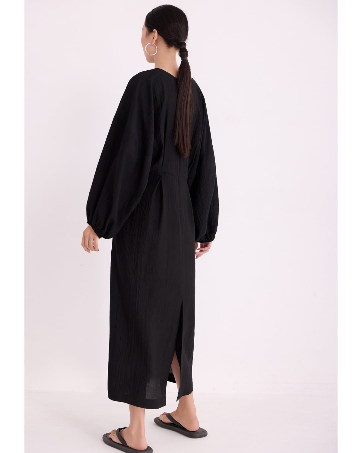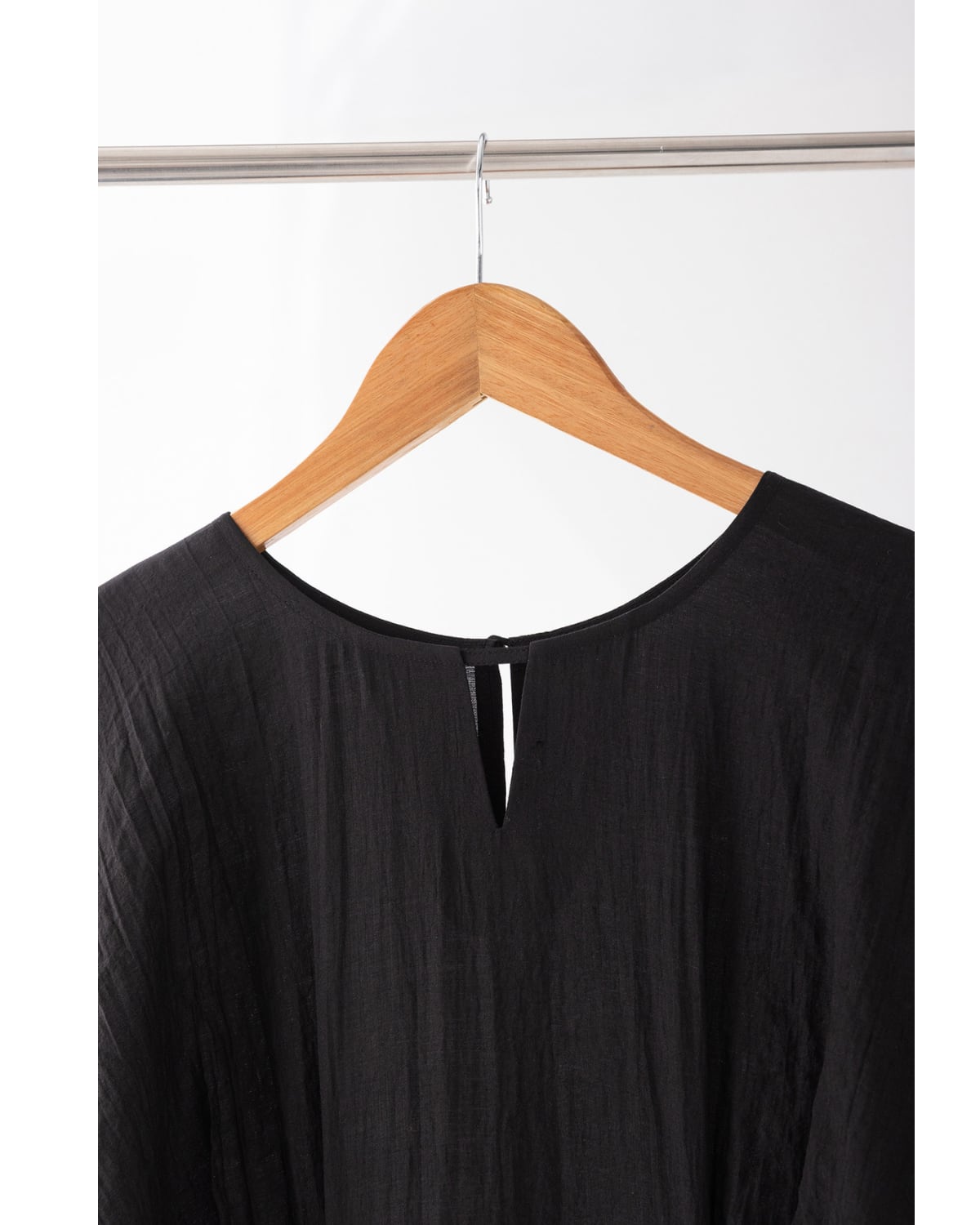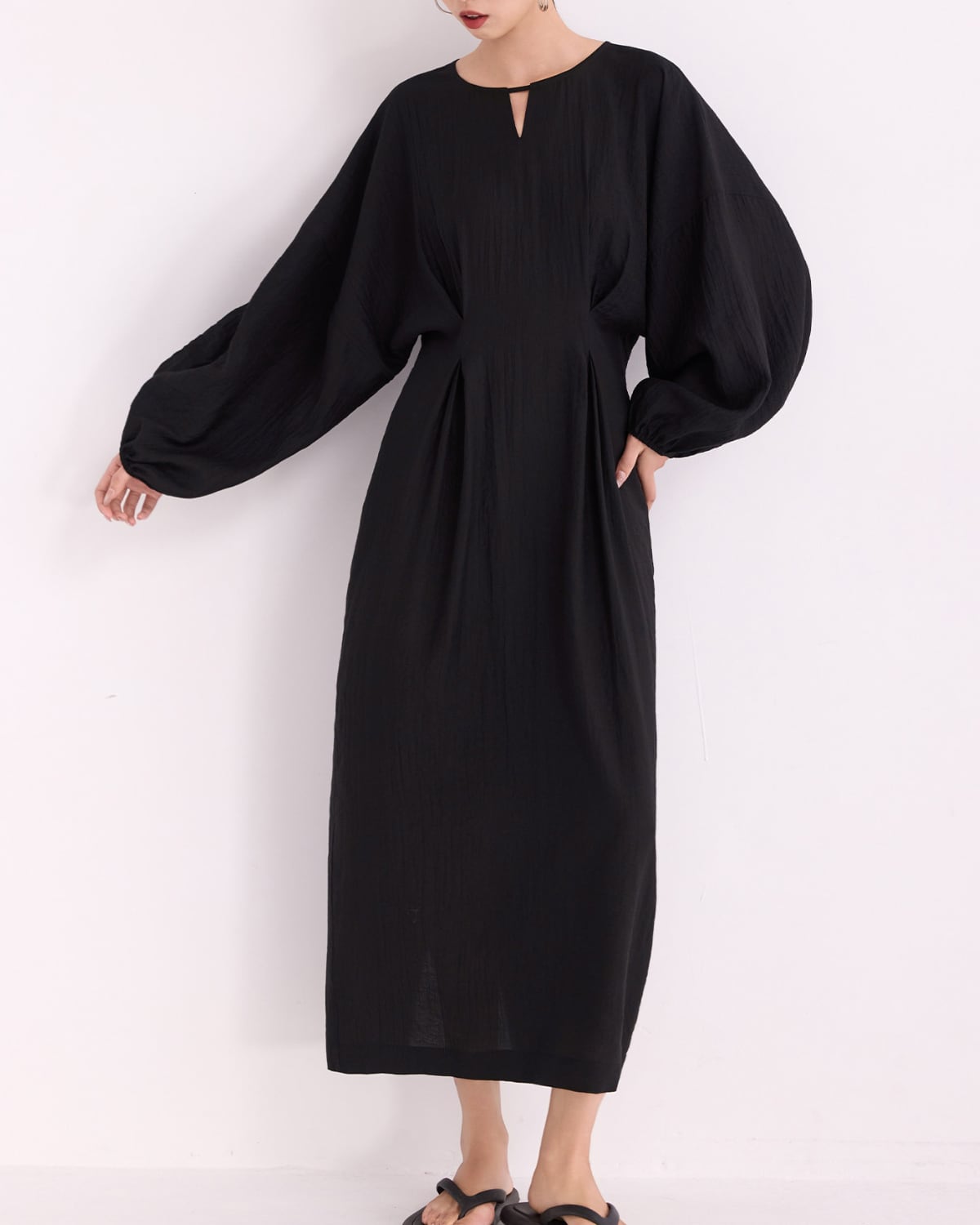 程よいフィット感のあるウエストタックに大きなランタンスリーブが特徴のワンピース。