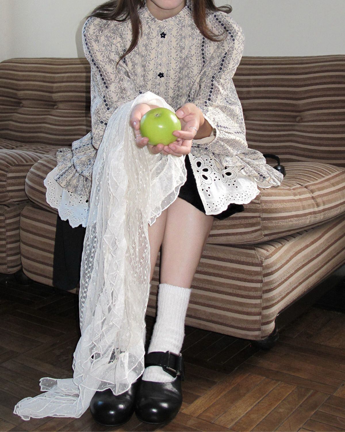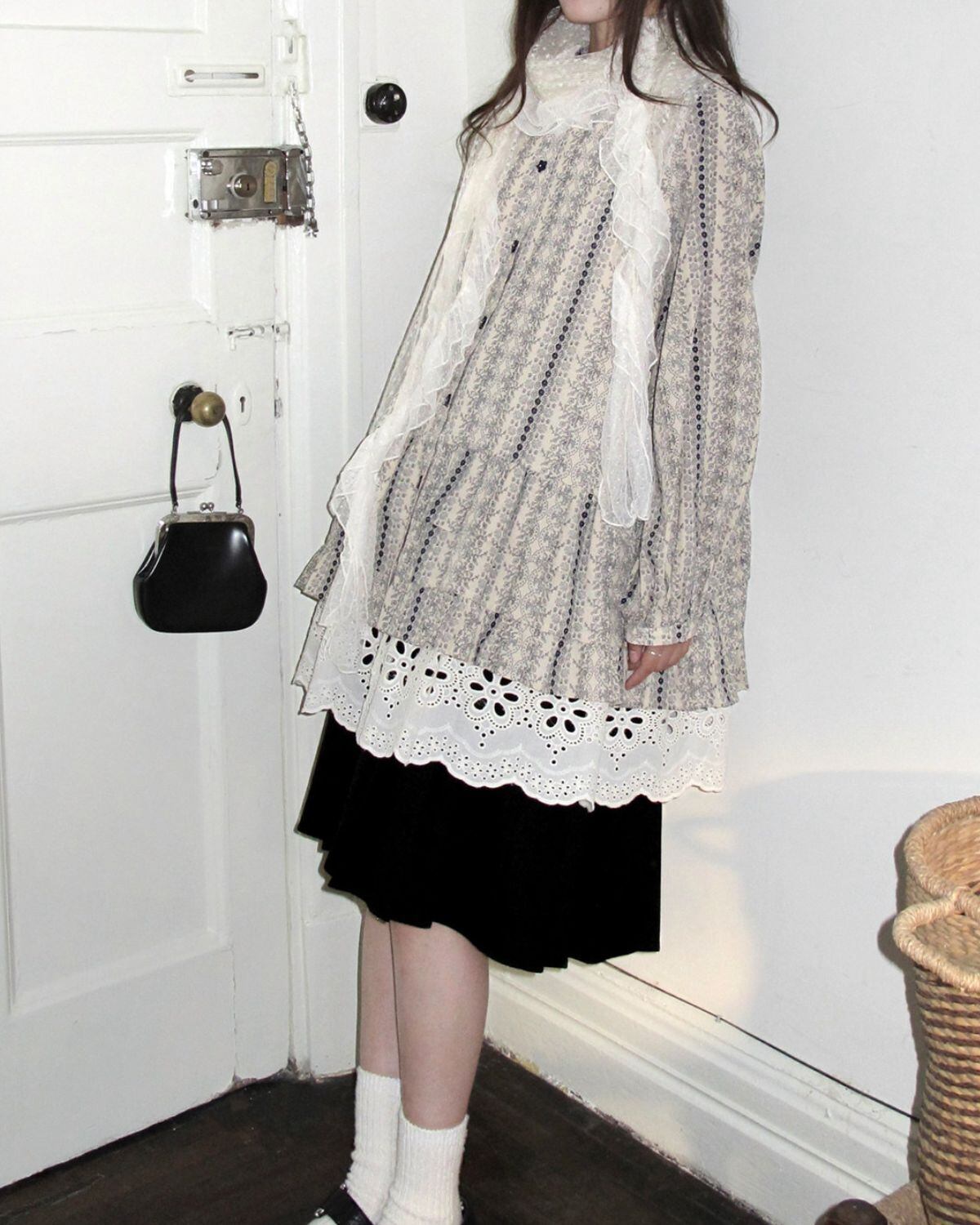 ヴィンテージ風の小花柄とストライプ柄を組み合わせたクラシカルな雰囲気のデザインが特徴です。ラッフルフリルやレースをあしらった、華やかでエレガントになっています。