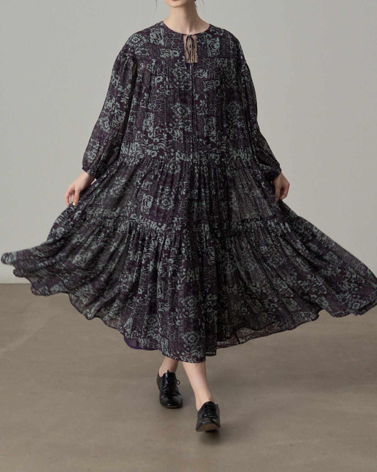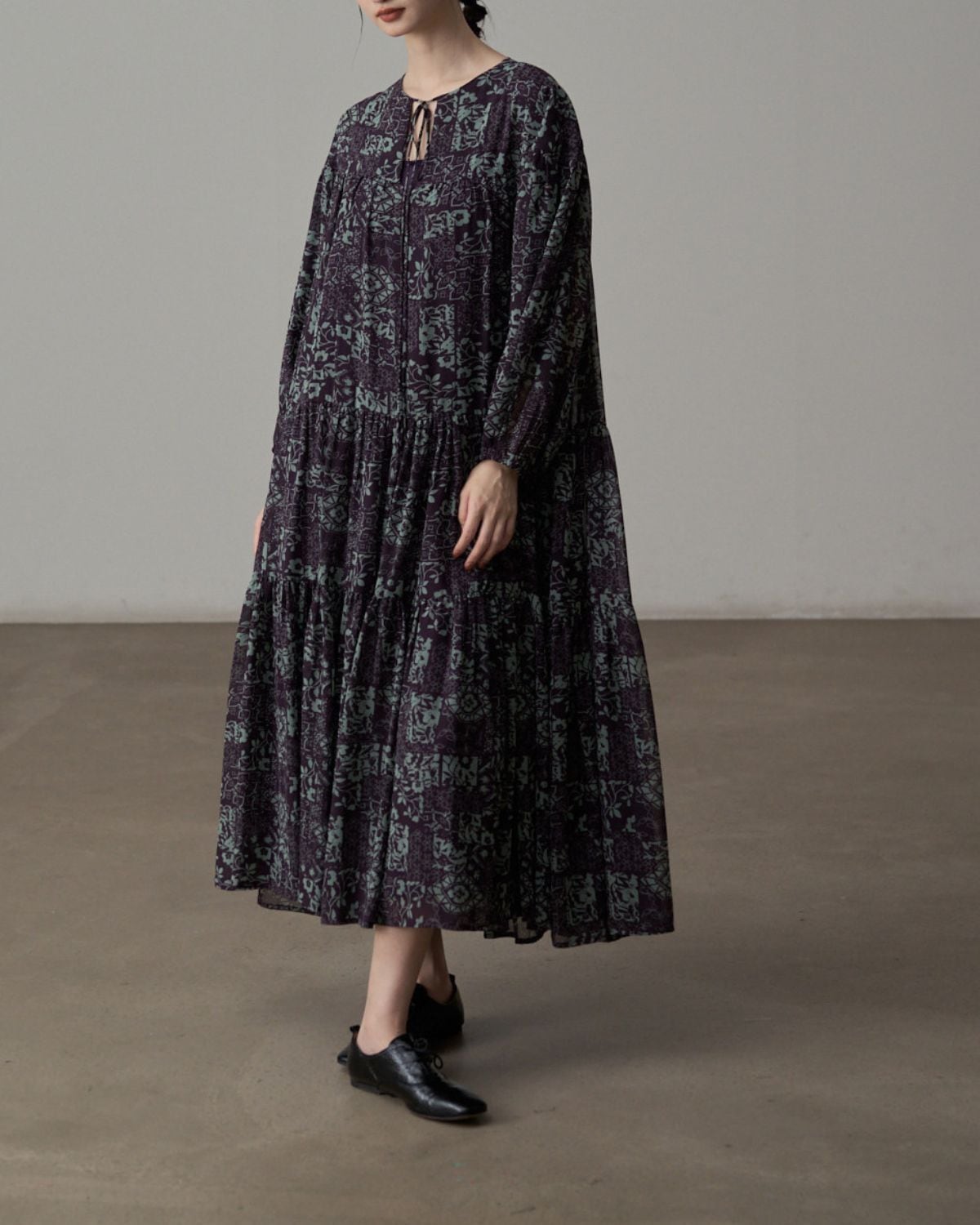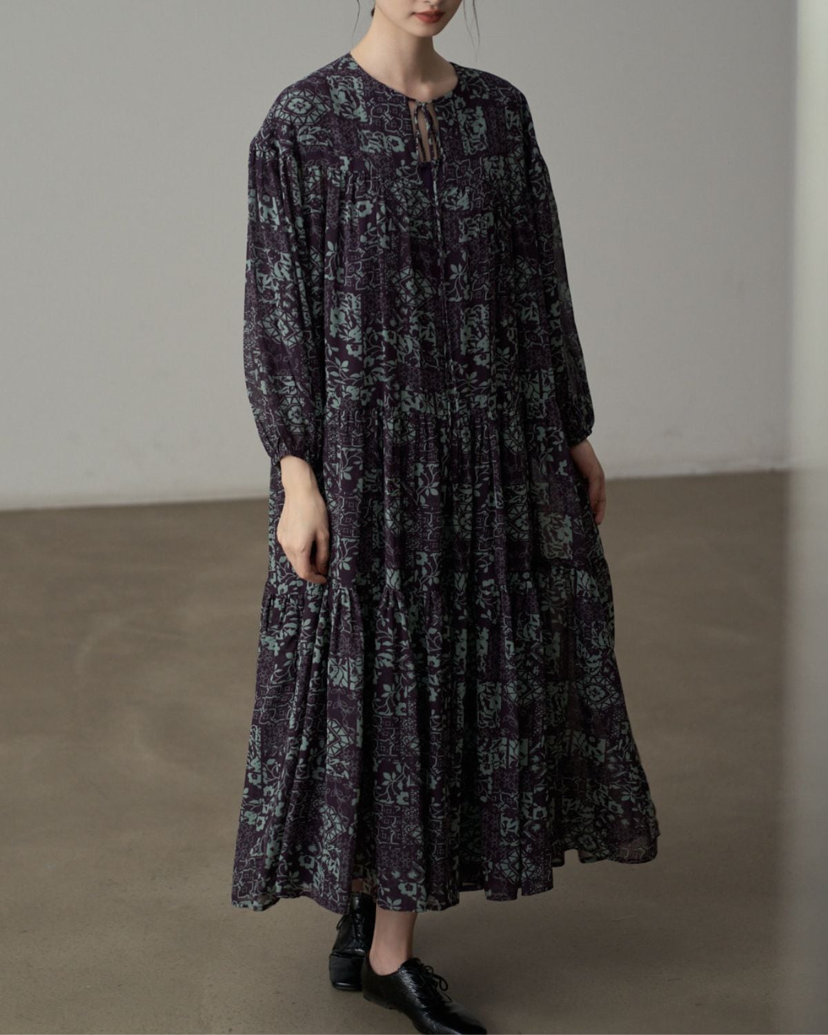 レトロな雰囲気のトーテム柄が特徴の、ゆったりとしたシルエットのワンピースです。