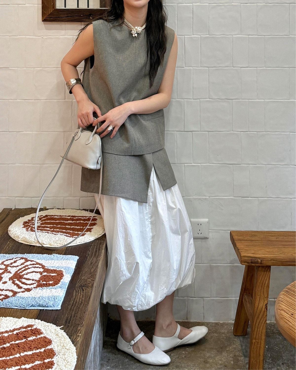 ノースリーブのロングベストと、ボリューム感のある白いバルーンスカートを合わせた、トレンド感のあるレイヤードスタイル風のセットアップです。