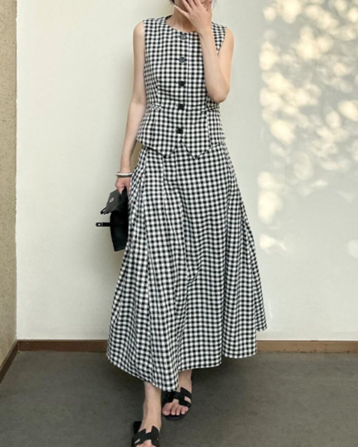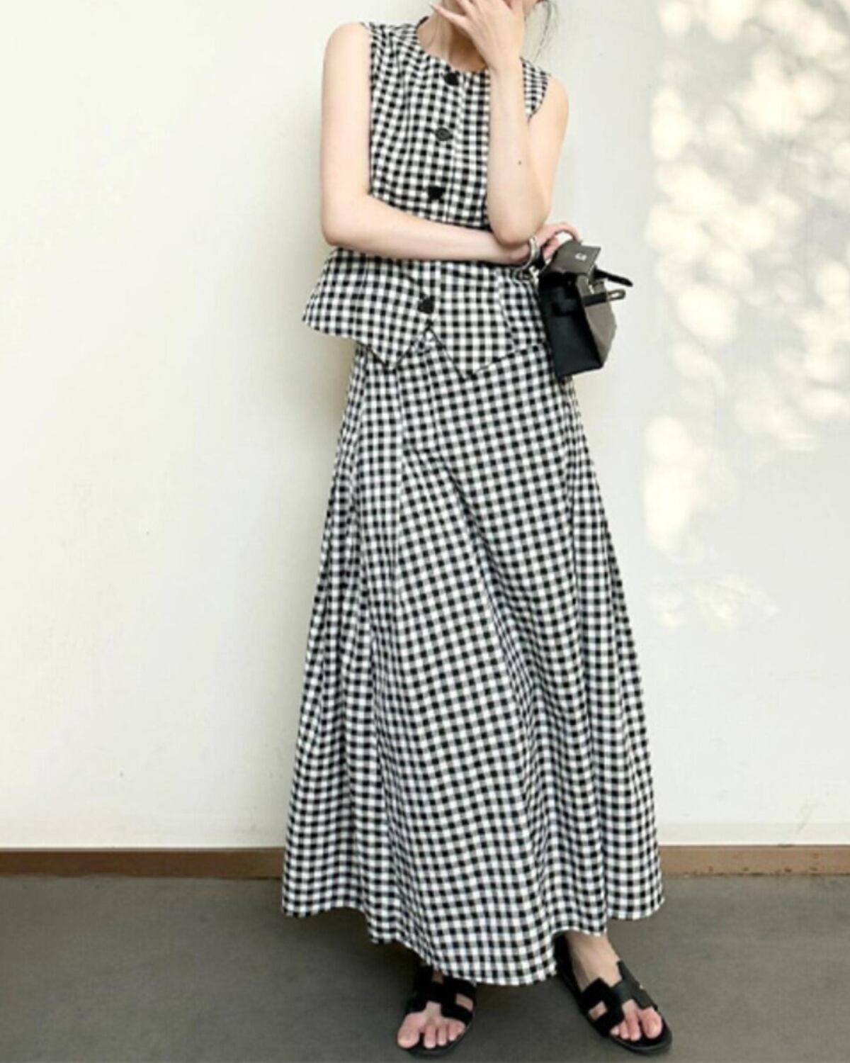 黒と白のギンガムチェック柄のジレ(ベスト)とお揃いのロングスカートを組み合わせたスタイリッシュなセットアップです。ボタン付きのノースリーブジレで、V字型の裾がウエストラインを美しく見せています。