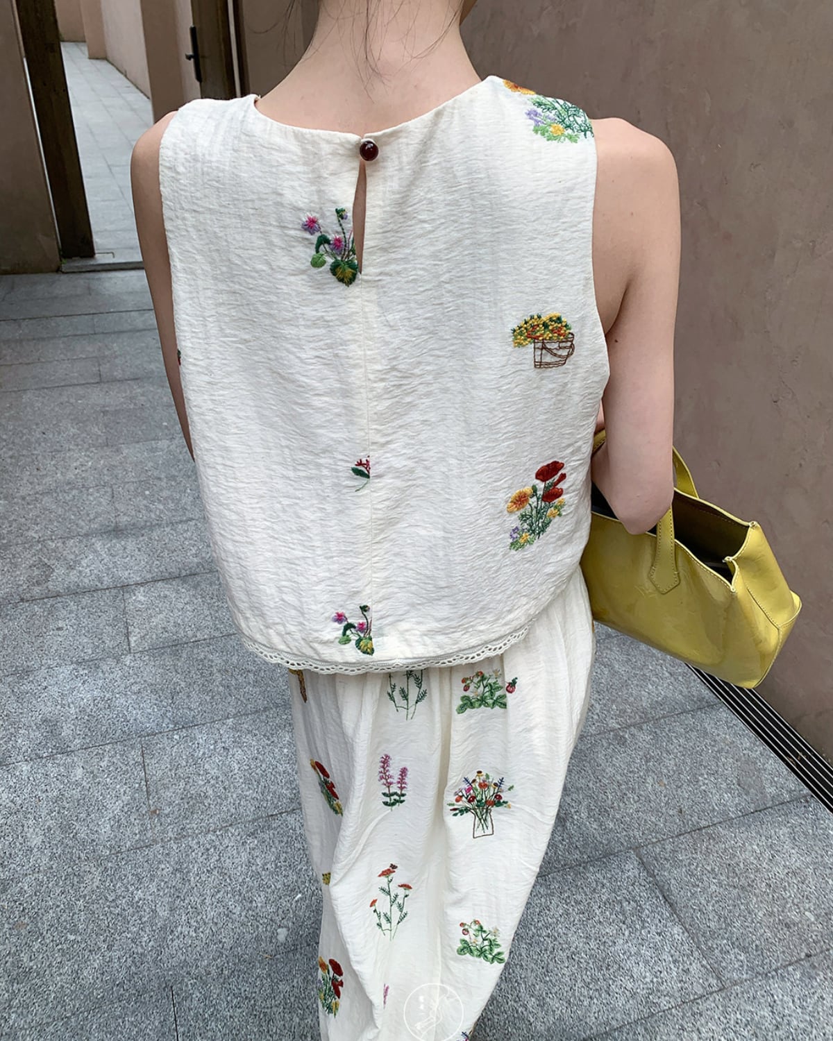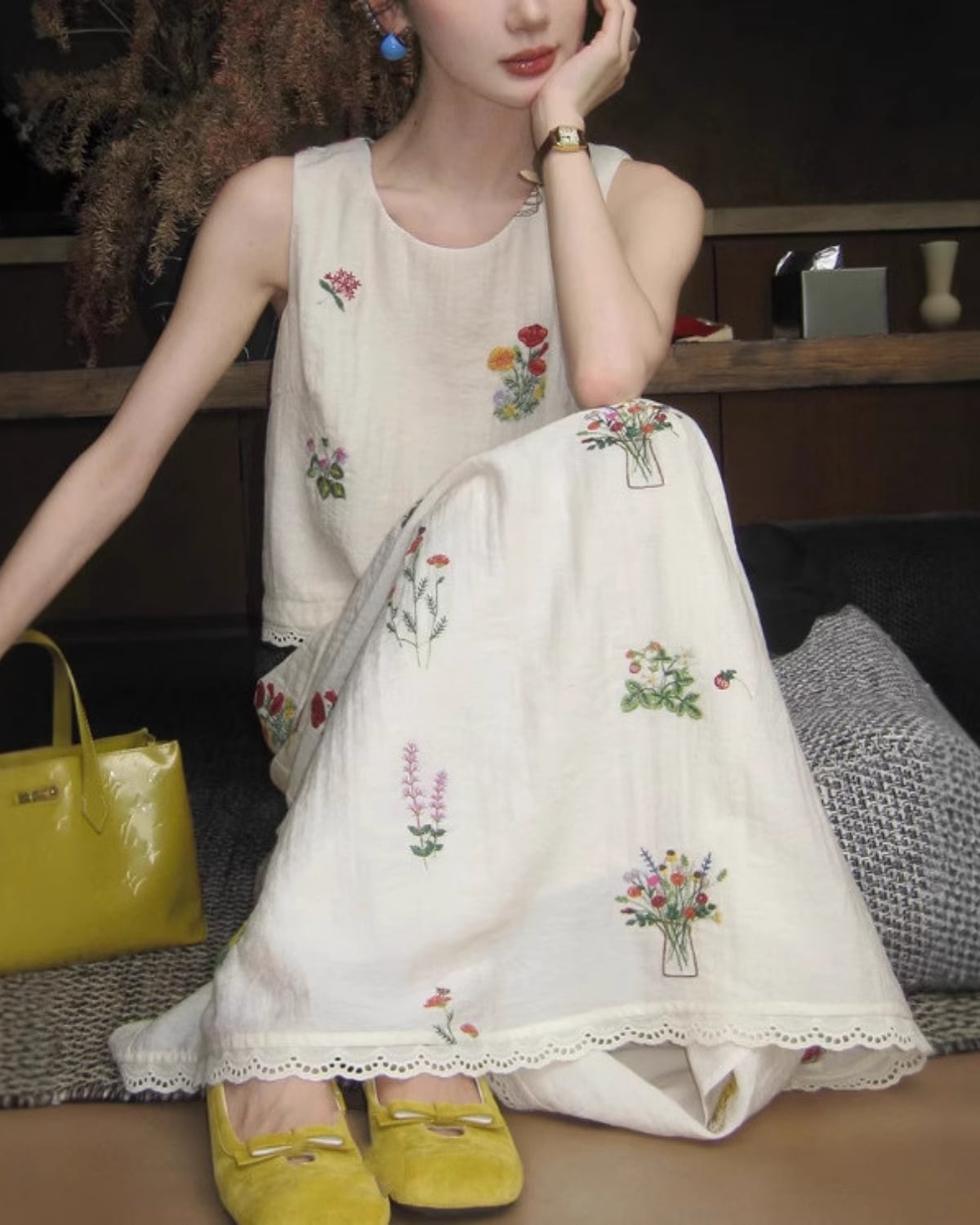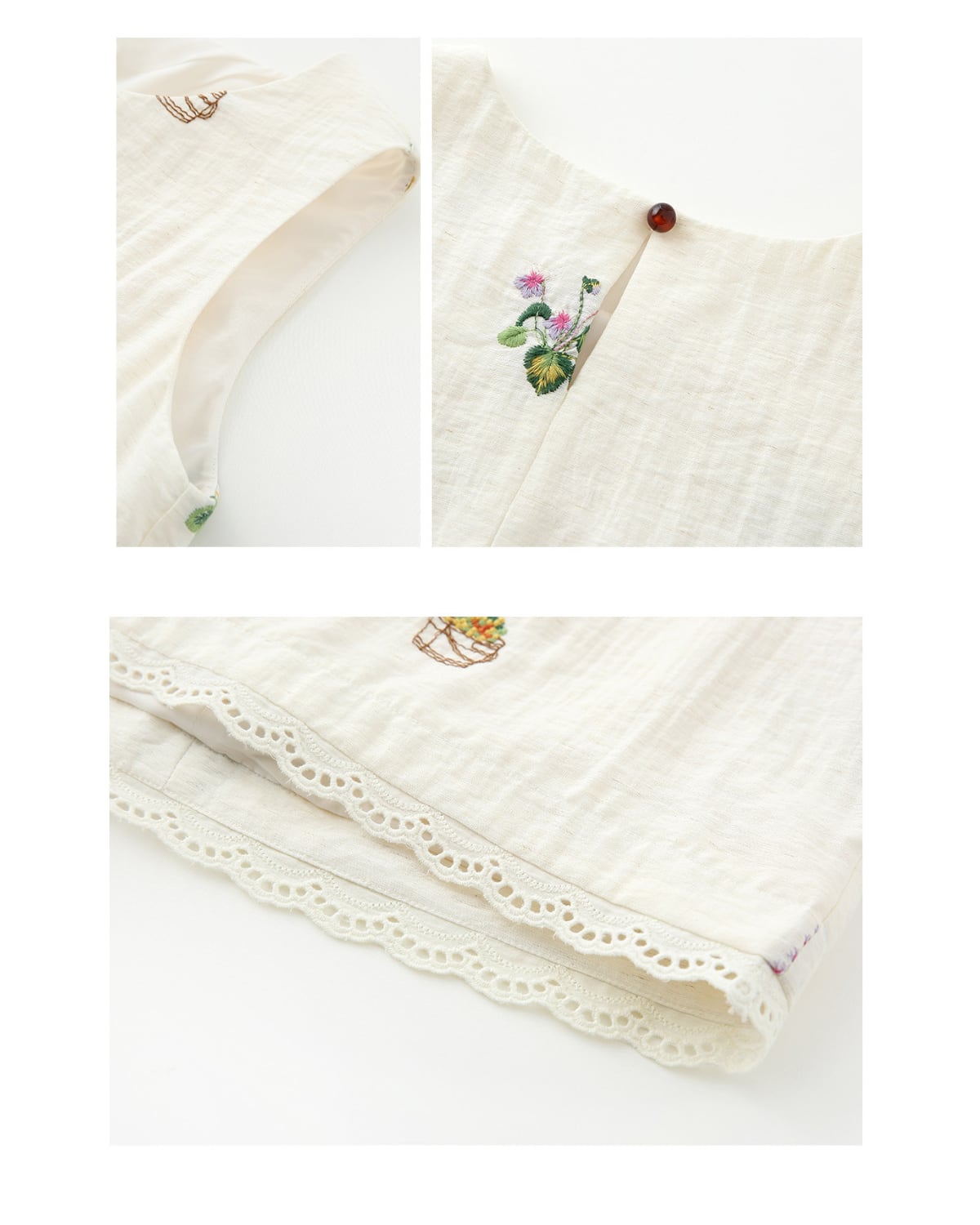 柔らかなリネン素材を使用したフレンチ刺繍のセットアップ。