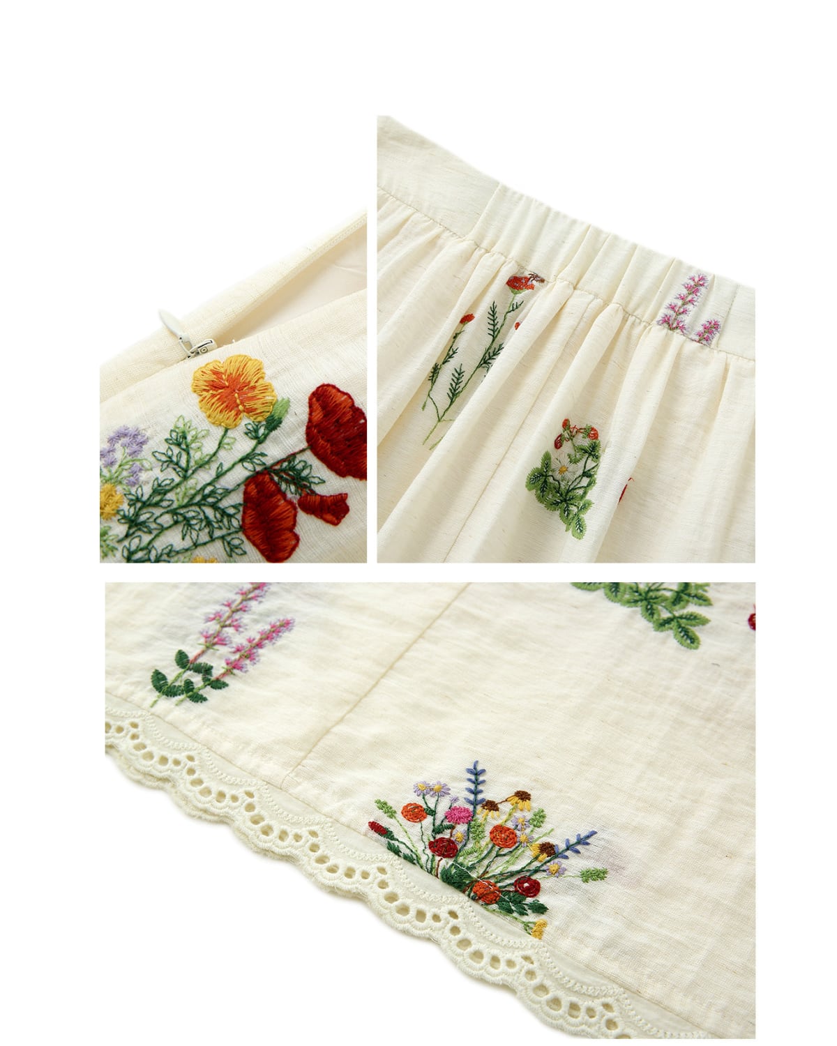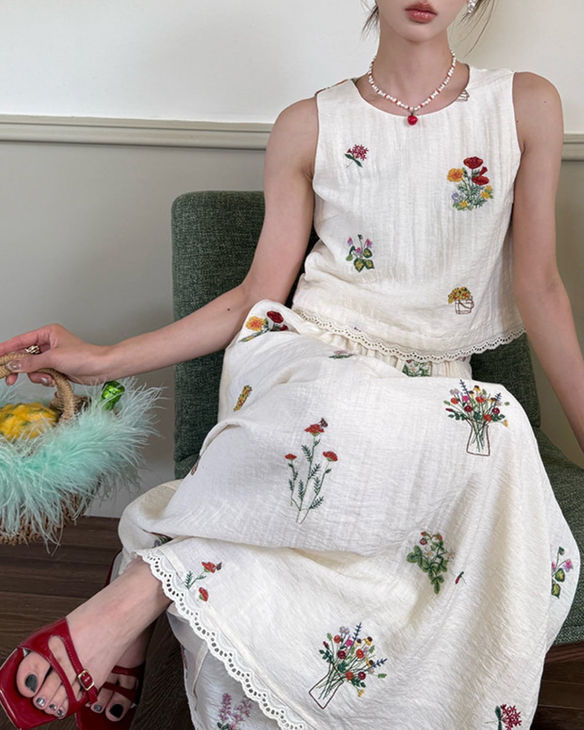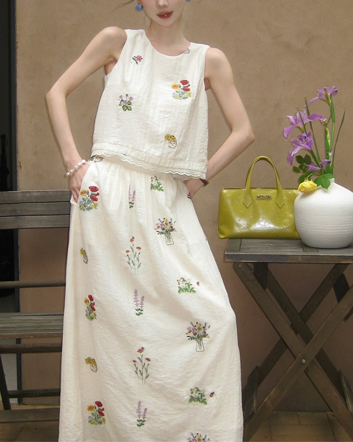リネンフレンチフラワー刺繍のトップス&スカートセットアップ